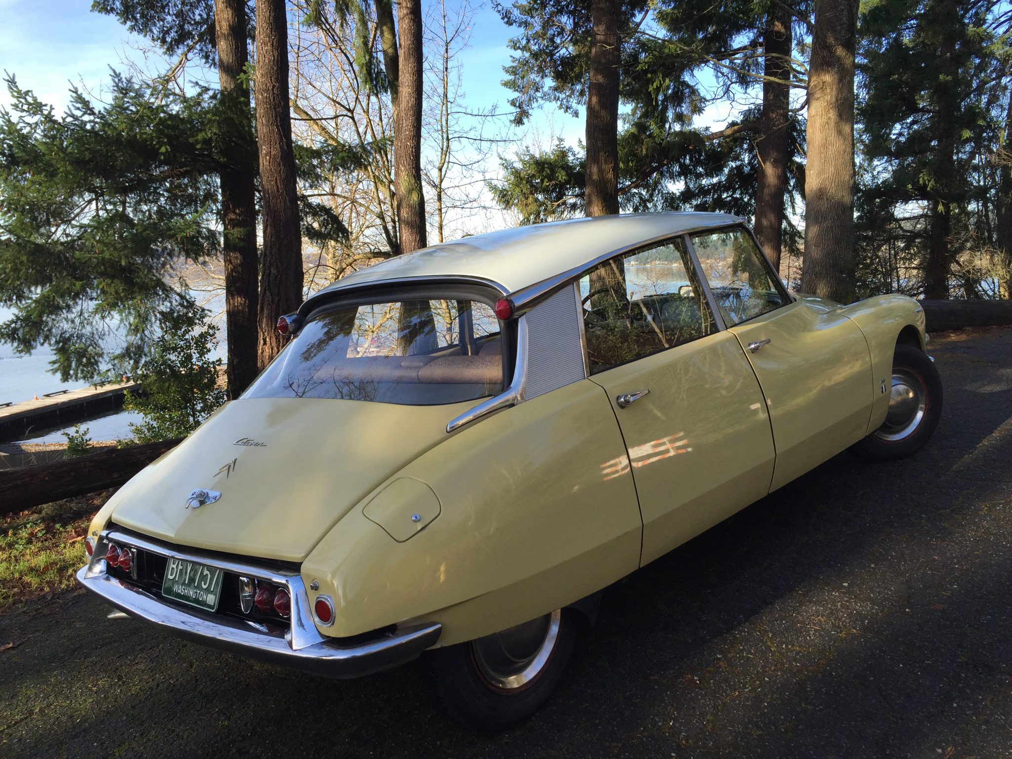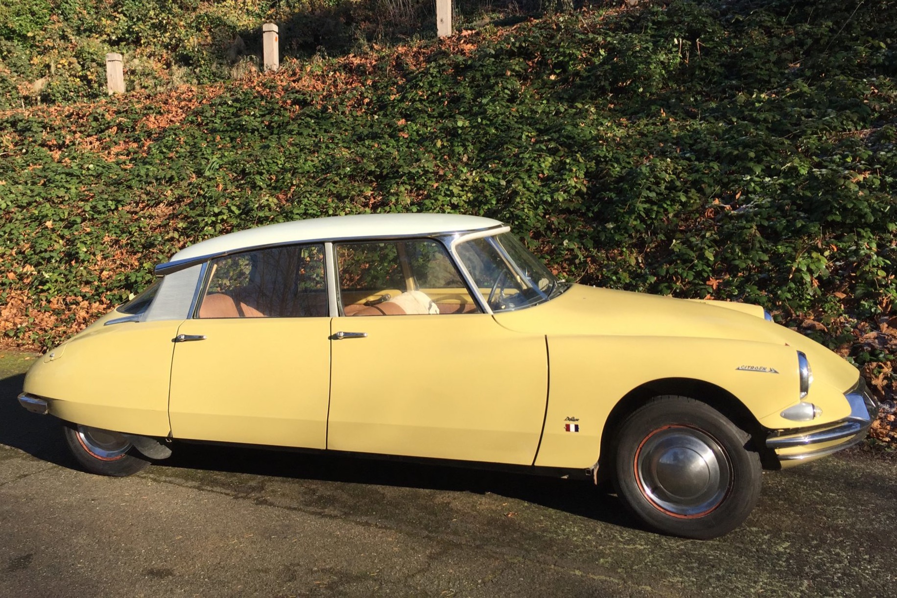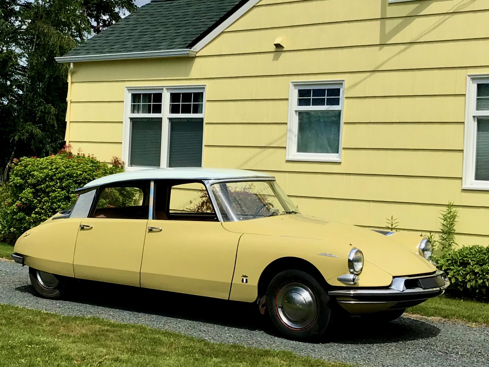 The DS rode on a 123″ wheelbase and featured a rear track 8″ narrower than the front. Single-bolt steel wheels are finished in Rouille and wear chrome covers and Michelin X radial tires that were installed under the seller’s ownership, sized 165x400mm all around. A matching spare with older Michelin rubber is mounted ahead of the engine along with a factory tool kit. Standard features include hydropneumatic suspension with automatic leveling and variable ground clearance, power steering, and hydraulically-assisted, inboard-mounted front disc brakes that were fitted with new pads. Additional service included replacement of the hydropneumatic sphere diaphragms as well as a hydraulic pump rebuild.