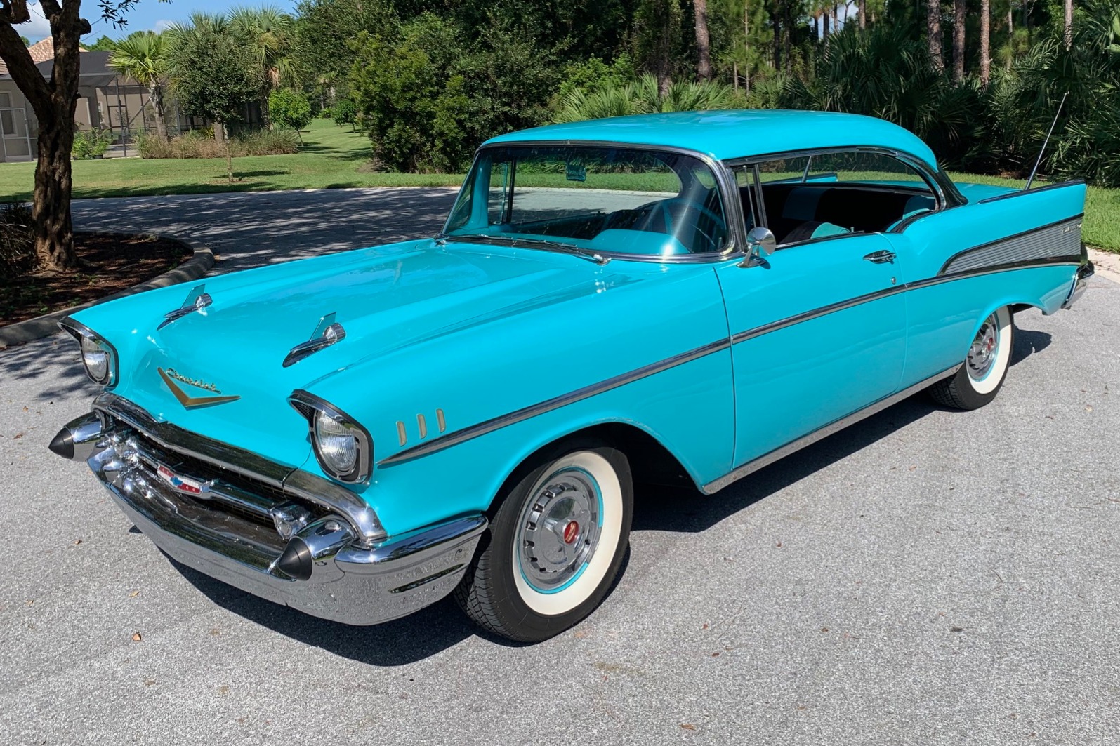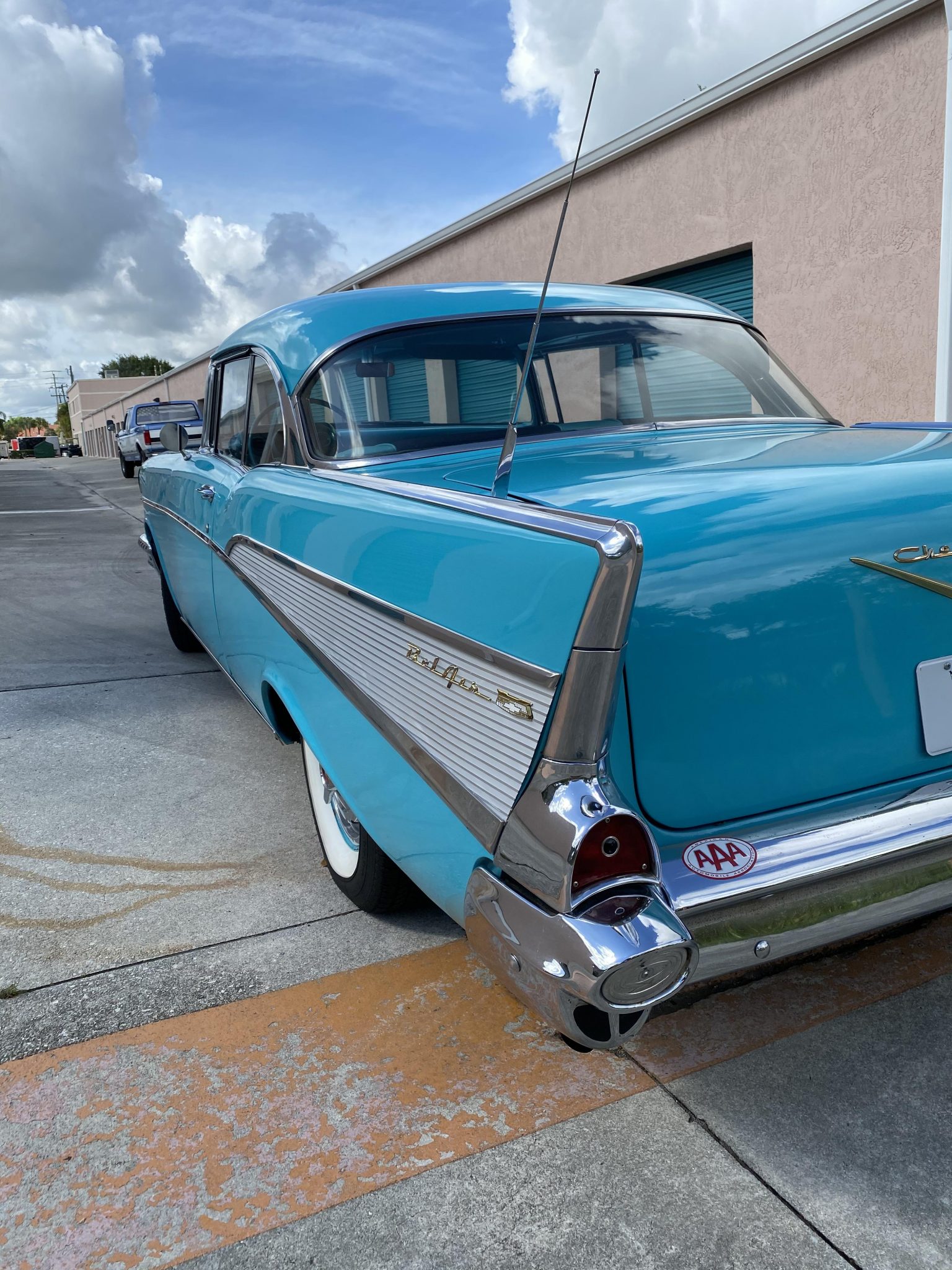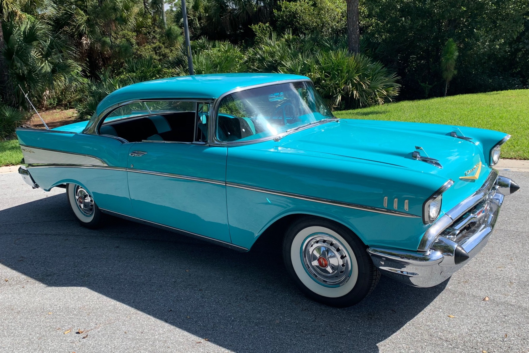 The seats are trimmed in teal vinyl with black cloth inserts, which are matched by the door and side panels. Darker carpets are protected by vinyl mats. Amenities include wing windows, a retro-style digital stereo, a heater, and a clock mounted above the glovebox, though the latter is inoperable.