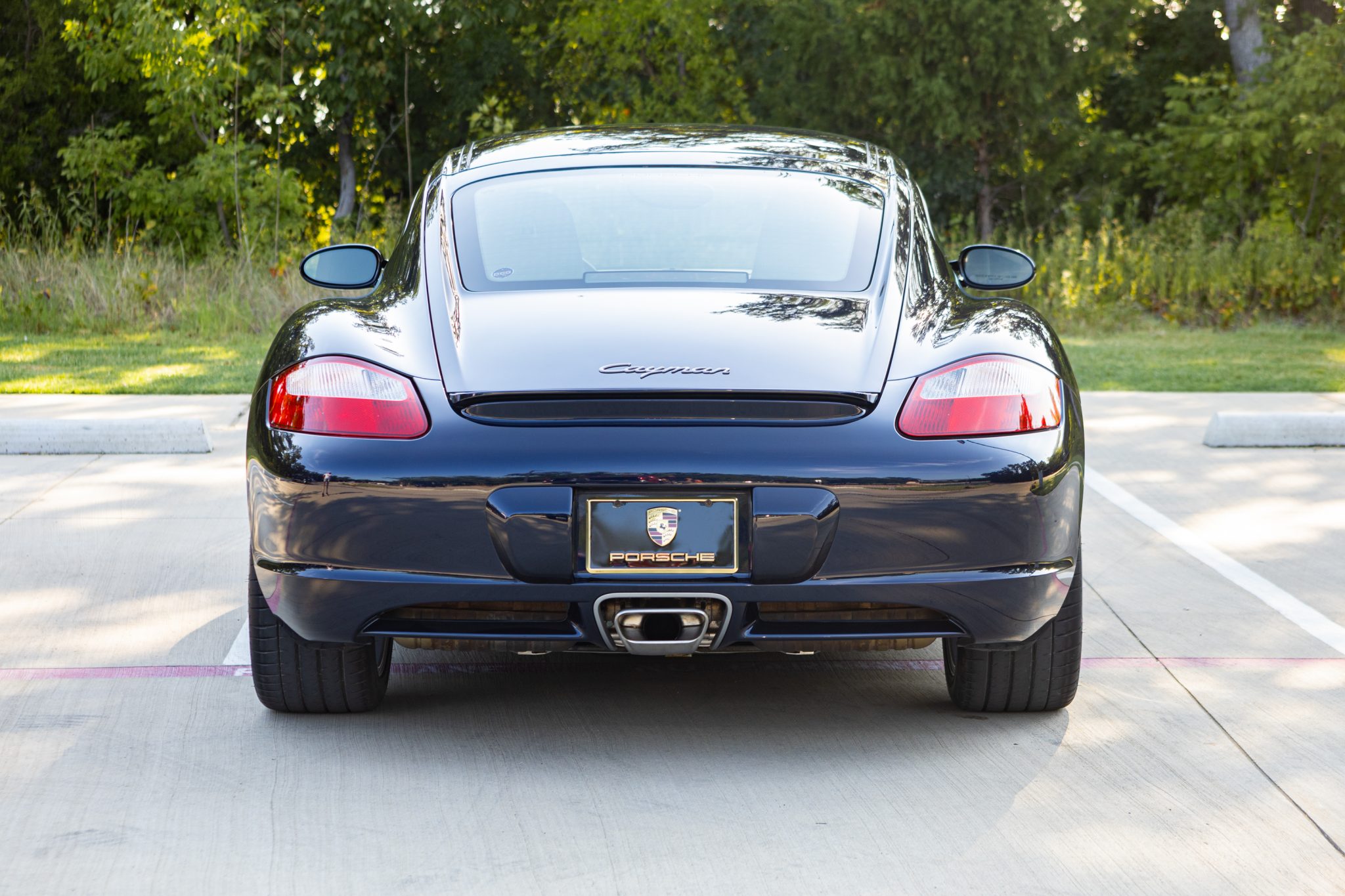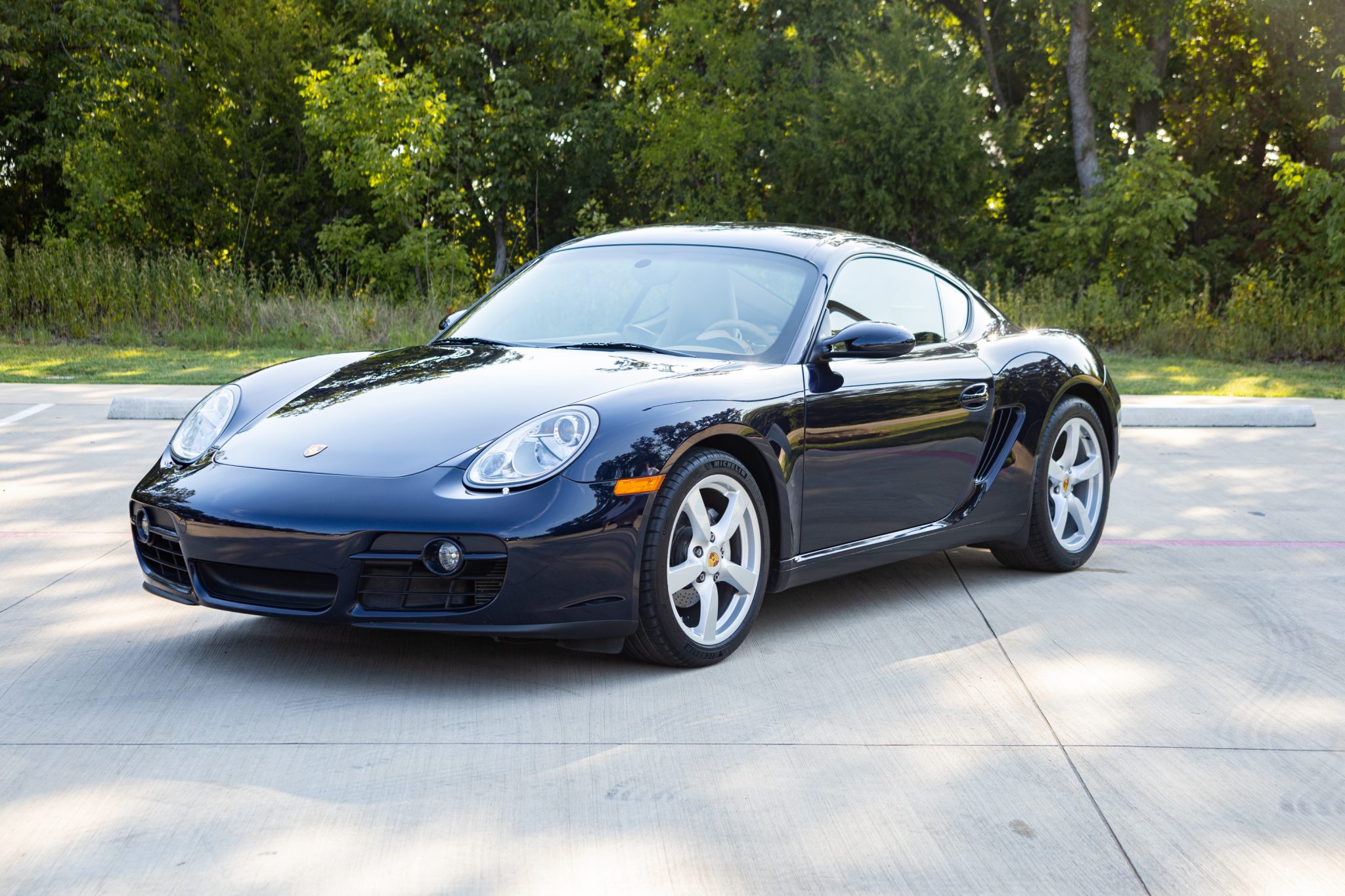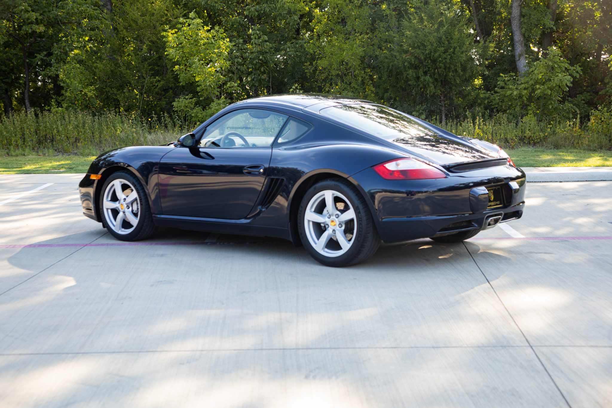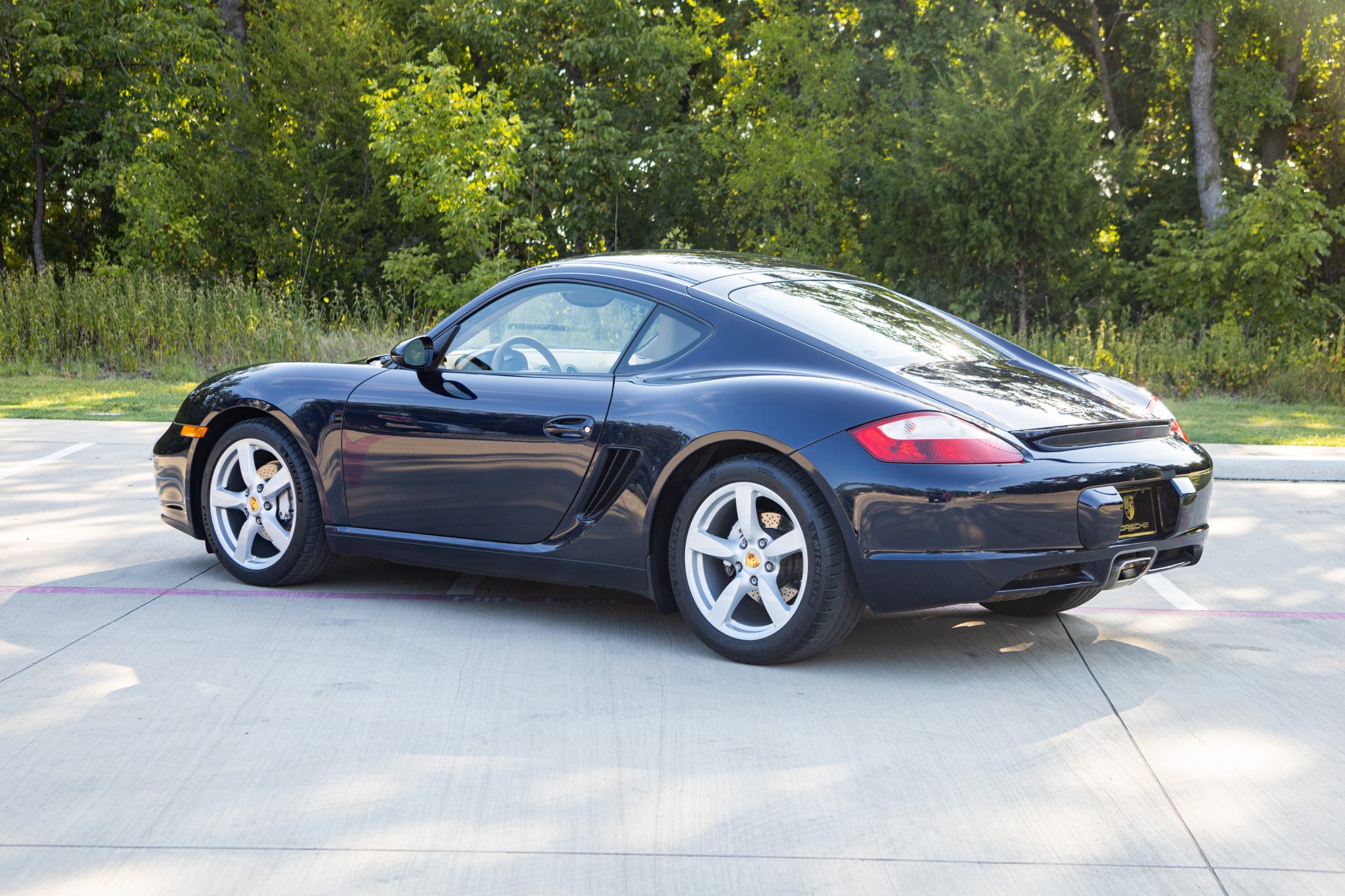 Optional 18″ Cayman S wheels wear colored Porsche crest center caps along with 235/40 and 265/40 Michelin Pilot Sport 4 S tires that were mounted in preparation for the sale. Braking is handled by four-piston calipers fitted over cross-drilled rotors, and the car is equipped with Porsche Stability Management (PSM) and Anti-Slip Regulation (ASR).