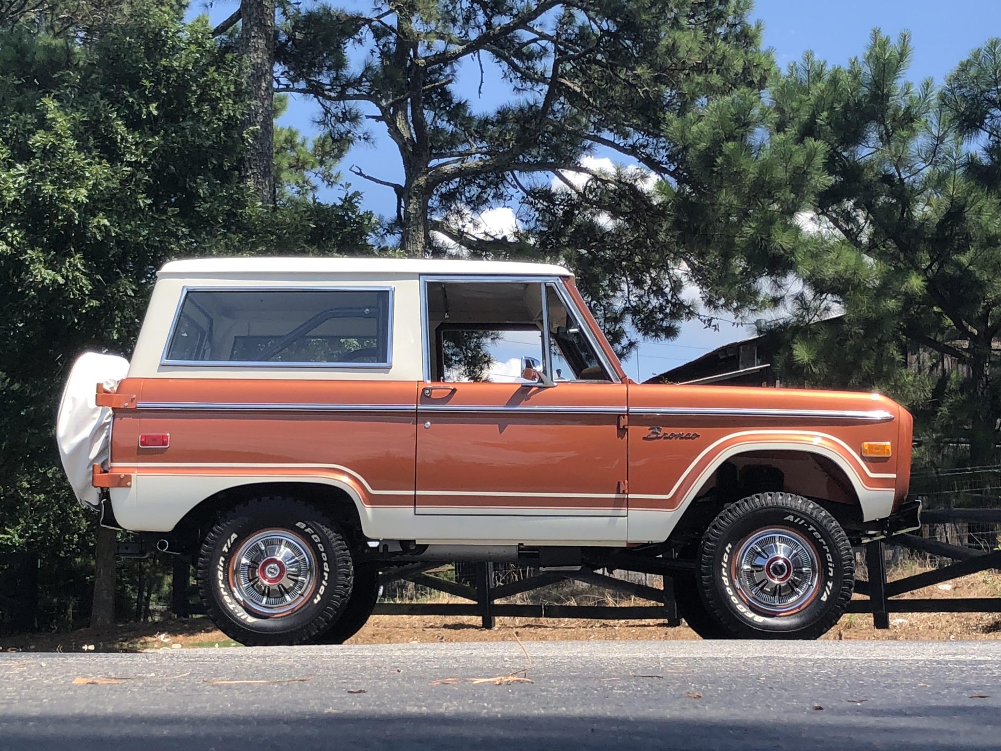 Body-color 15″ steel wheels with polished covers wear BFGoodrich All-Terrain T/A tires at all four corners. Factory equipment includes locking front hubs and power steering, while power-assisted brakes and a 2.5″ suspension lift kit have been added. A full-size spare is mounted on a swing-out carrier affixed to the rear tail gate.