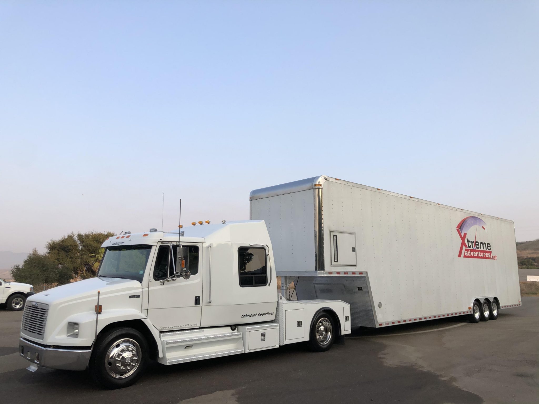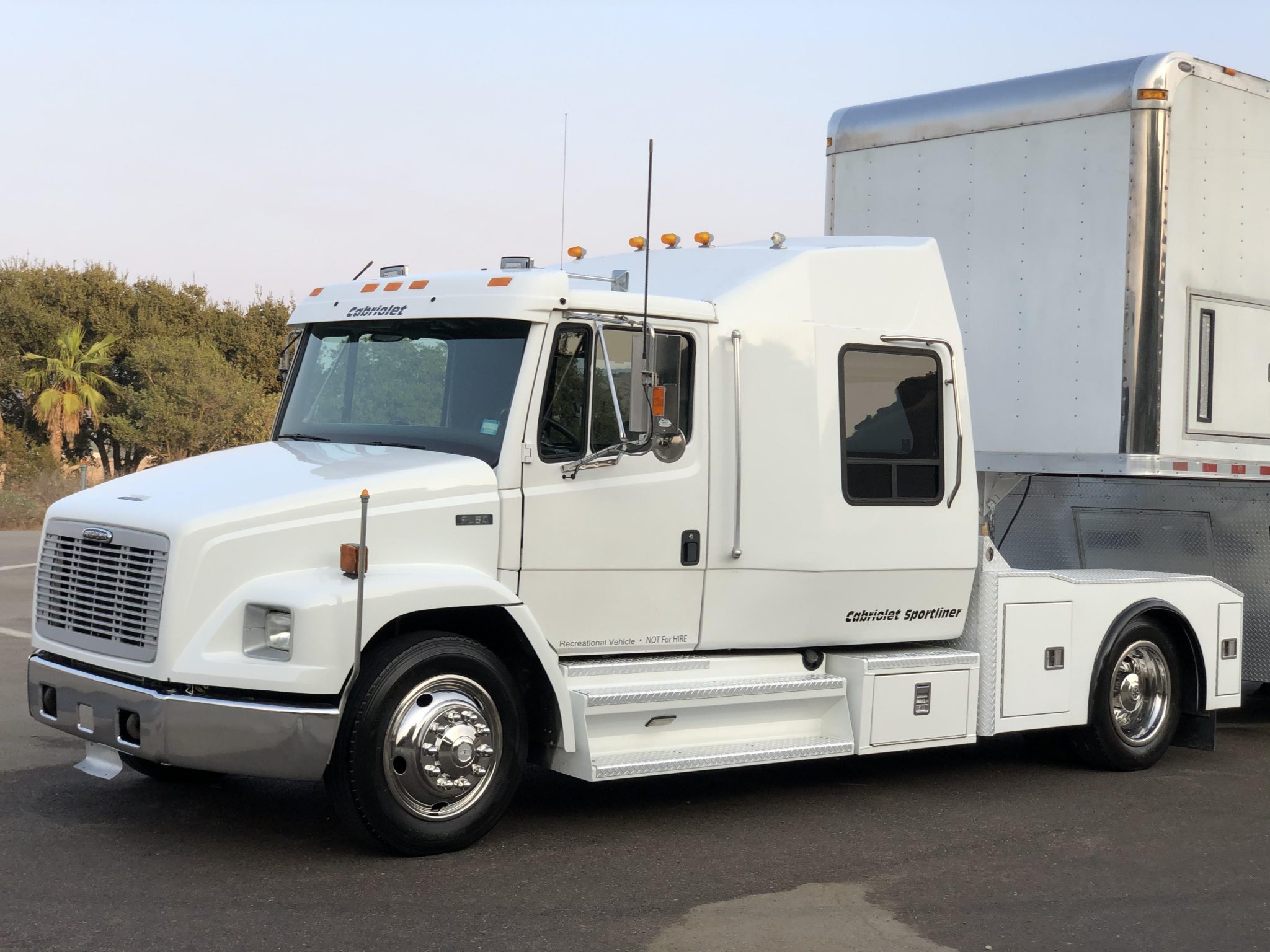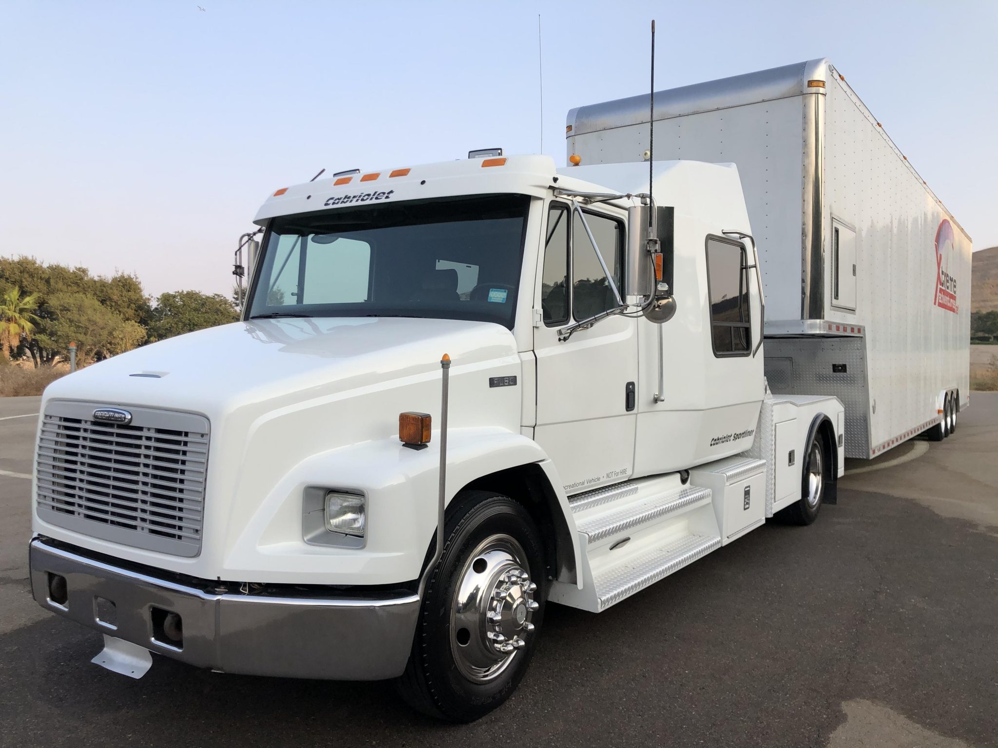 The Western-style bed is equipped with diamond-plate aluminum trim on the floor and rear bumper, along with dual aluminum belly cabinets with insulated doors. The 22.5” chrome wheels are wrapped in Yokohama RY023 tires sized 255/70. Towing equipment includes a gooseneck coupling and a rear-mounted receiver hitch, and the truck is equipped with air brakes. Recent maintenance reported by the seller included a brake service with the installation of a replacement PAC brake and front rotors.