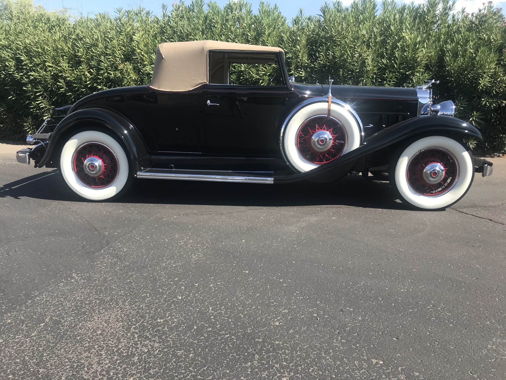 Red-painted wire wheels wear 6.50-19 Lester wide-whitewall bias-ply tires, including the dual side-mount spares. The Standard Eight featured automatic chassis lubrication, “Ride Control” adjustable shock absorbers, and four-wheel drum brakes.