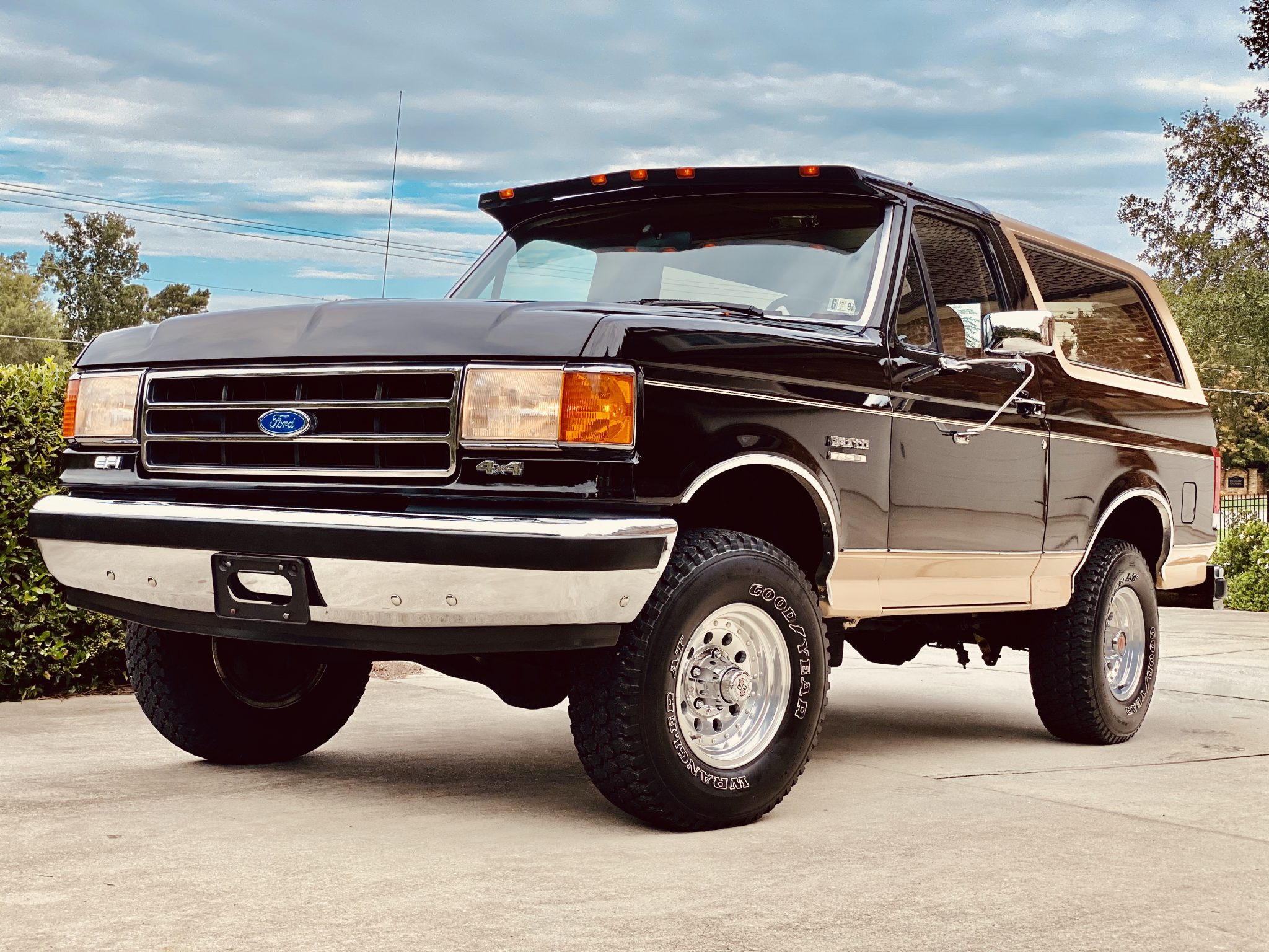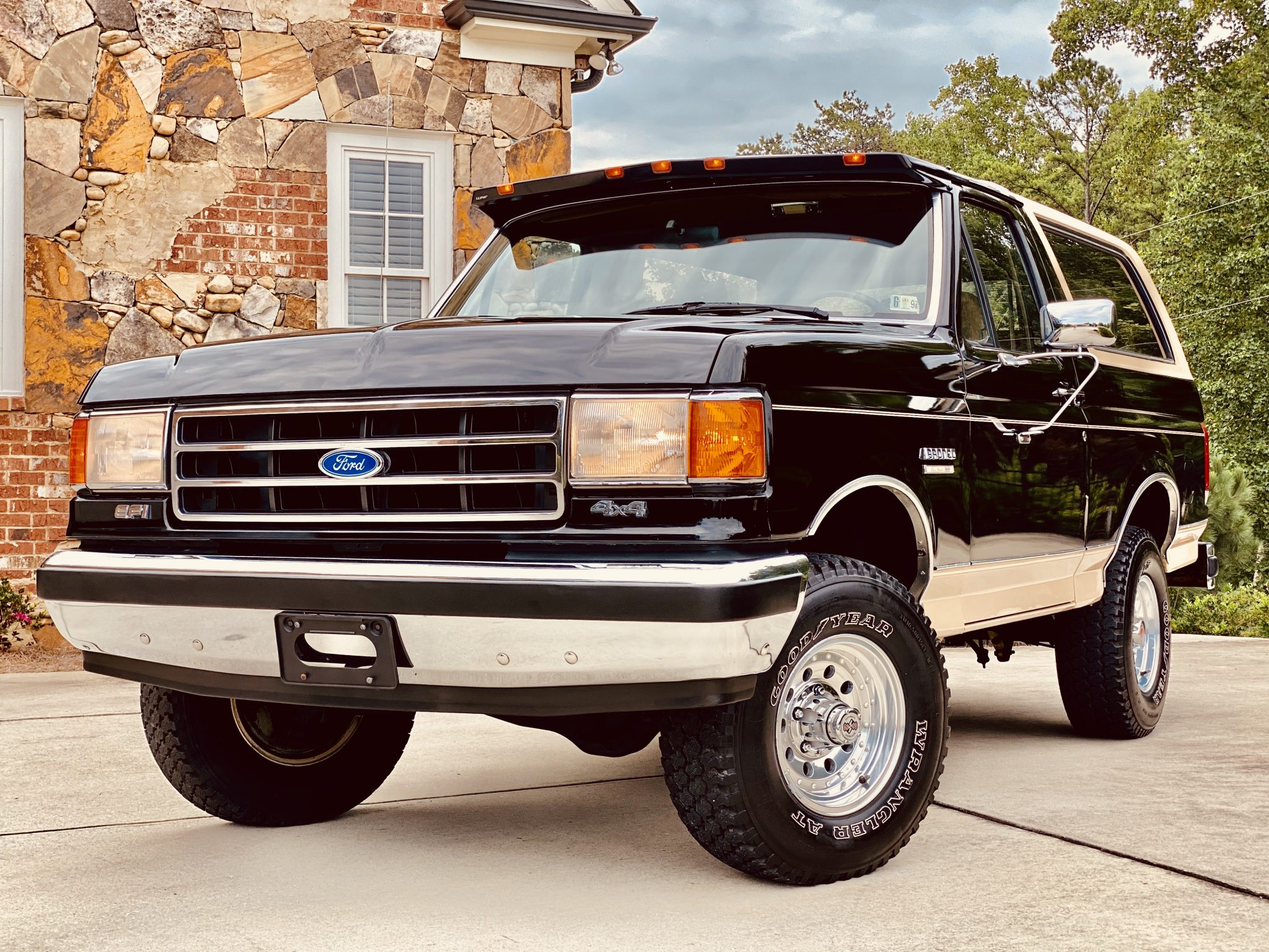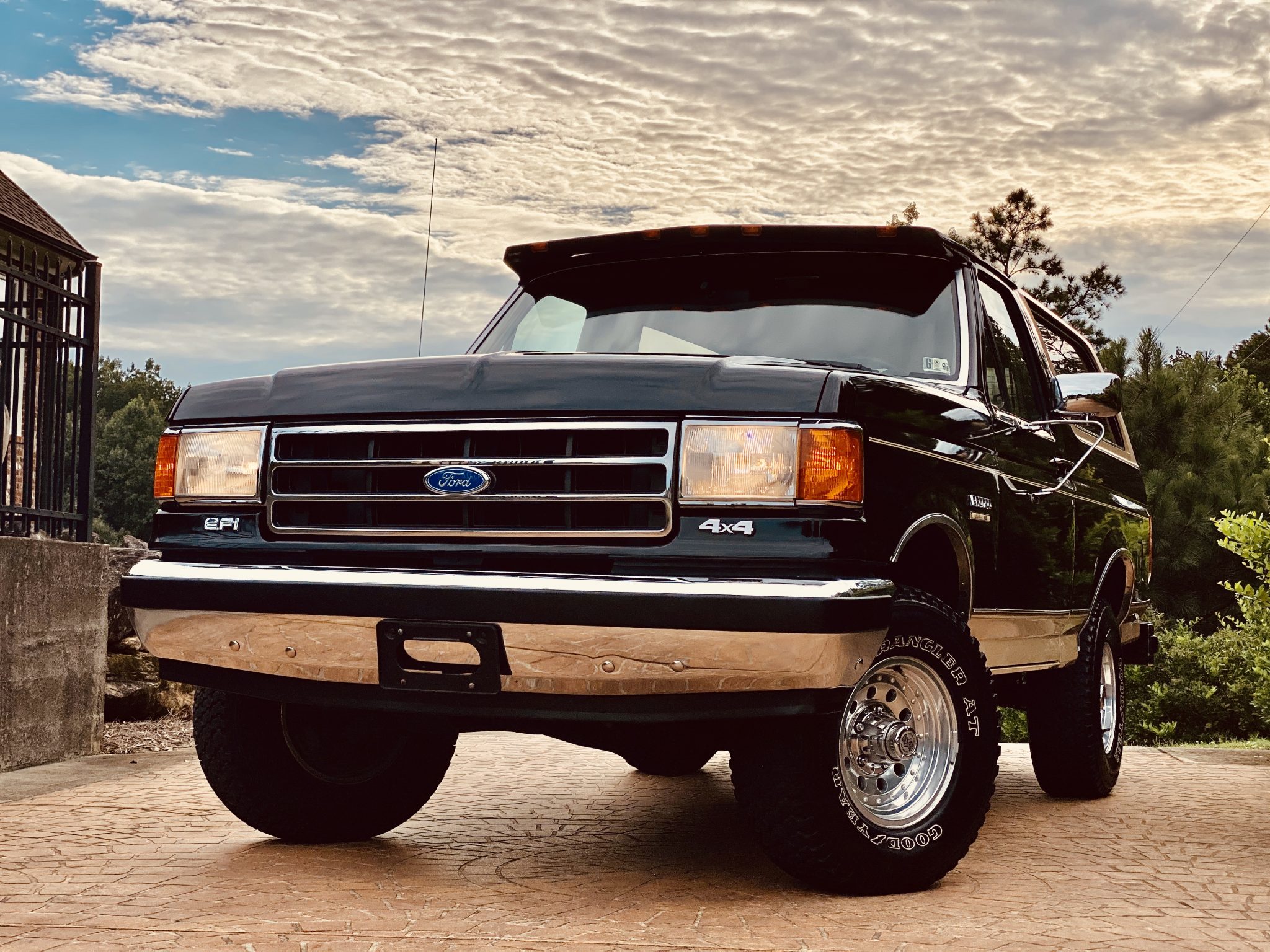 Factory forged aluminum 15″ wheels are mounted over manually-locking front hubs and wear Goodyear Wrangler A/T tires at all four corners. A brake fluid flush was performed in preparation for the sale. A full-size spare wearing a Ford Bronco-branded cover is mounted on a swing-out carrier at the rear.