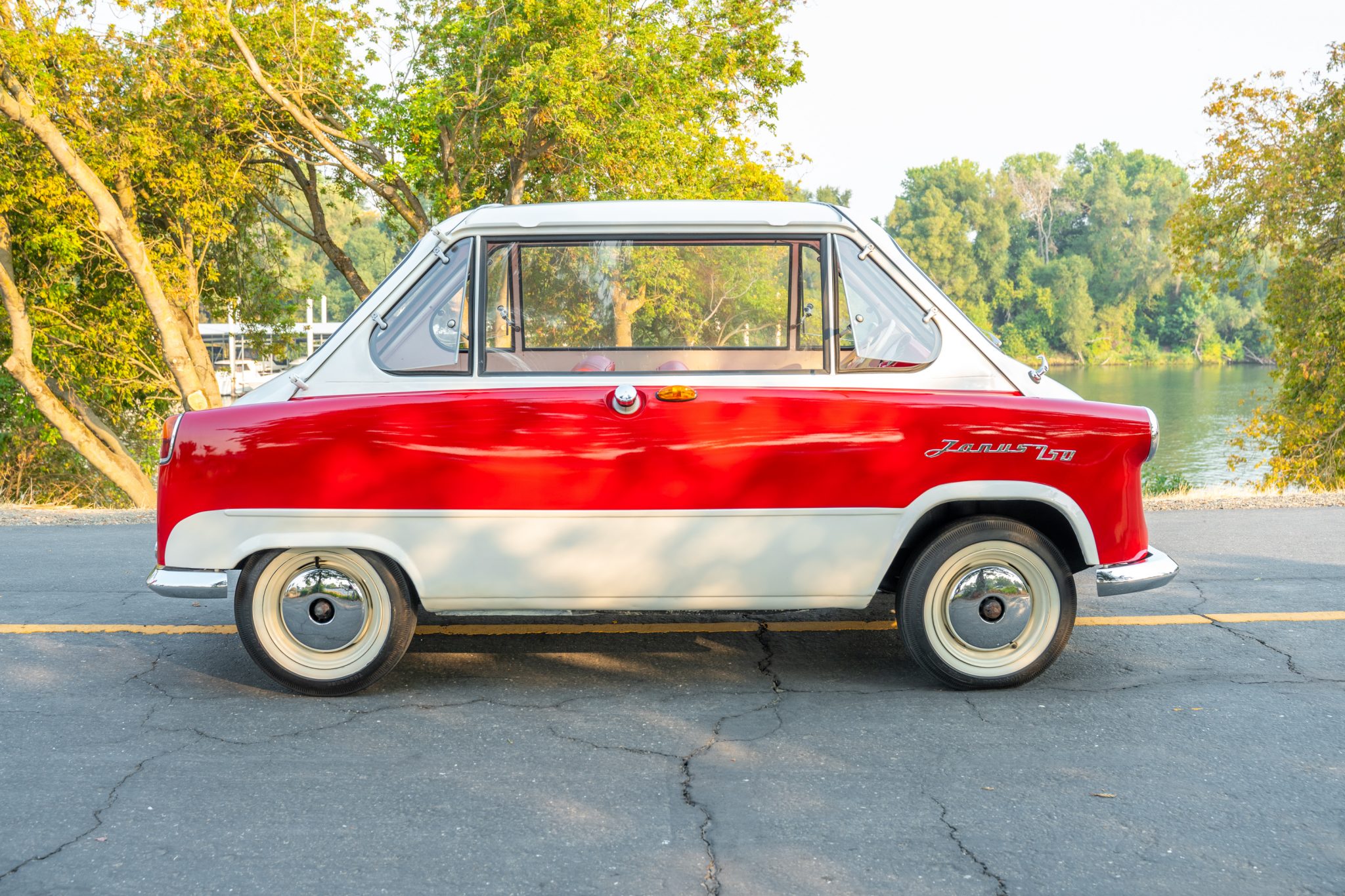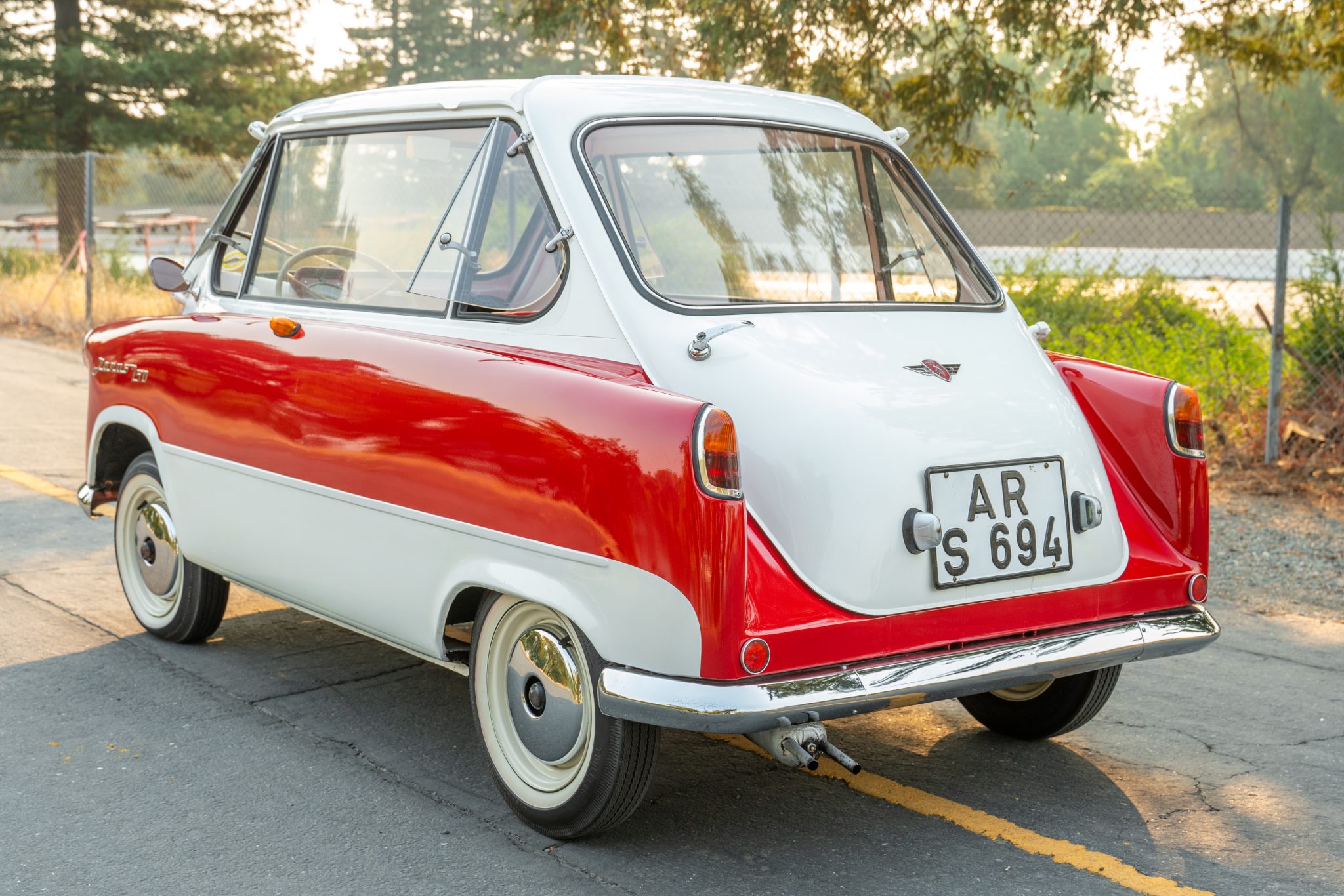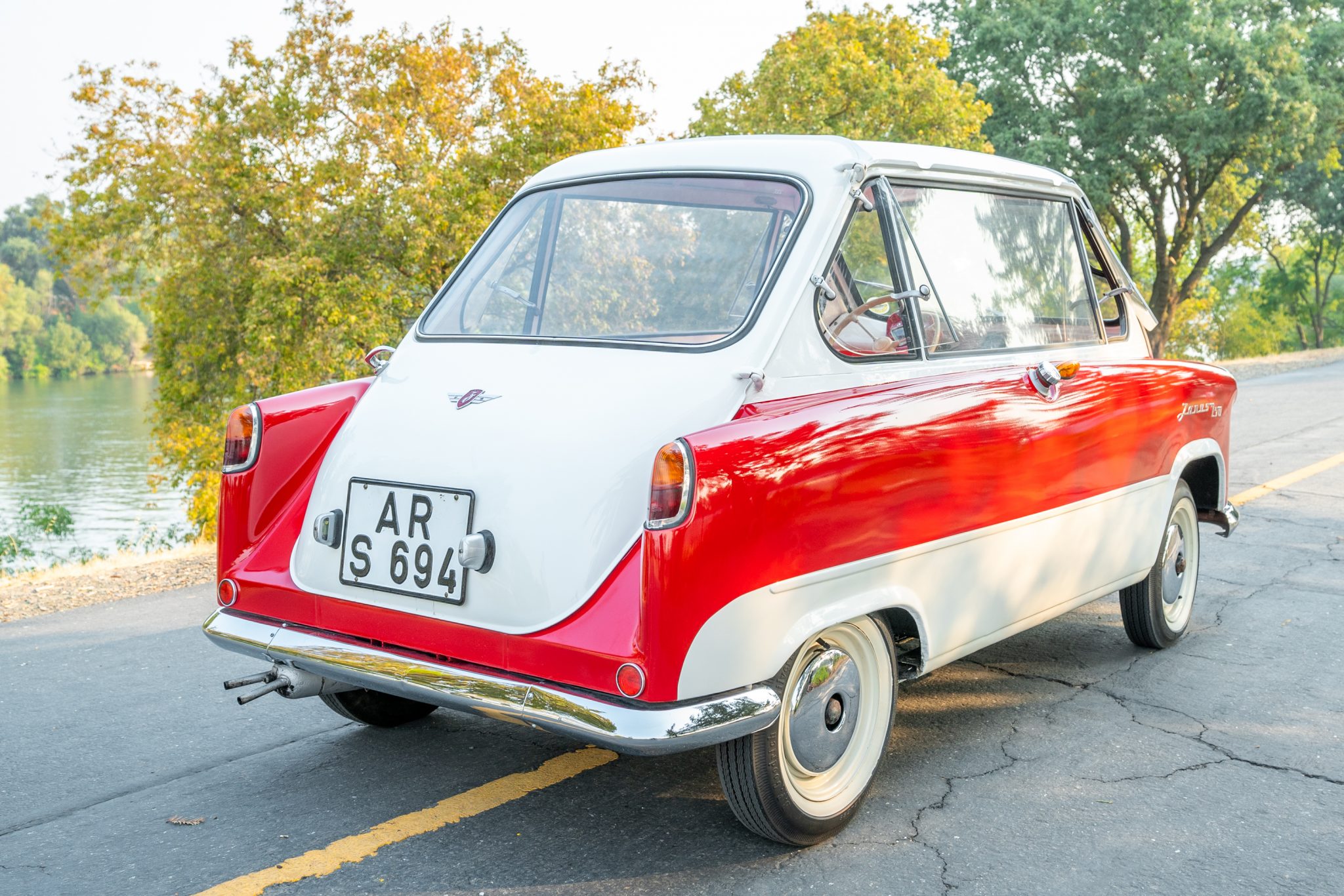 The white-painted 12” steel wheels wear chrome hubcaps and are wrapped in BFGoodrich Silvertown whitewall tires. Stopping power is provided by hydraulically-actuated four-wheel ventilated disc brakes, and the car rides on leading-arm front suspension with a swing-axle out back. A spare wheel is mounted in the floor between the seats.