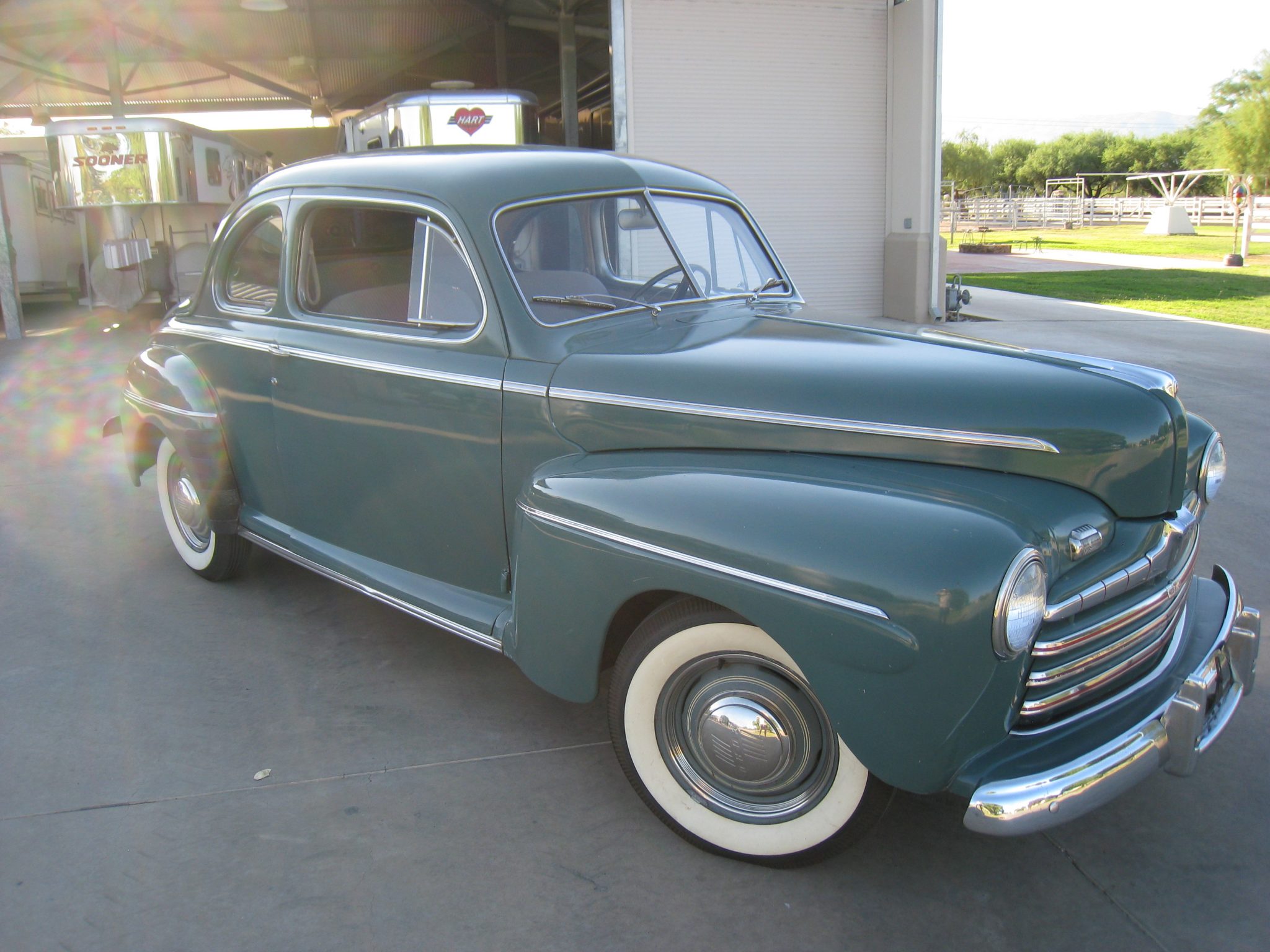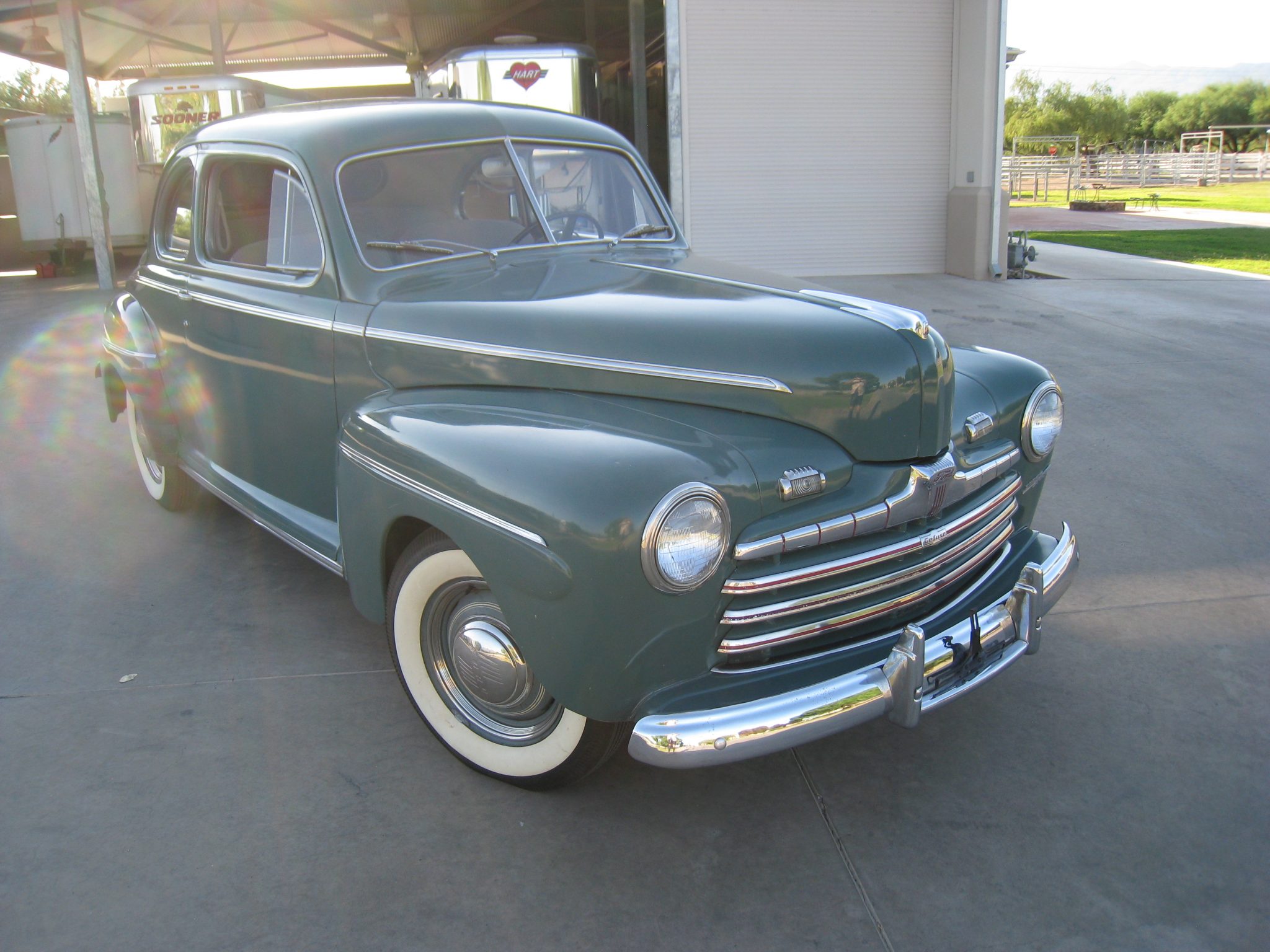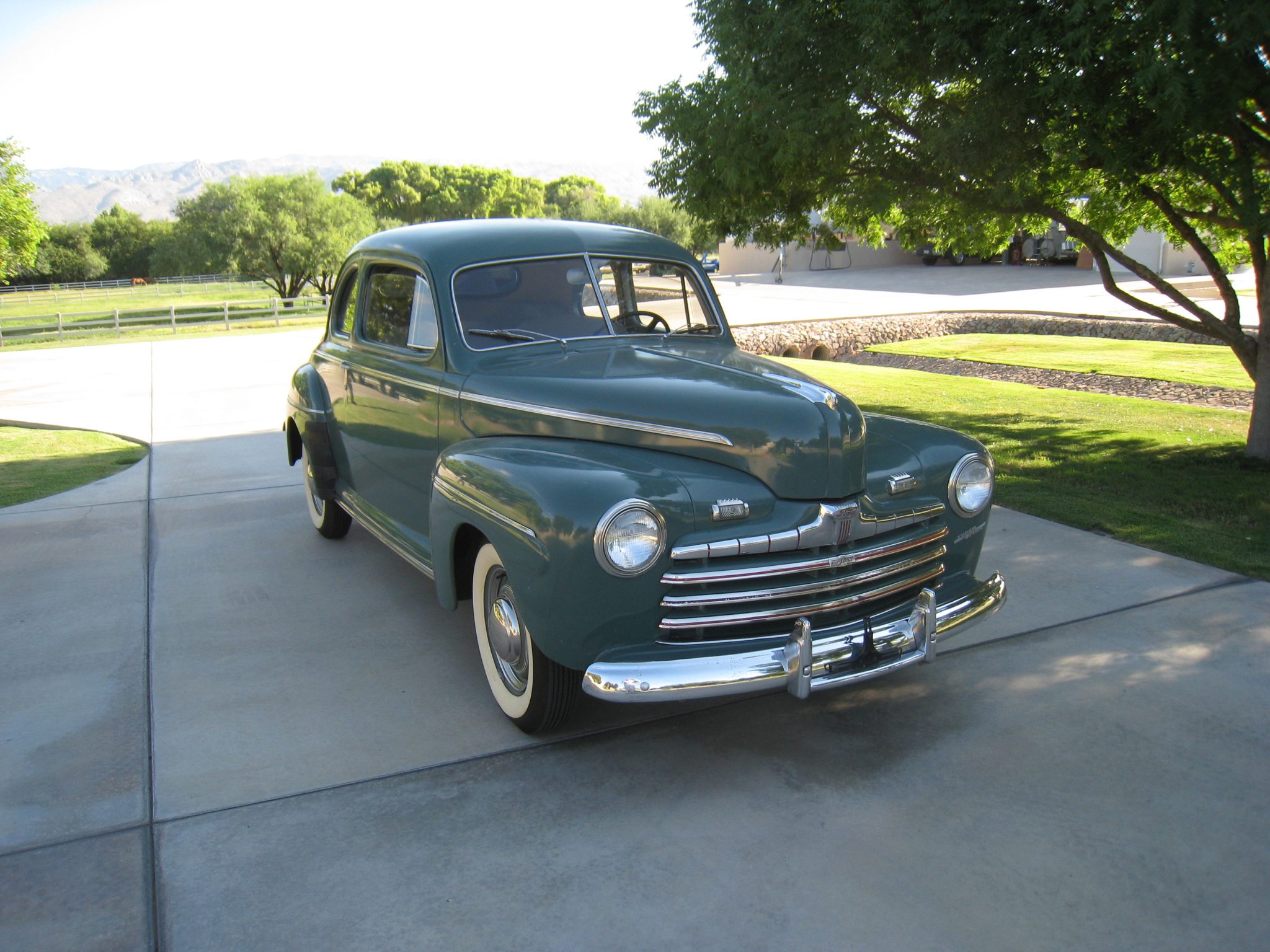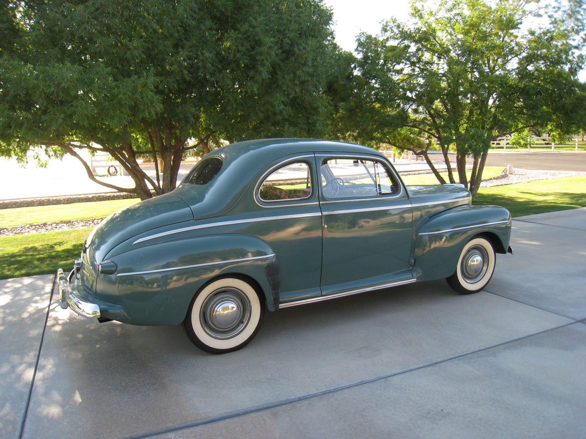 The seller reports that the front and rear windscreens have been replaced. Body-colored steel wheels wear polished Ford hubcaps and wide-whitewall tires. Braking is handled by drums at all four corners.