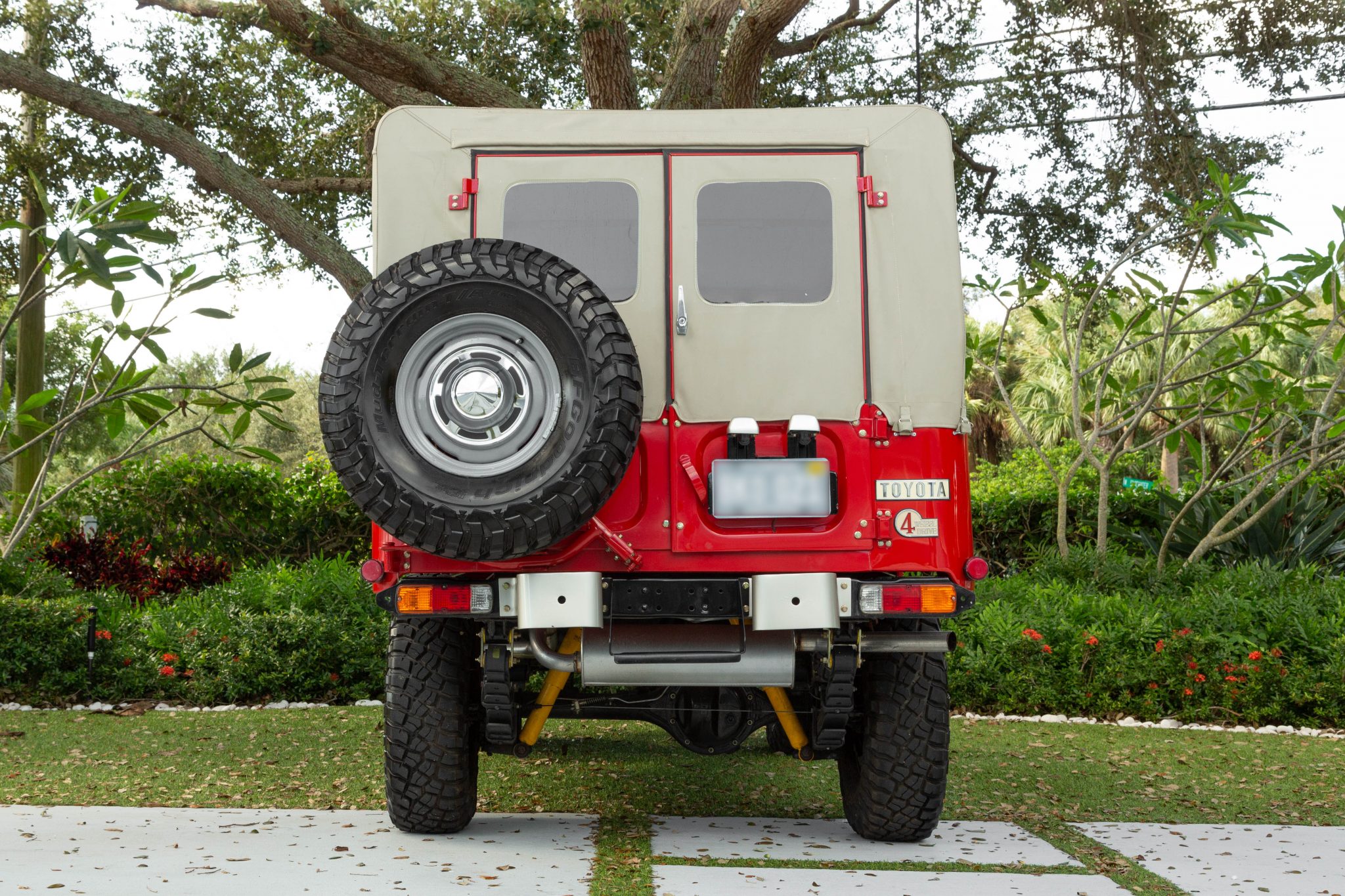 Gray-finished 15” steel wheels wear chrome hubcaps and 33″ BFGoodrich Mud-Terrain T/A tires that show 2018 date codes. The truck is equipped with power-assisted steering and brakes, manually-locking front hubs, and a matching spare on the swing-away carrier at the rear.