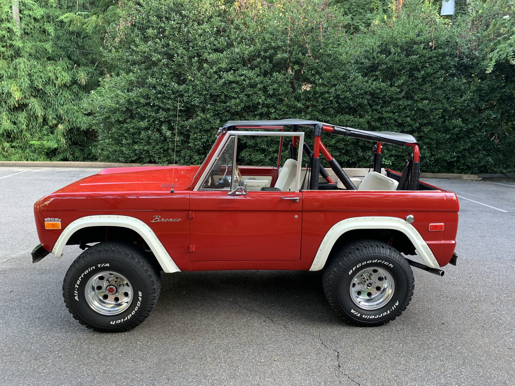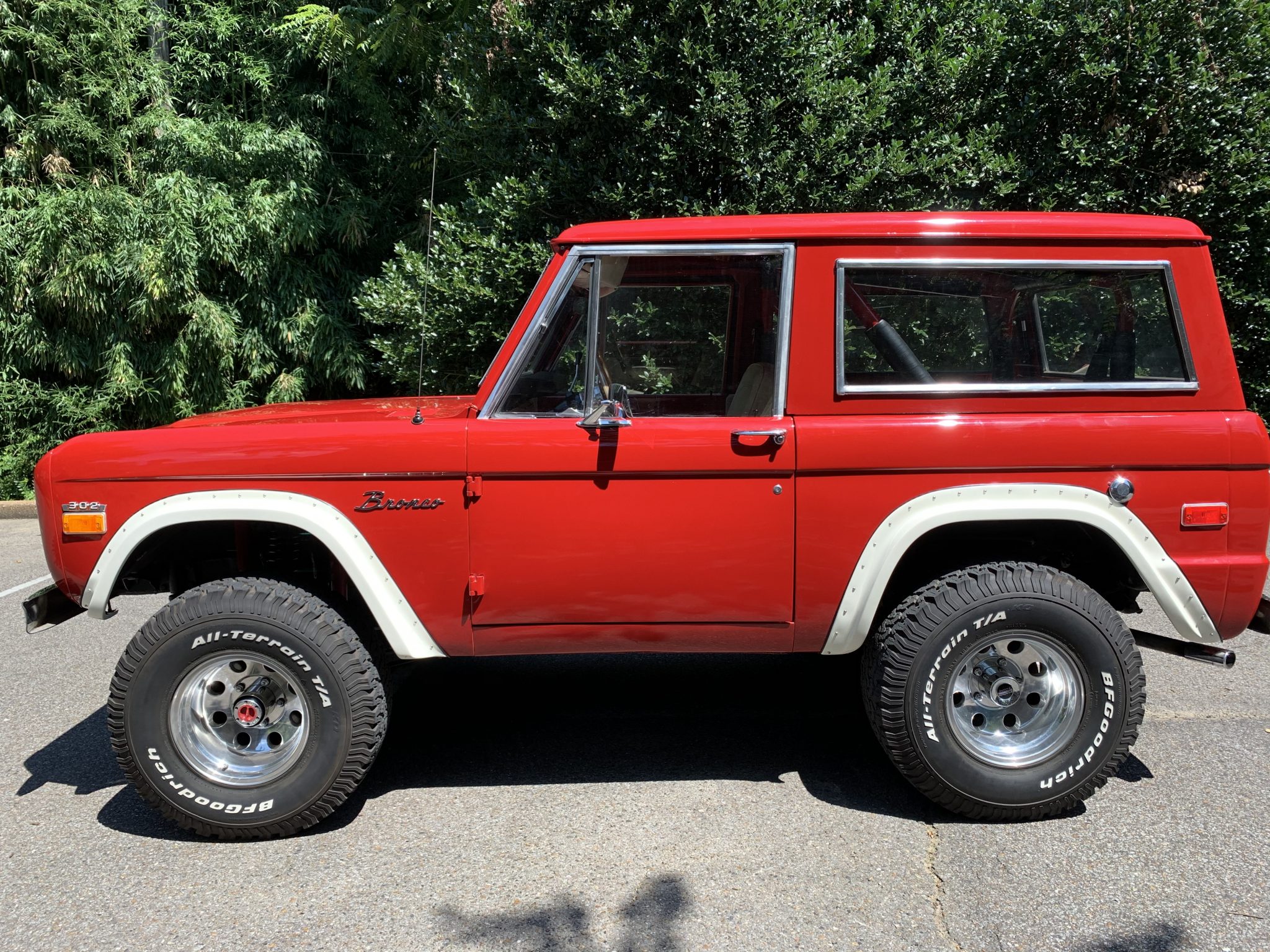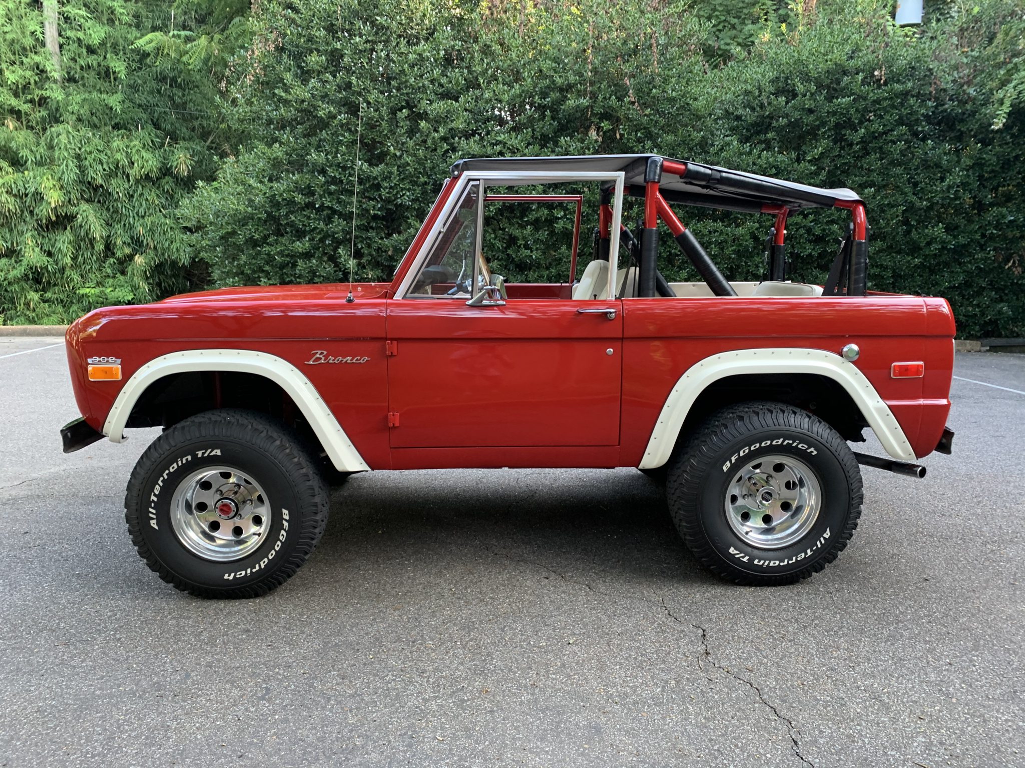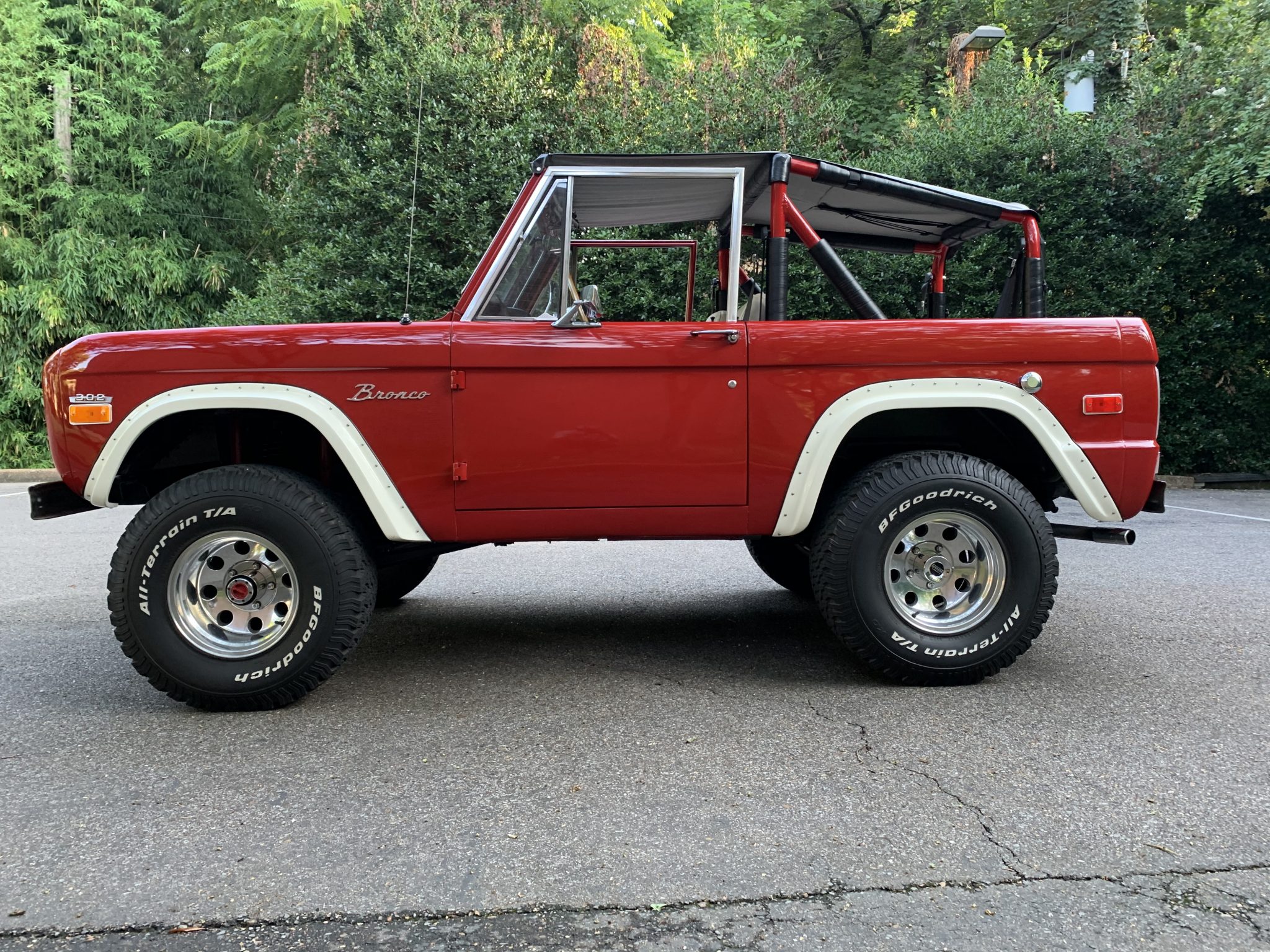 Polished 15″ American Racing wheels wear 33×12.5″ BFGoodrich All-Terrain KO tires. Fitted equipment includes manually locking front wheel hubs, a 3.5:1 limited-slip rear axle, and a lift kit. Recent work is said to have included an alignment and the installation of replacement radius arm bushings.