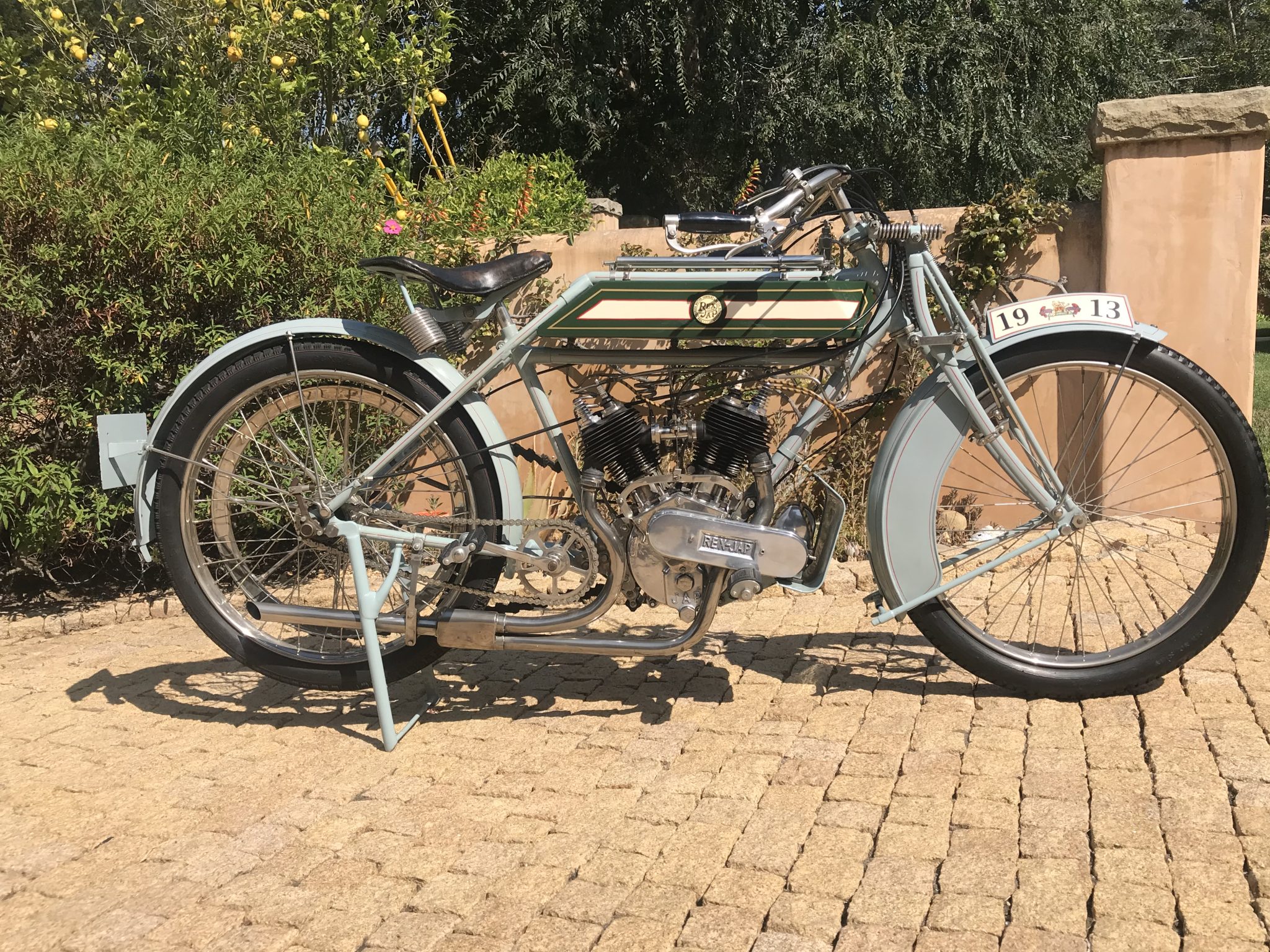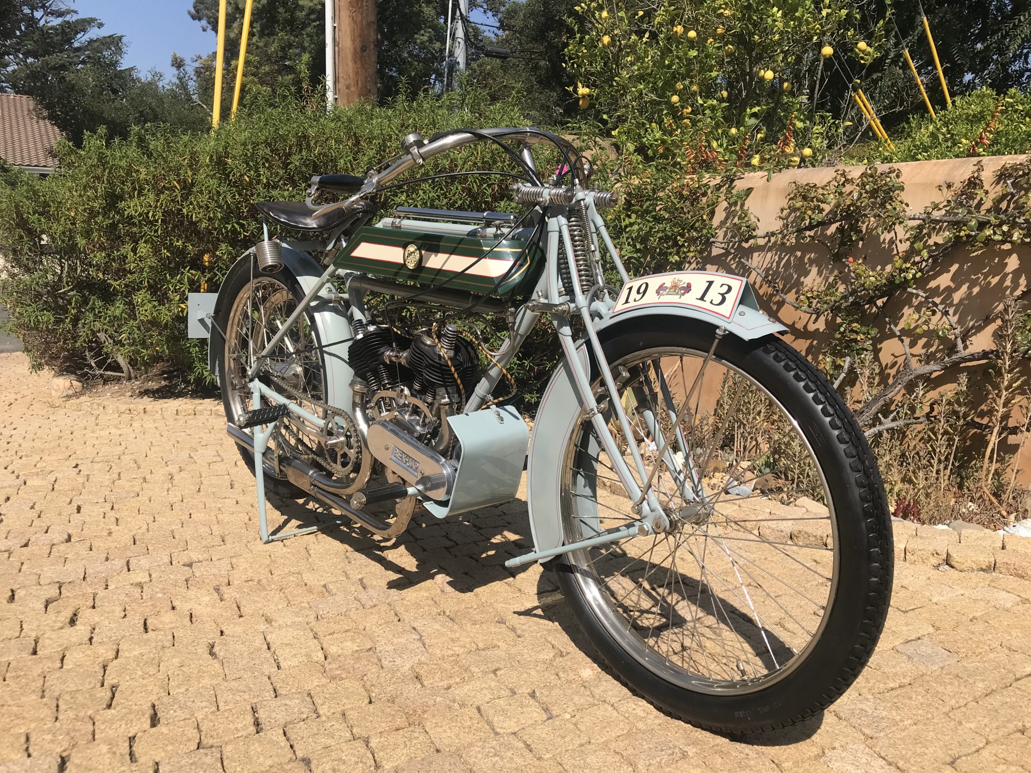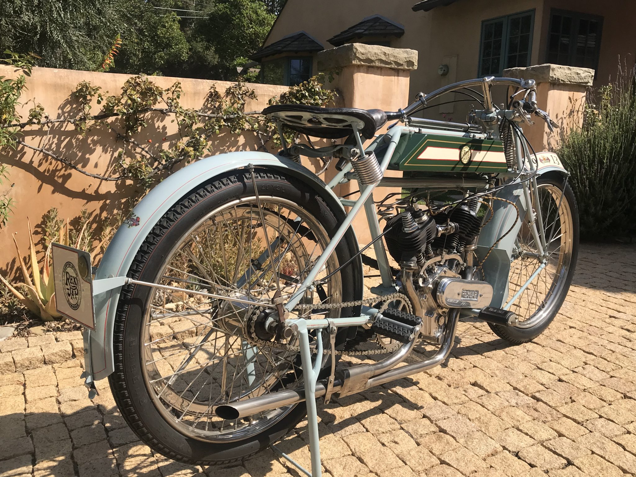 Nickel-plated wire-spoke wheels wear mixed period-style tires with cracked sidewalls. Suspension consists of a Brampton bi-flex fork as well as dual springs mounted to the solo saddle. Braking is from a front rim brake controlled by a hand lever on the right, while the rear is controlled by a foot pedal on the right.