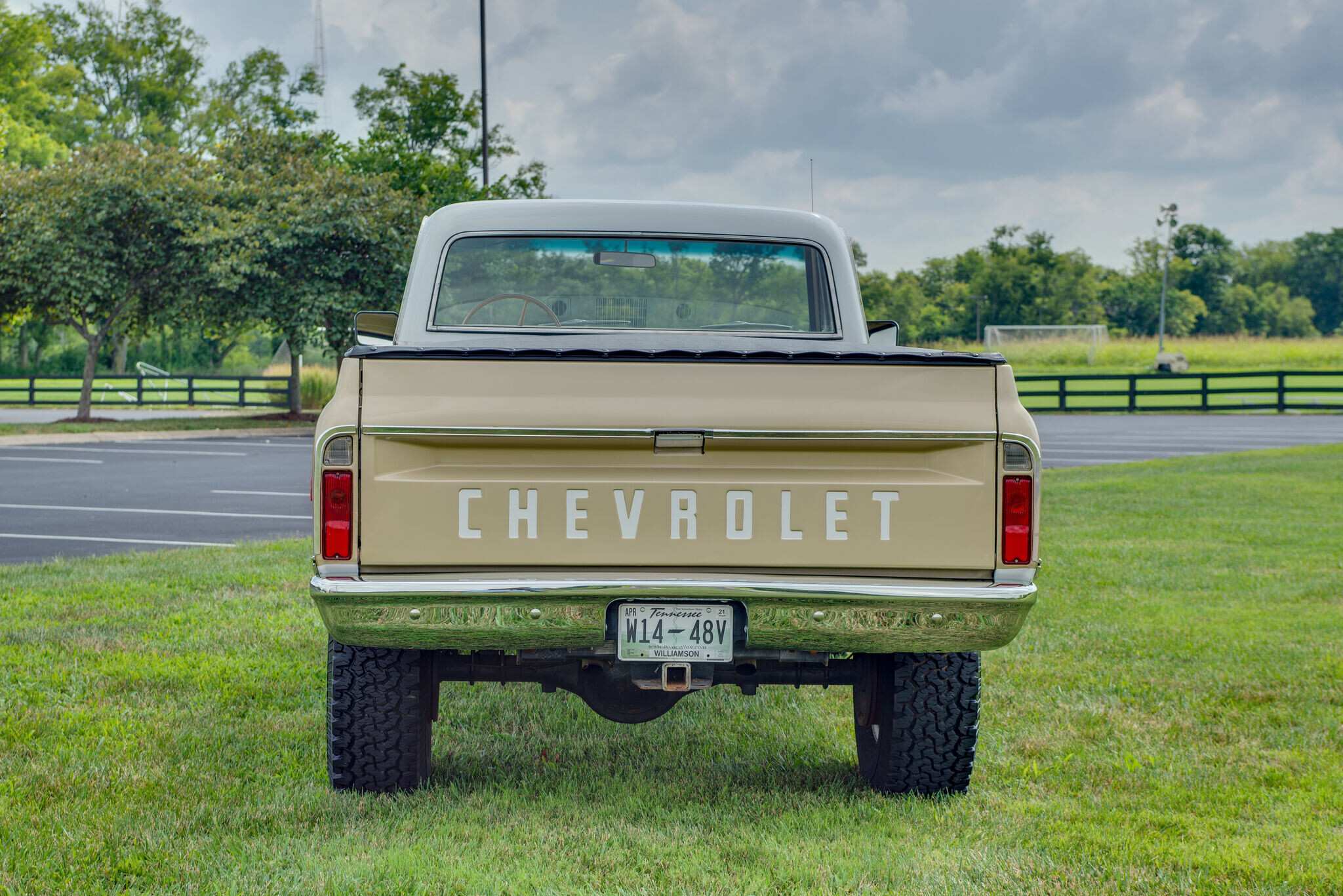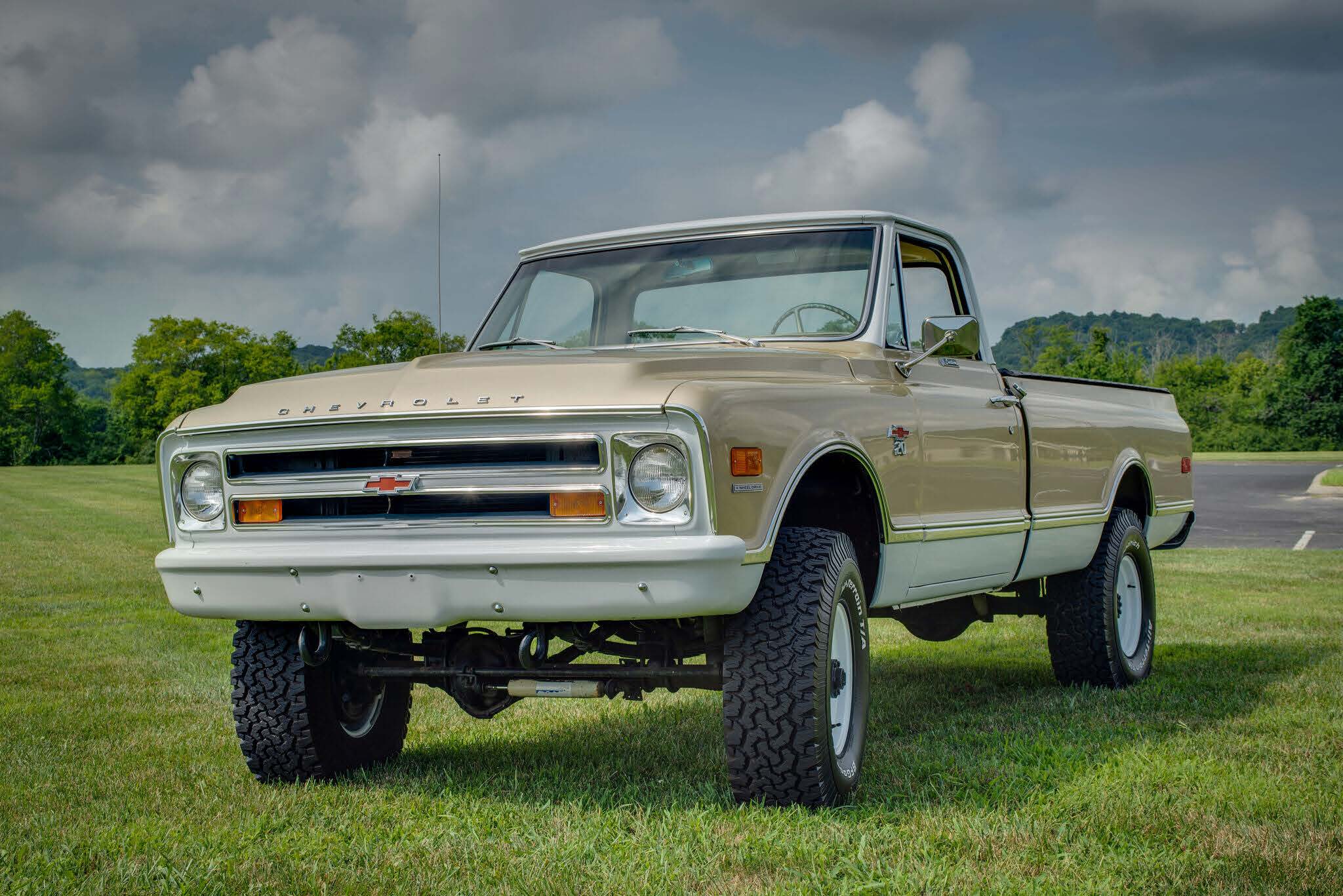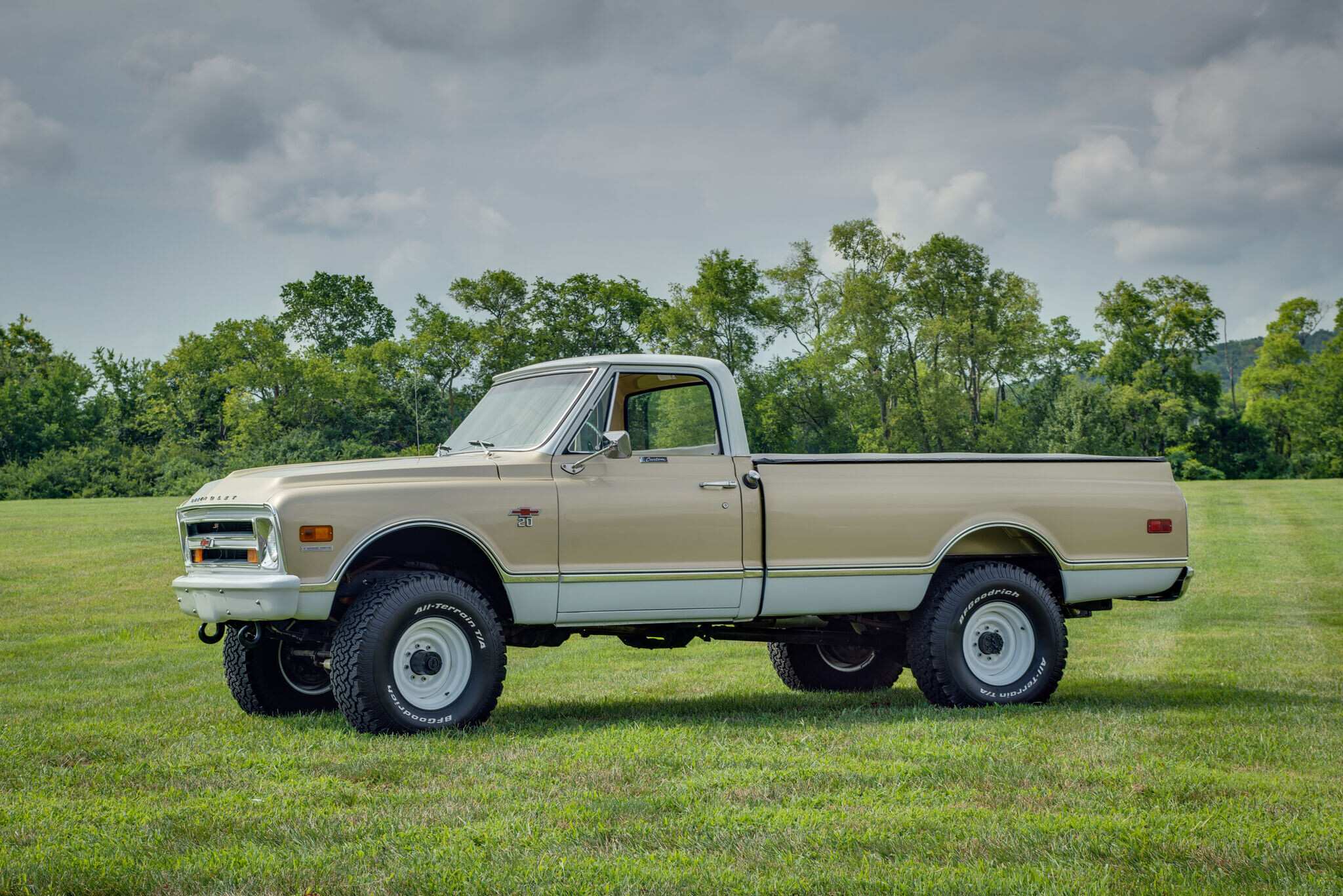 White-painted steel wheels wear BFGoodrich All-Terrain T/A tires. Heavy-duty springs were optioned from the factory, and this truck is equipped with an aftermarket suspension lift fitted under prior ownership.