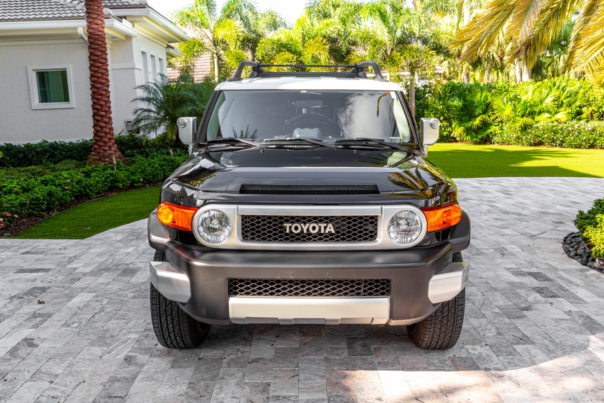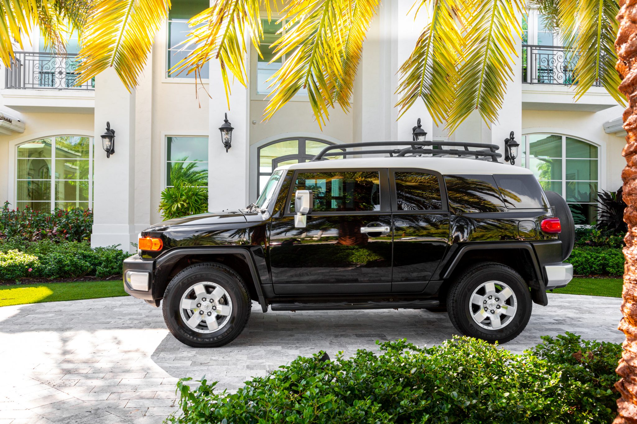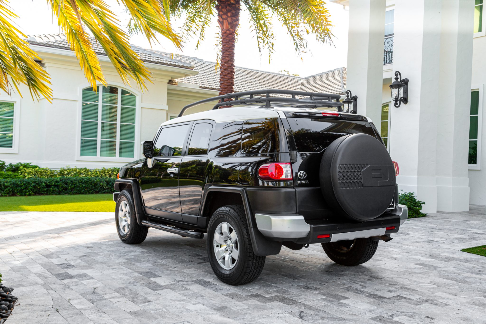 Six-spoke 17″ wheels are mounted with 265/70 Firestone Destination LE2 tires. A full-size spare is mounted to the rear door and is protected by an FJ logo plastic cover. The truck utilizes a control-arm front suspension design and a solid rear axle, and braking is handled by ventilated discs at all four corners.