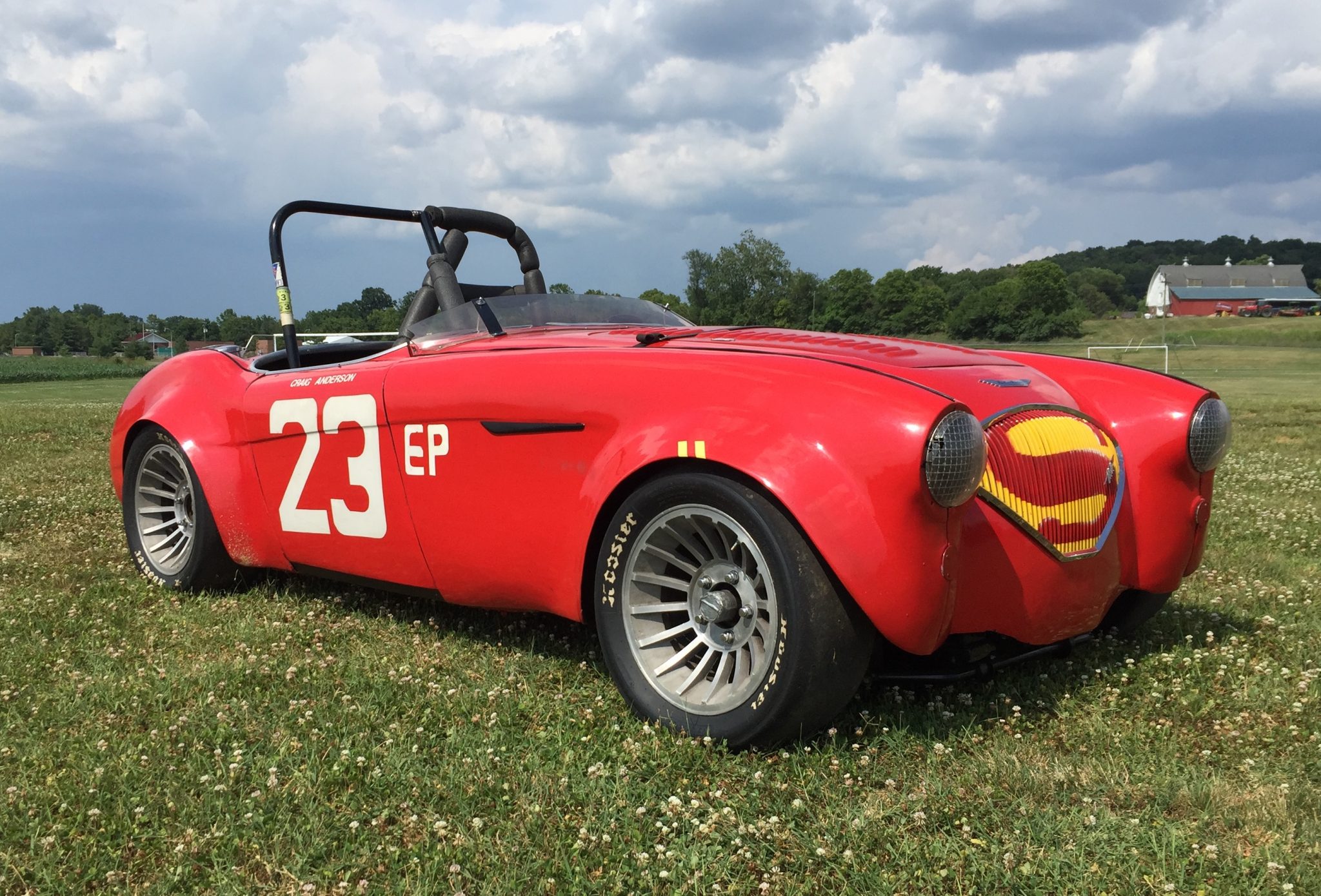 New sills and lower rockers from Moss Motors were fitted in July 2020 and are finished in black. Aftermarket 15″x7″ alloy wheels are mounted with 245/15 Hoosier slicks, with the seller noting an air leak on the right front. The car features an Austin-Healey Sprite steering rack and a live rear axle located by a custom five-link setup. Braking is handled by Austin-Healey 3000 front and Lincoln Versaille rear discs.