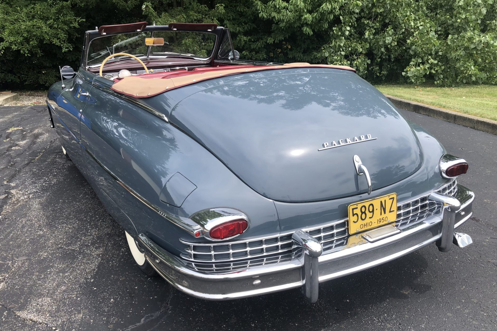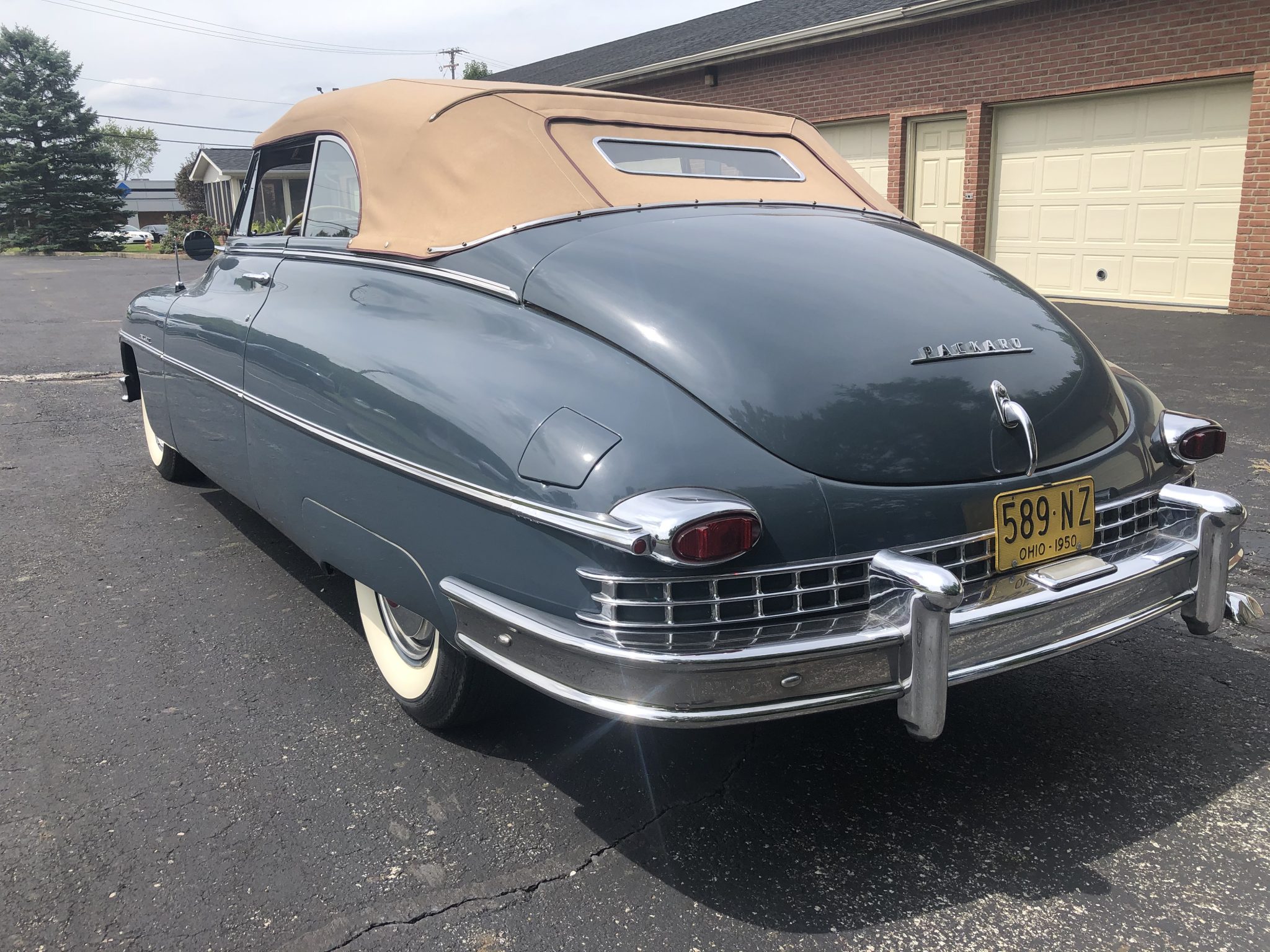 Stock body-color 15″ steel wheels wear Packard hubcaps, trim rings, and Remington wide whitewall tires. A matching spare is retained in the trunk. The power-operated tan convertible top is shown in the raised position above and is demonstrated in operation here.