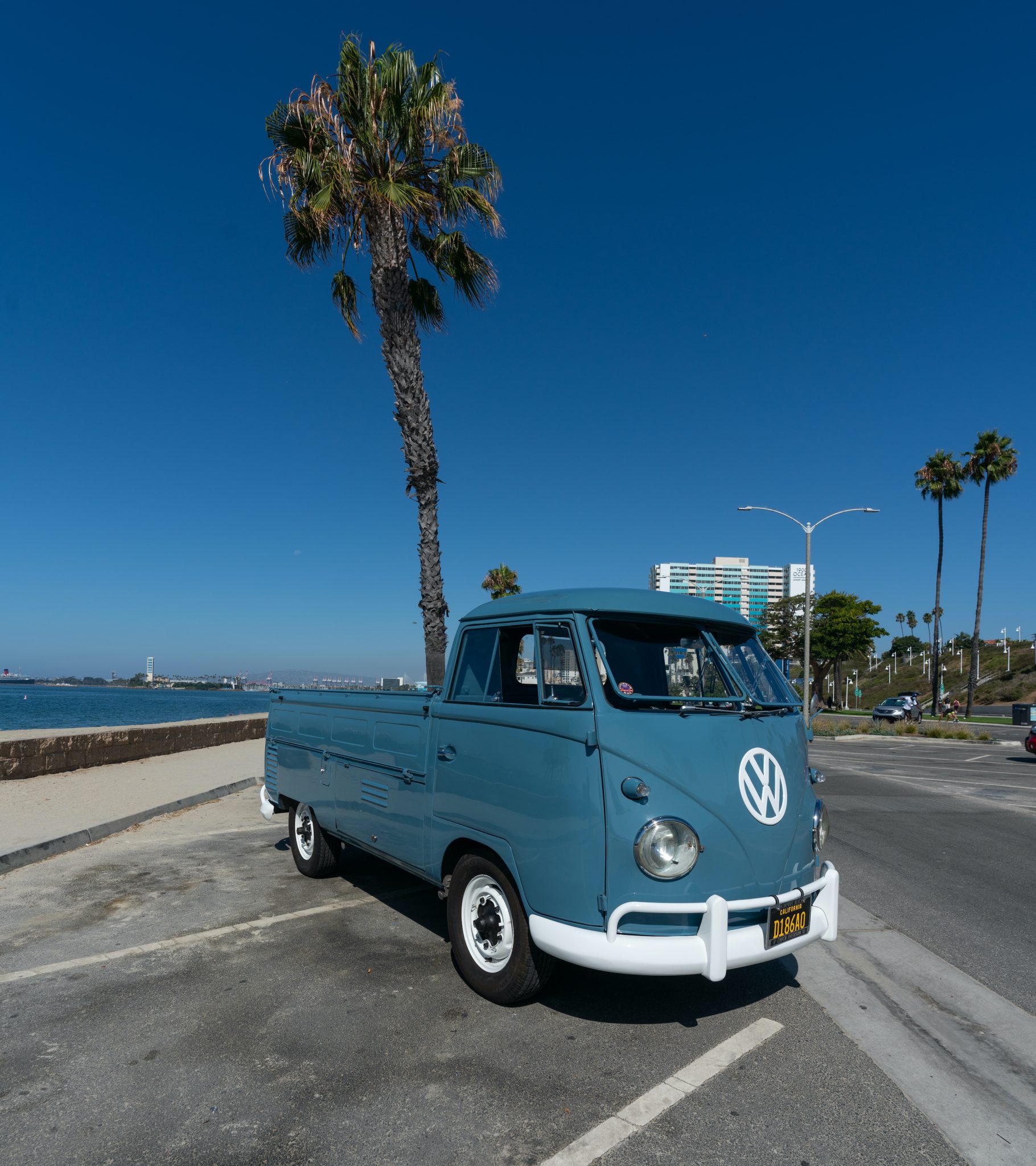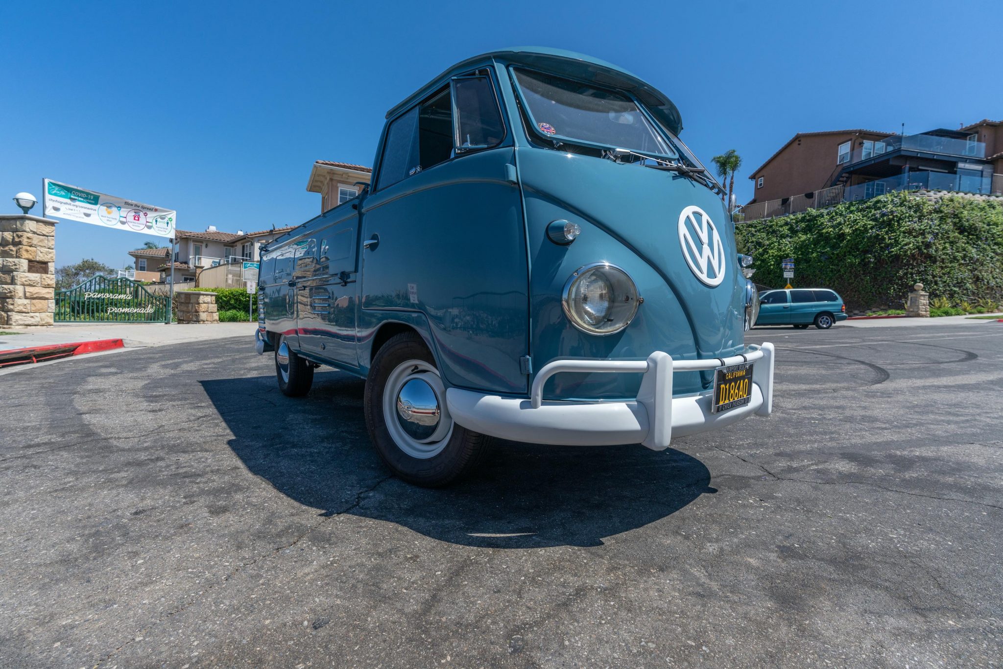 White-painted 15″ steel wheels wear chrome-finished VW hubcaps and are mounted with GT Radial Champiro VP1 tires measuring 205/75. The seller notes that Beetle headlamps are currently fitted.