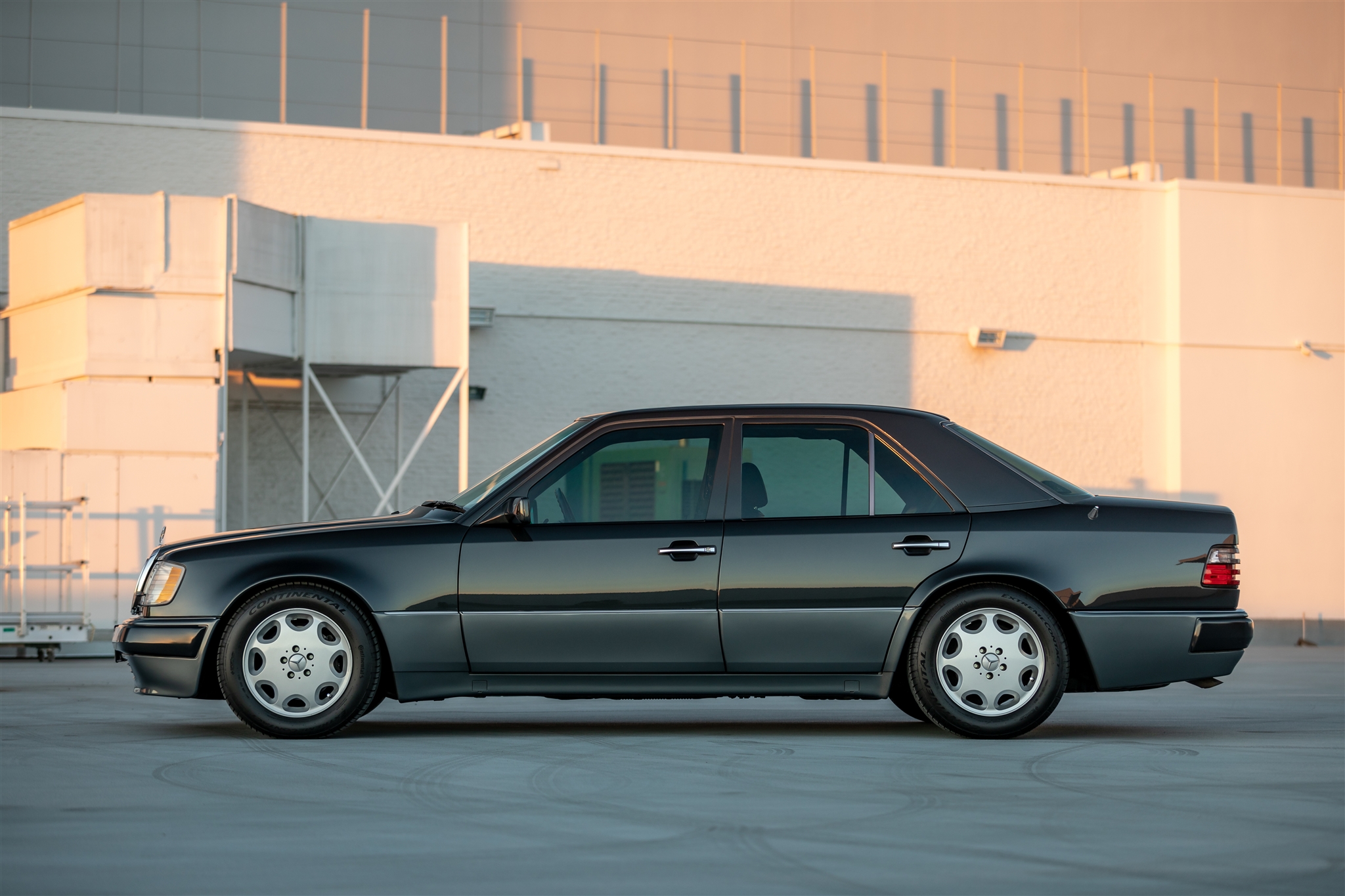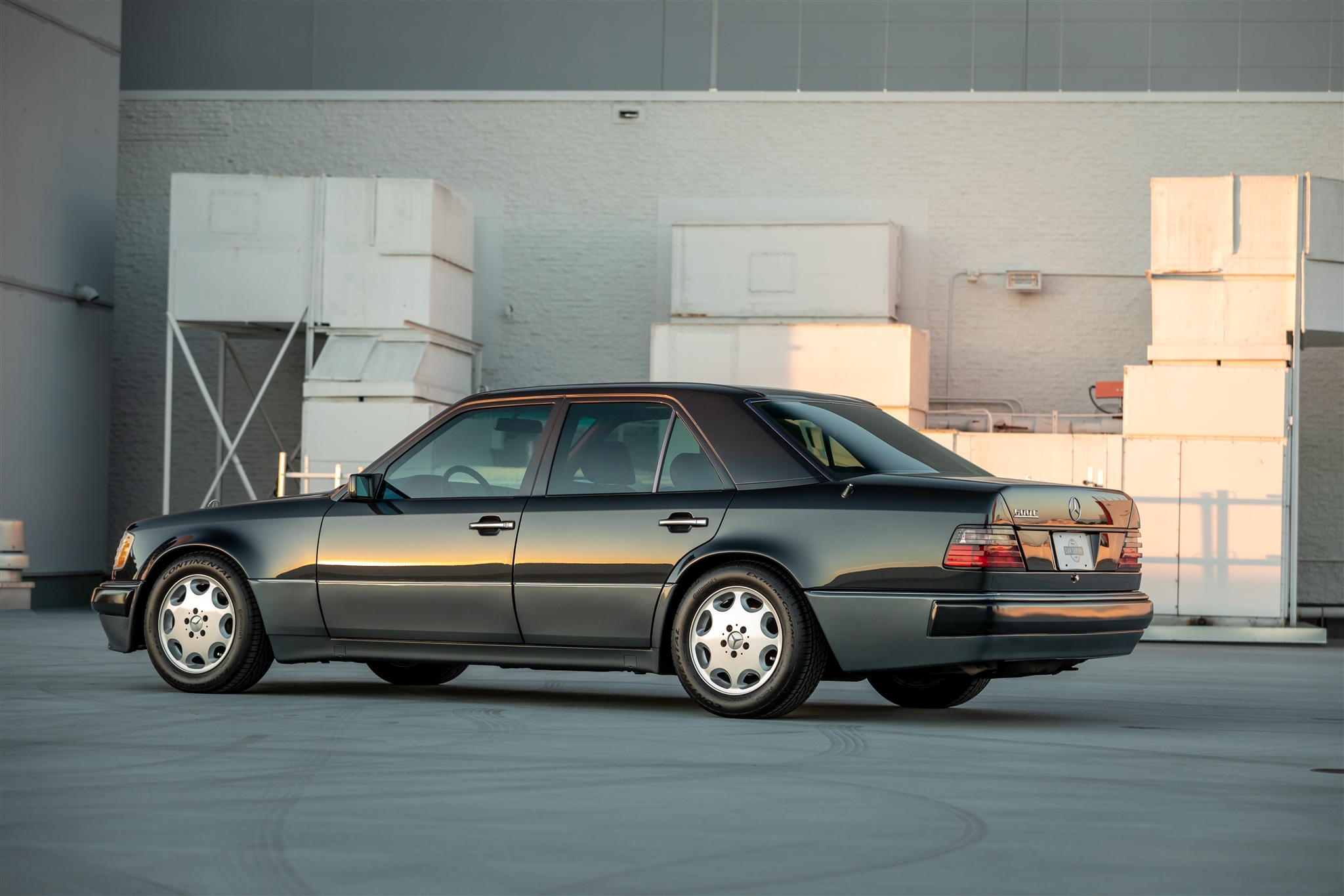 Factory 16” wheels are wrapped in Continental ExtremeContact DWS tires that were installed in December 2020. Distinguishing features of the 500E compared with other W124 models included a wider track width, flared fender arches, larger four-wheel disc brakes, unique lower body cladding, and a more aggressive front air dam. Service performed in 2020 included replacing the factory self-leveling suspension, installing Sachs shocks, and an alignment. A steering overhaul in 2019 included replacement tie rods and a replacement drag link, and a brake fluid exchange was performed at that time.