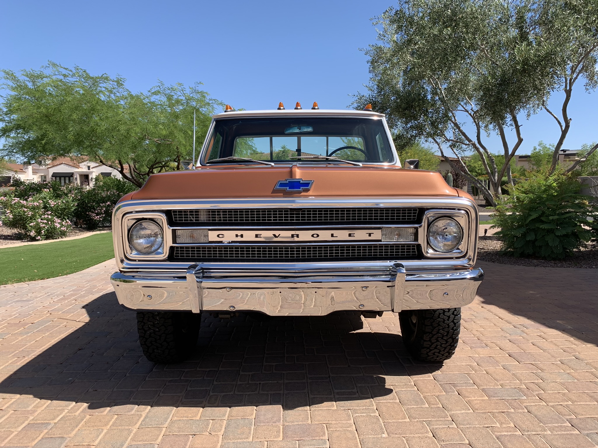 Steel 15″ wheels wear polished hubcaps and 33×10.5″ BFGoodrich All-Terrain T/A KO2 tires. Equipment includes front disc brakes, manually locking front wheel hubs, and Posi-traction front and rear axles.