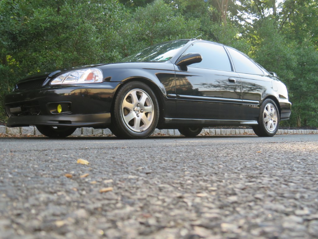 Factory 15″ alloy wheels are mounted with 195/55 Road Hugger GT tires. Four-wheel disc brakes came standard on the Si model, and the seller states that the suspension has been lowered.