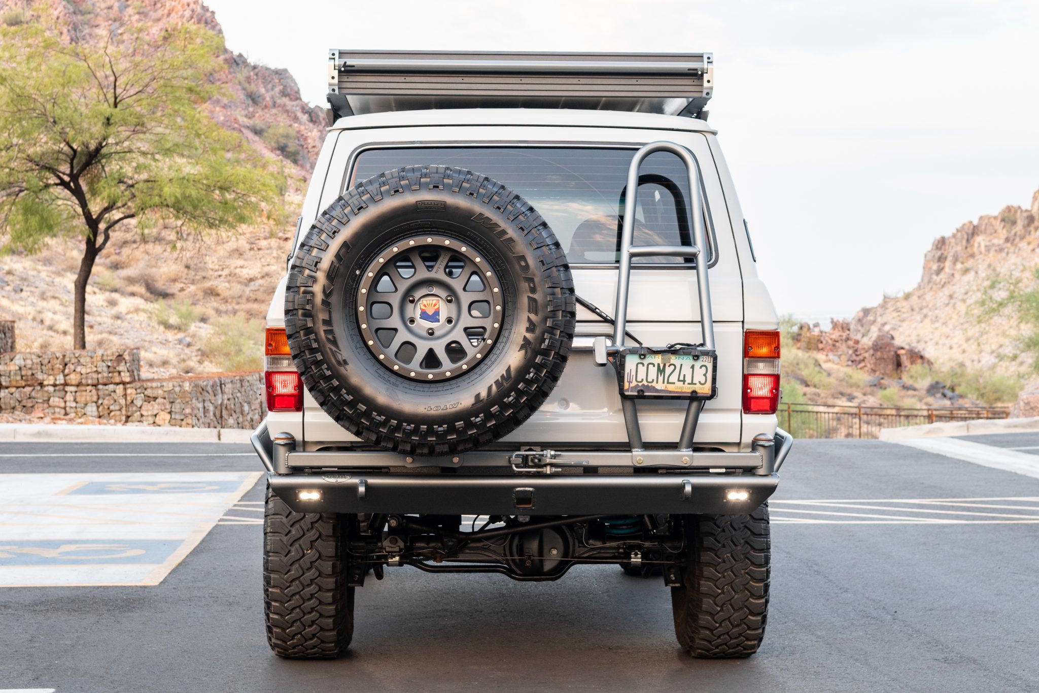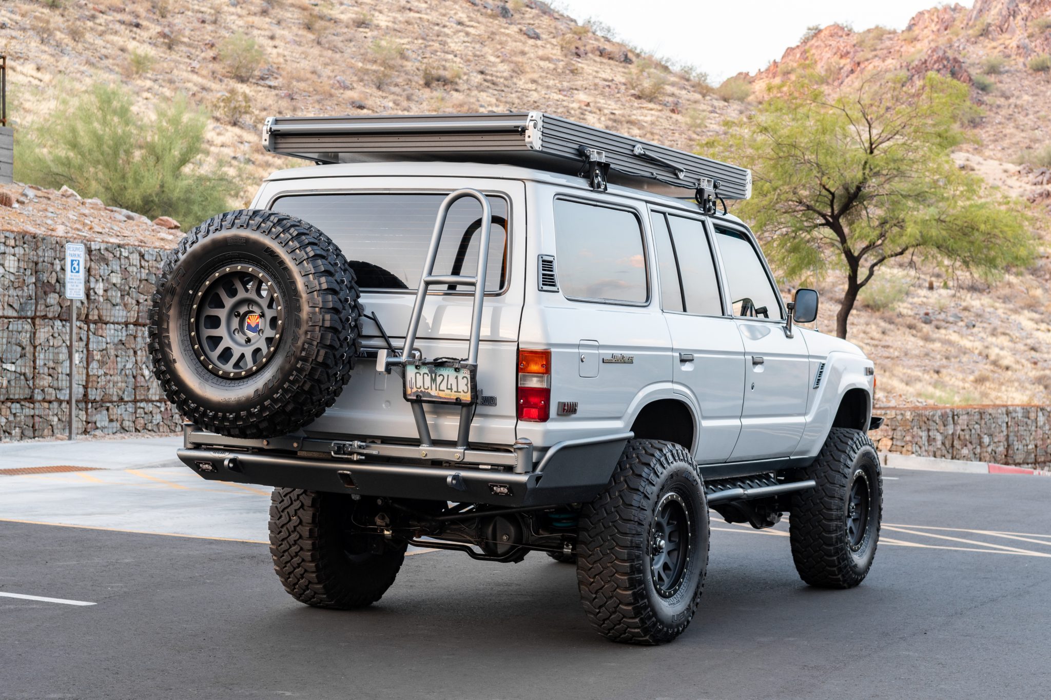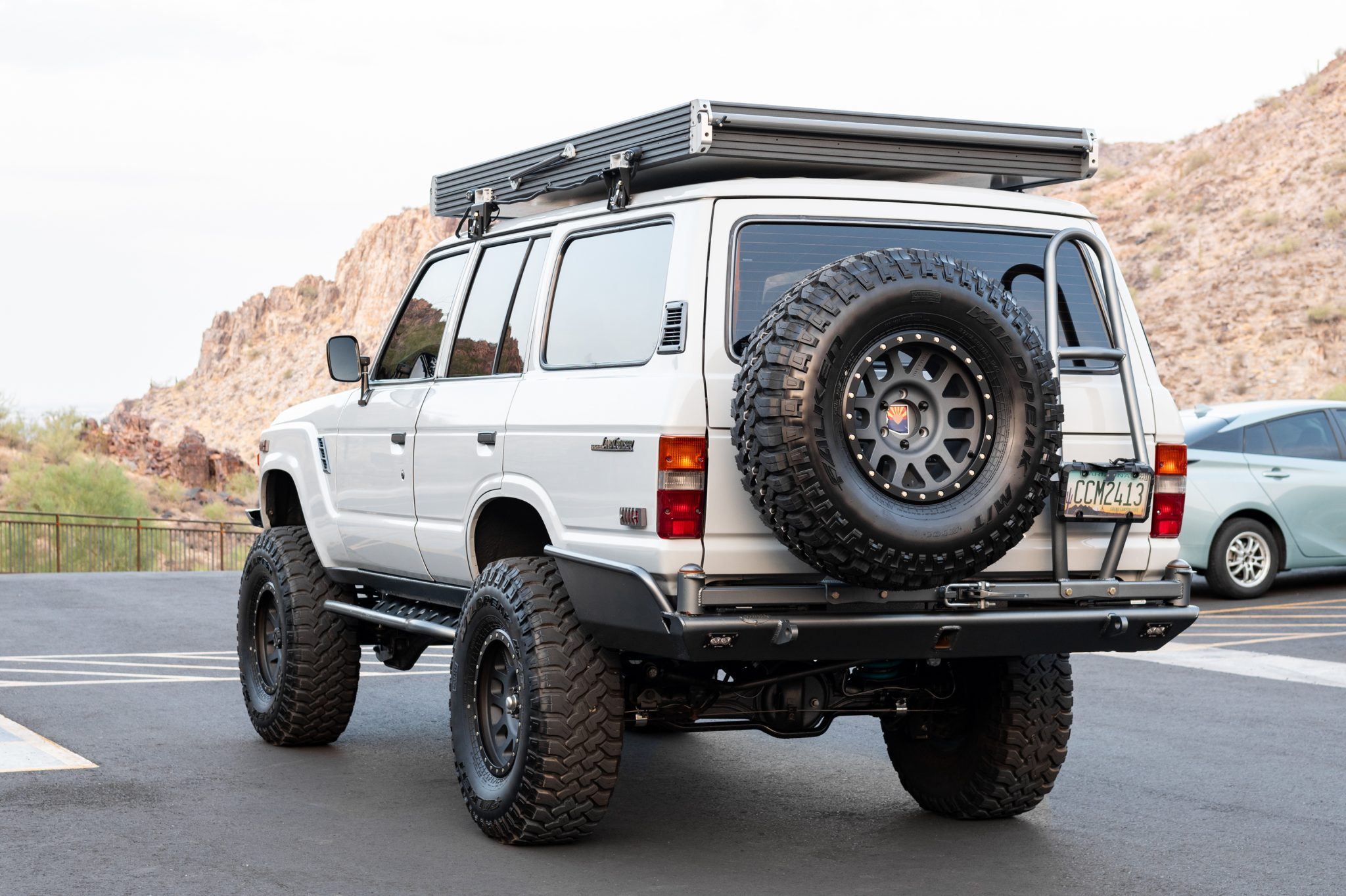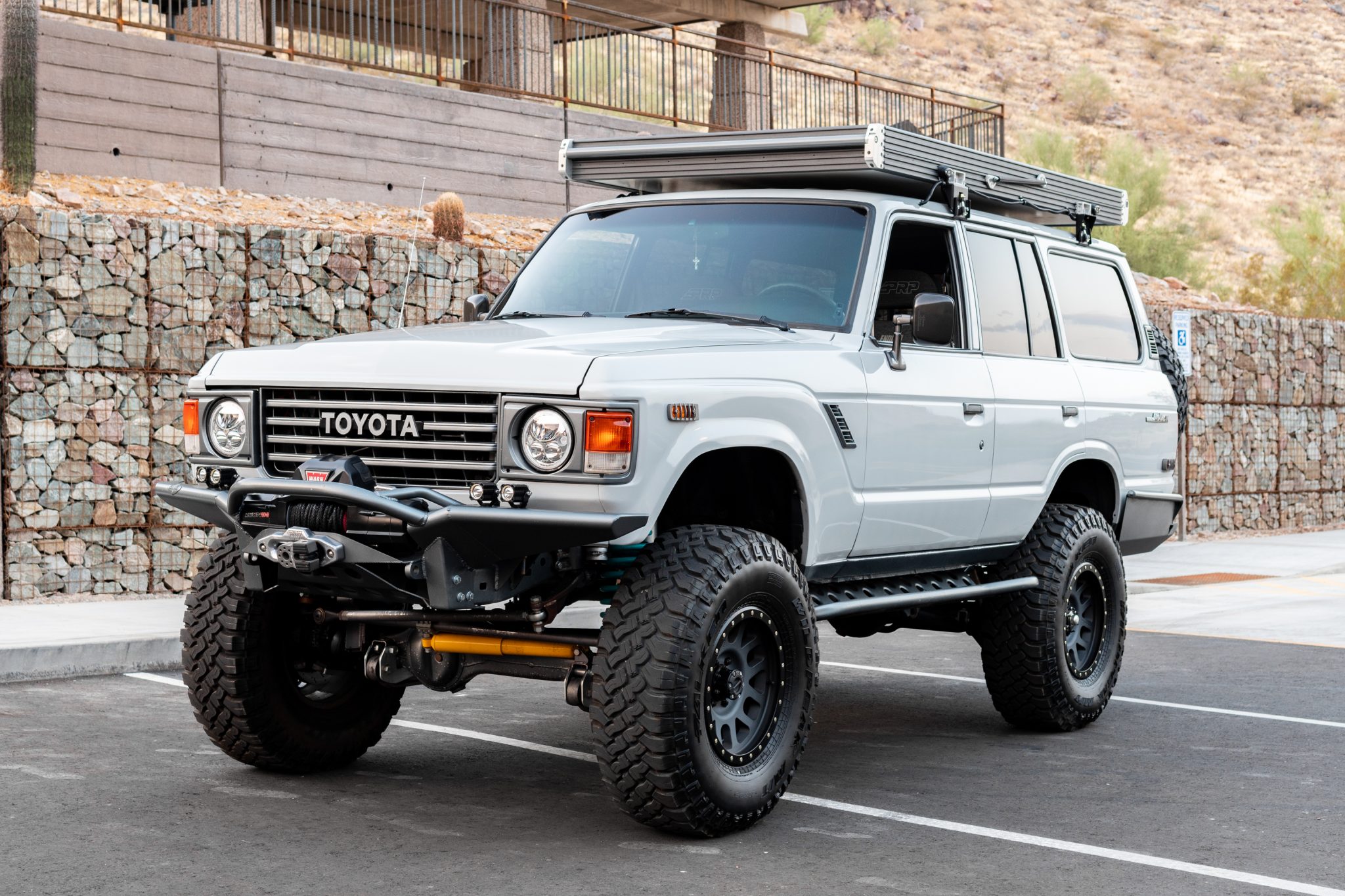 17″ Method wheels are finished in black and are wrapped in 37×12.50″ Falken Wildpeak M/T tires. FJ80 brake calipers are paired with Terrain Tamer drilled and slotted rotors and a hydro-boost system, and suspension modifications include a 3″ lift via Dobinsons heavy-duty progressive-rate coil springs, ICON 2.5 shocks with adjustable fluid reservoirs, Slee Offroad adjustable rear upper control arms, Slee caster plates, a Delta rear Panhard bracket and custom Panhard bar, Slee rear lower control arms, and 30mm front and rear sway bars with Land Cruiser Products links and front sway bar disconnects. A custom high-steer setup includes an FJ80 power steering box and HellFire Fabworks front knuckles.