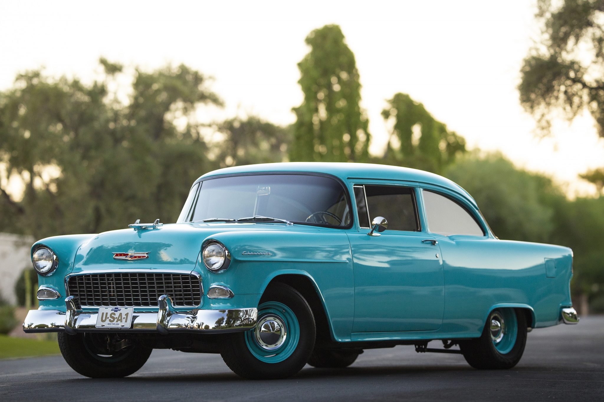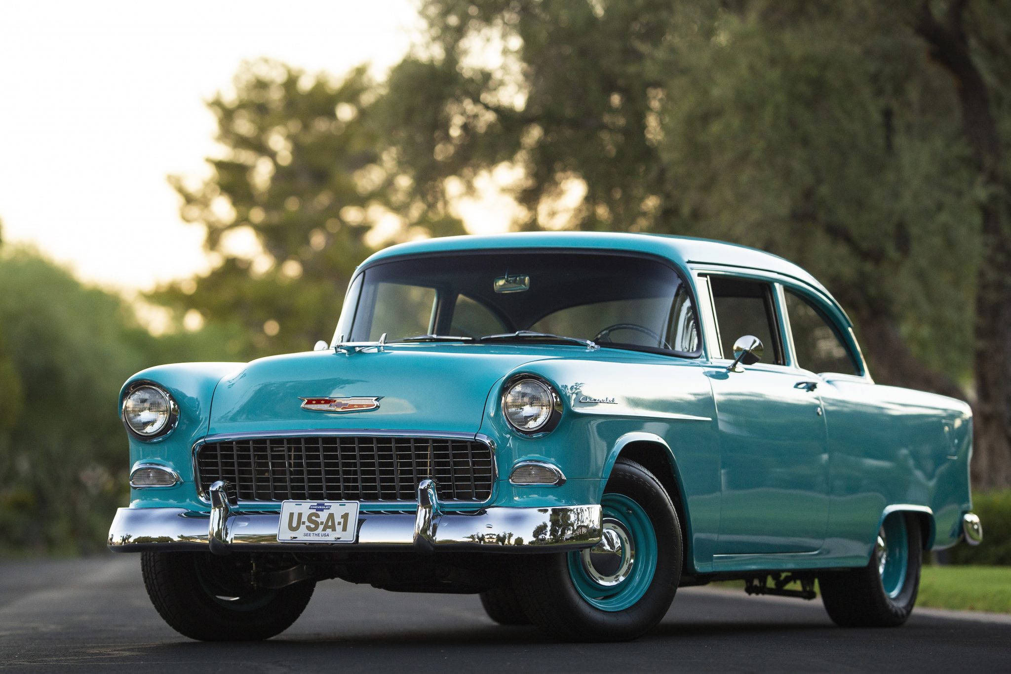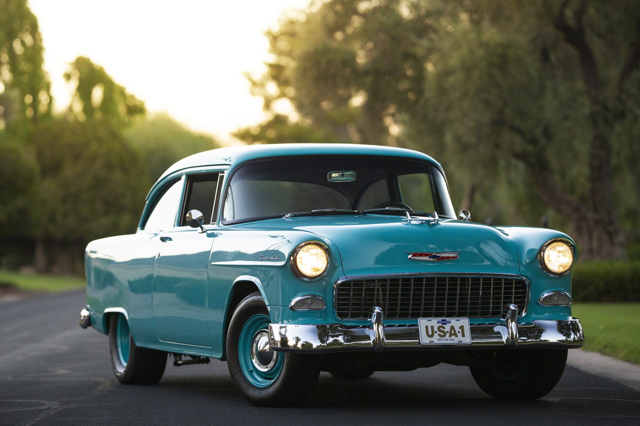 Staggered-width 15″ steel wheels are finished in body color and wear chrome Bowtie hubcaps and Eldorado Golden Fury GFT tires. The car has been fitted with a new front suspension components, a well as a sway bar and a steering rack. Leaf springs and trailing links locate the Ford 9″ live rear axle, and KYB Gas-a-Just dampers are equipped at both ends. Braking is via power-assisted discs with cross-drilled and slotted rotors at all four corners.