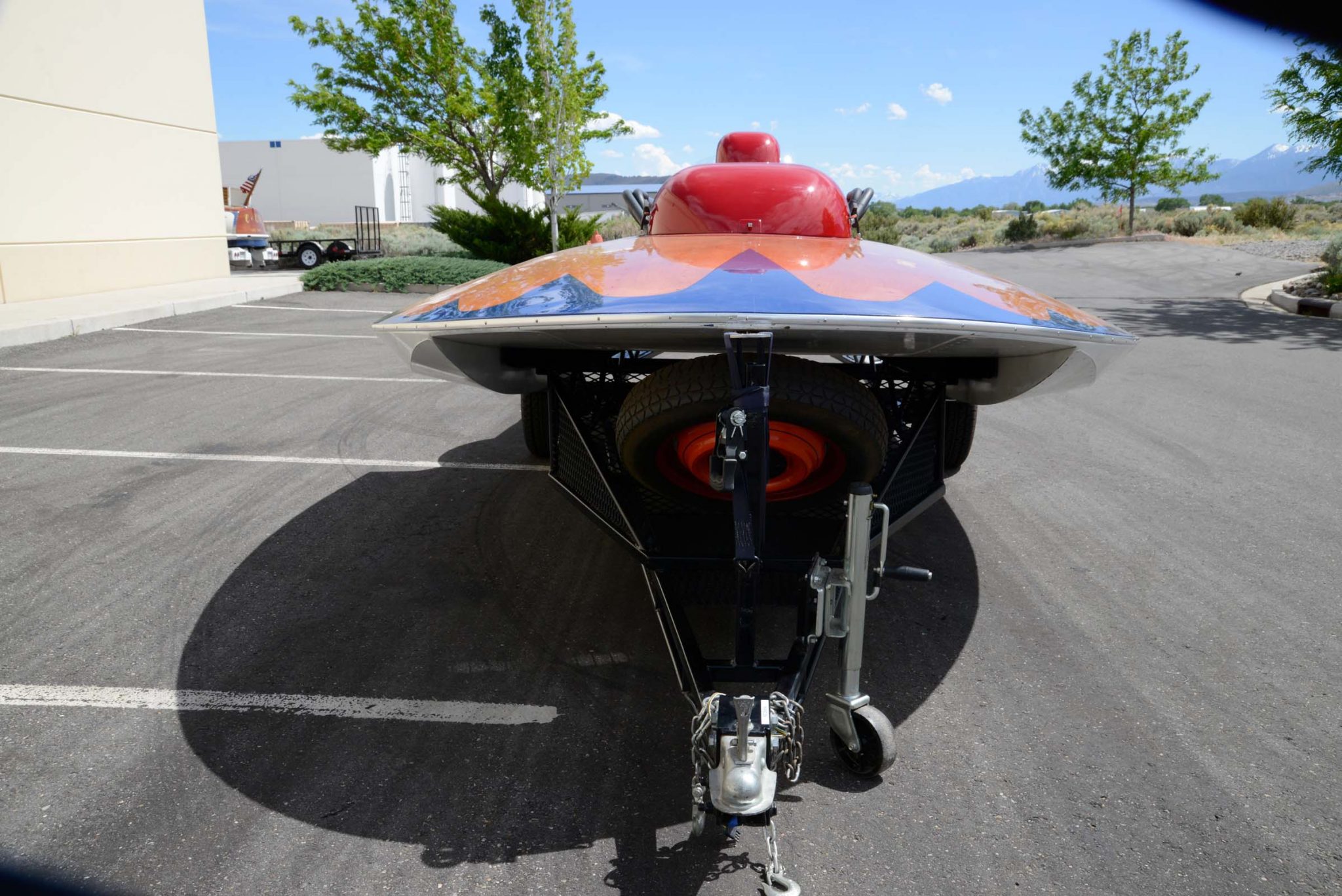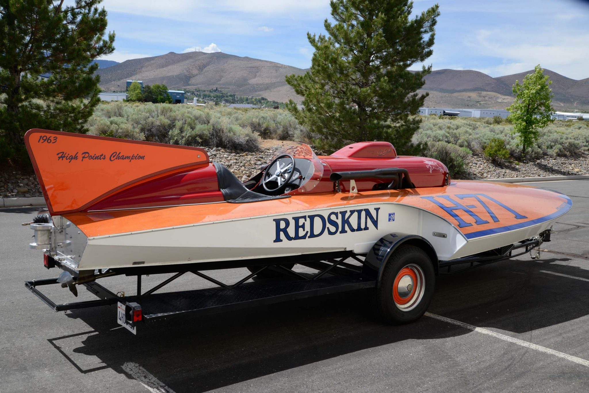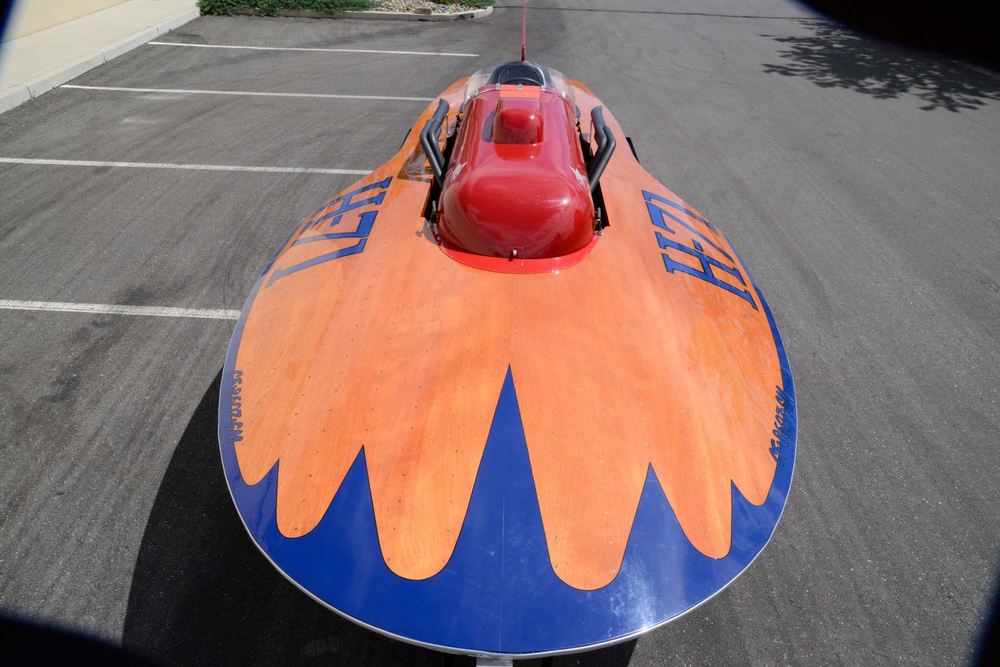 This hydroplane’s designer, Ted Jones, was inducted into the Motorsports Hall of Fame of America in 2003. The planning-style hull measures 22′ long and 8′ 10″ wide and is constructed of Honduran mahogany over oak framing. It has a varnished foredeck, blue trim, a red engine cover, and a vertical fin painted in red and orange. The vessel was restored in the 1990s by Marshall Mathews of Palo Alto, California.