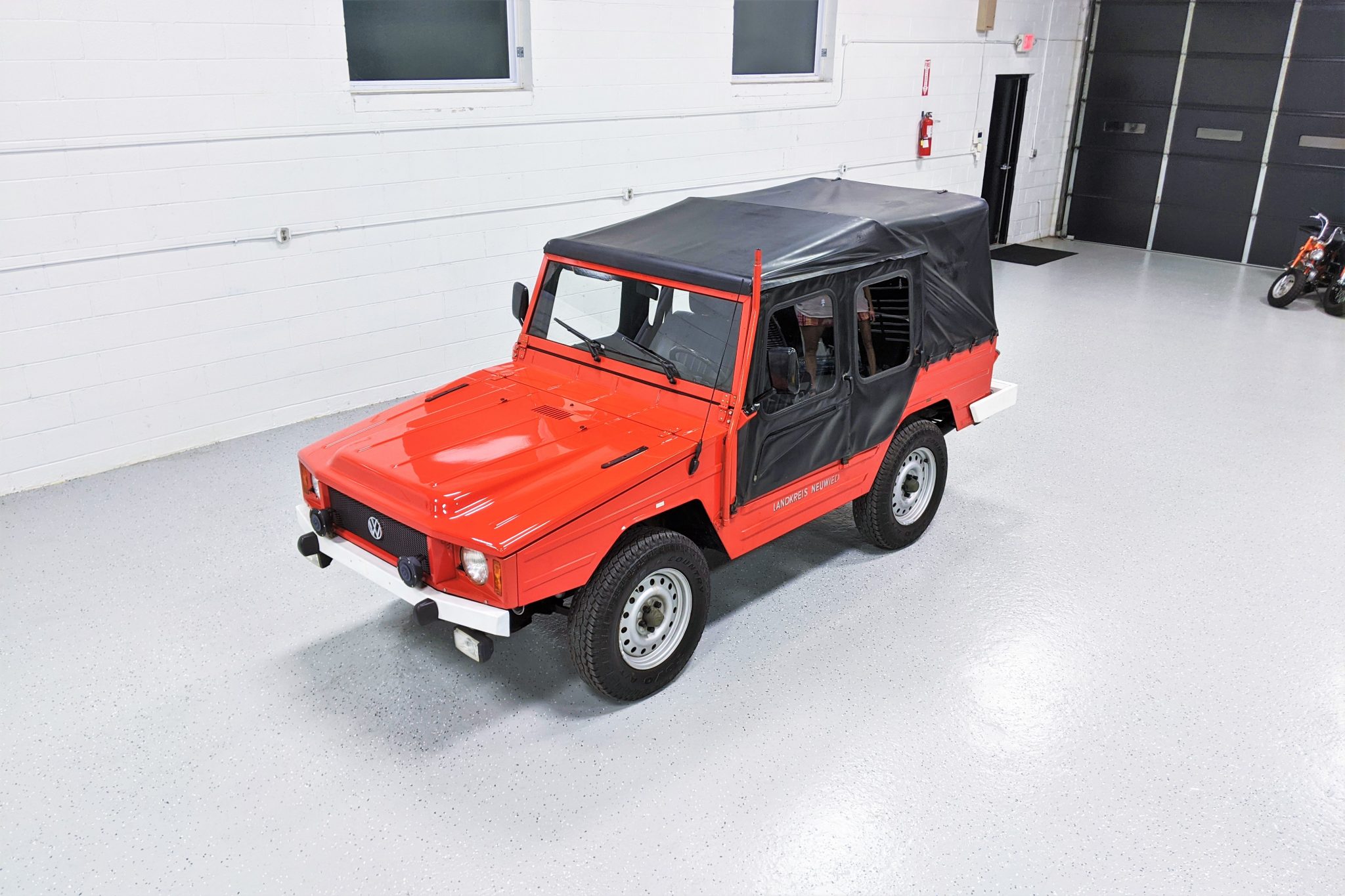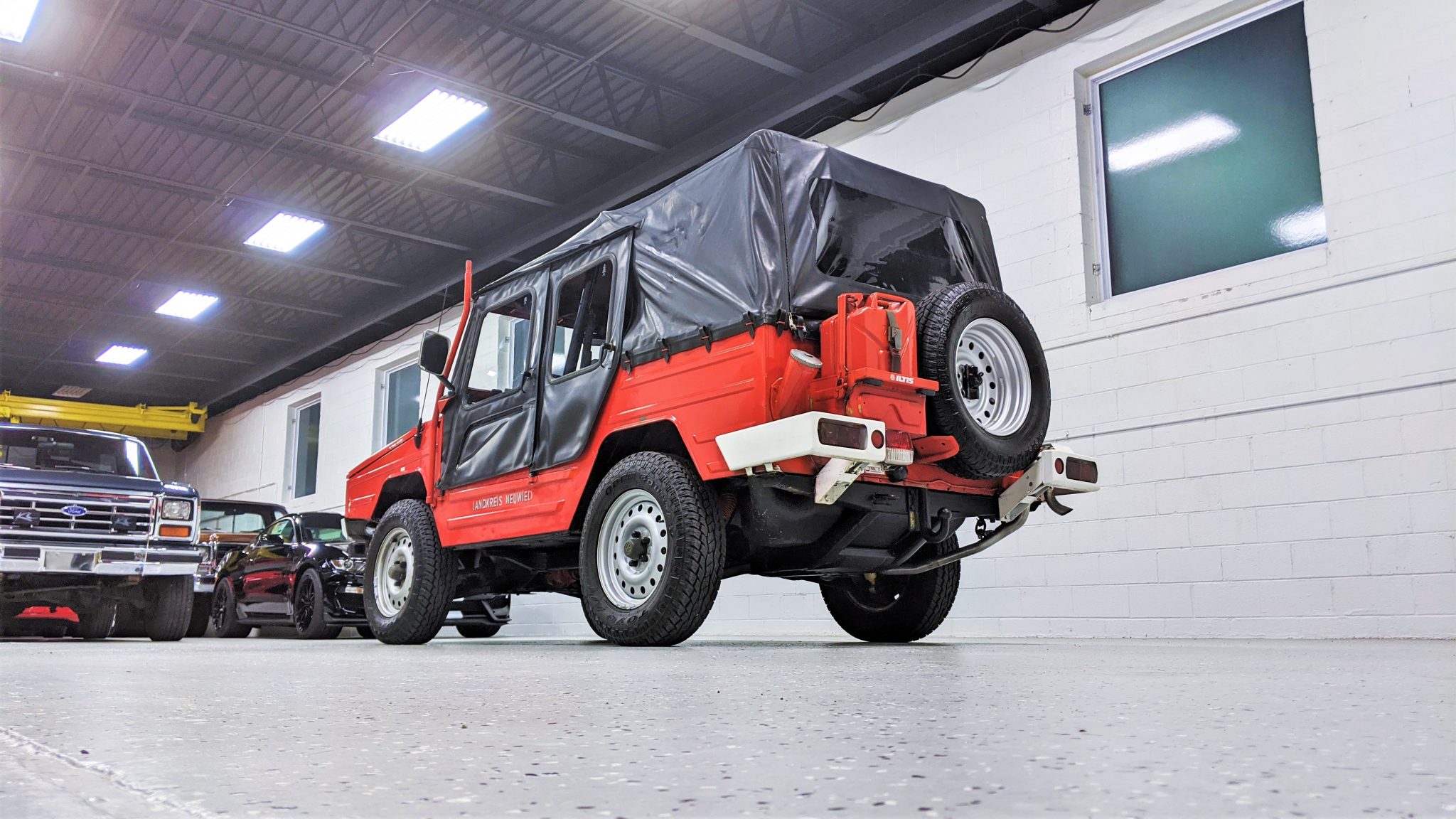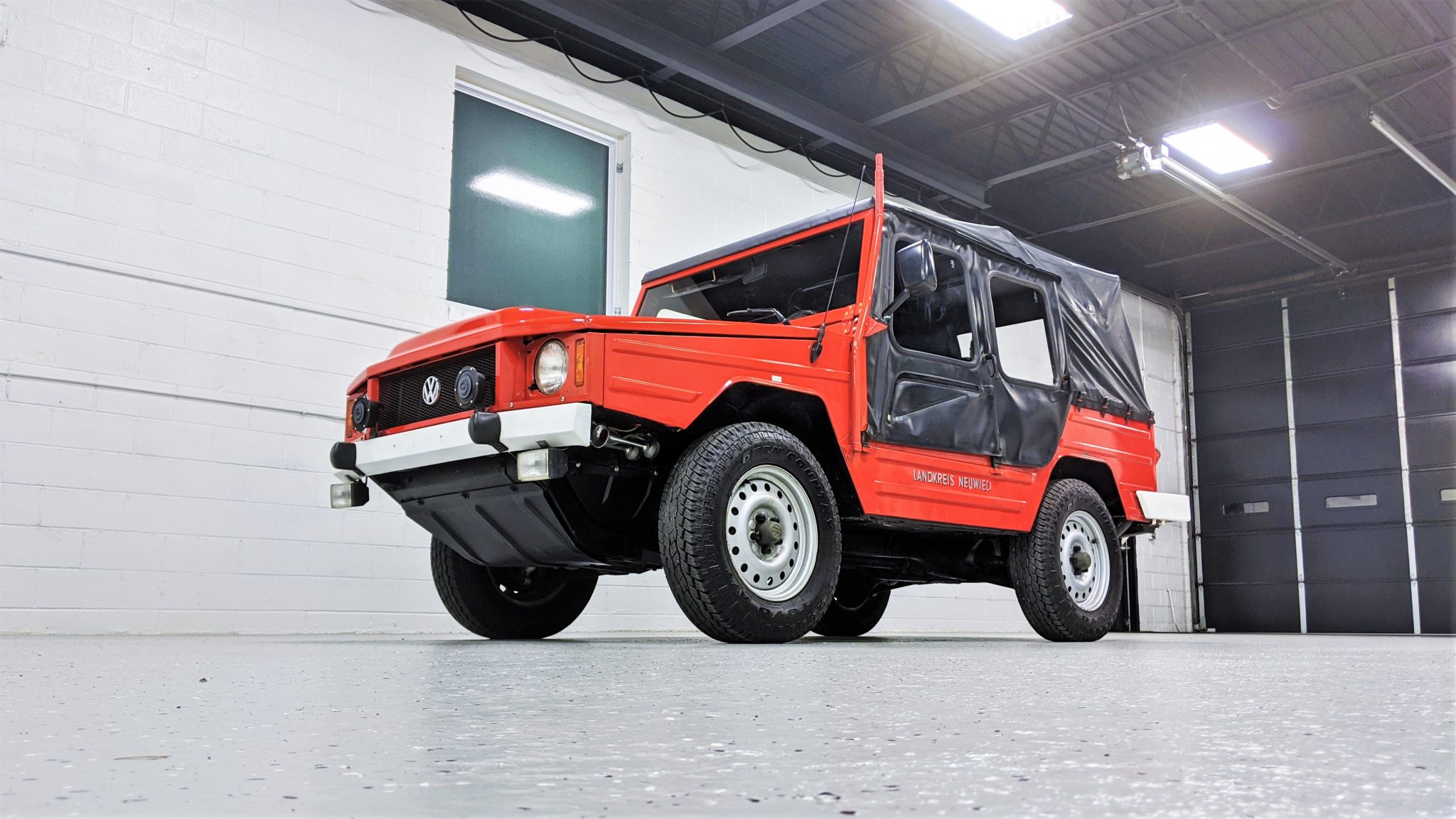 Painted 16″ steel wheels are mounted with 205R16 Toyo Open Country all-terrain tires. Four-wheel drum brakes are accompanied by four-wheel independent suspension featuring control arms, transverse leaf springs, and tubular shocks.