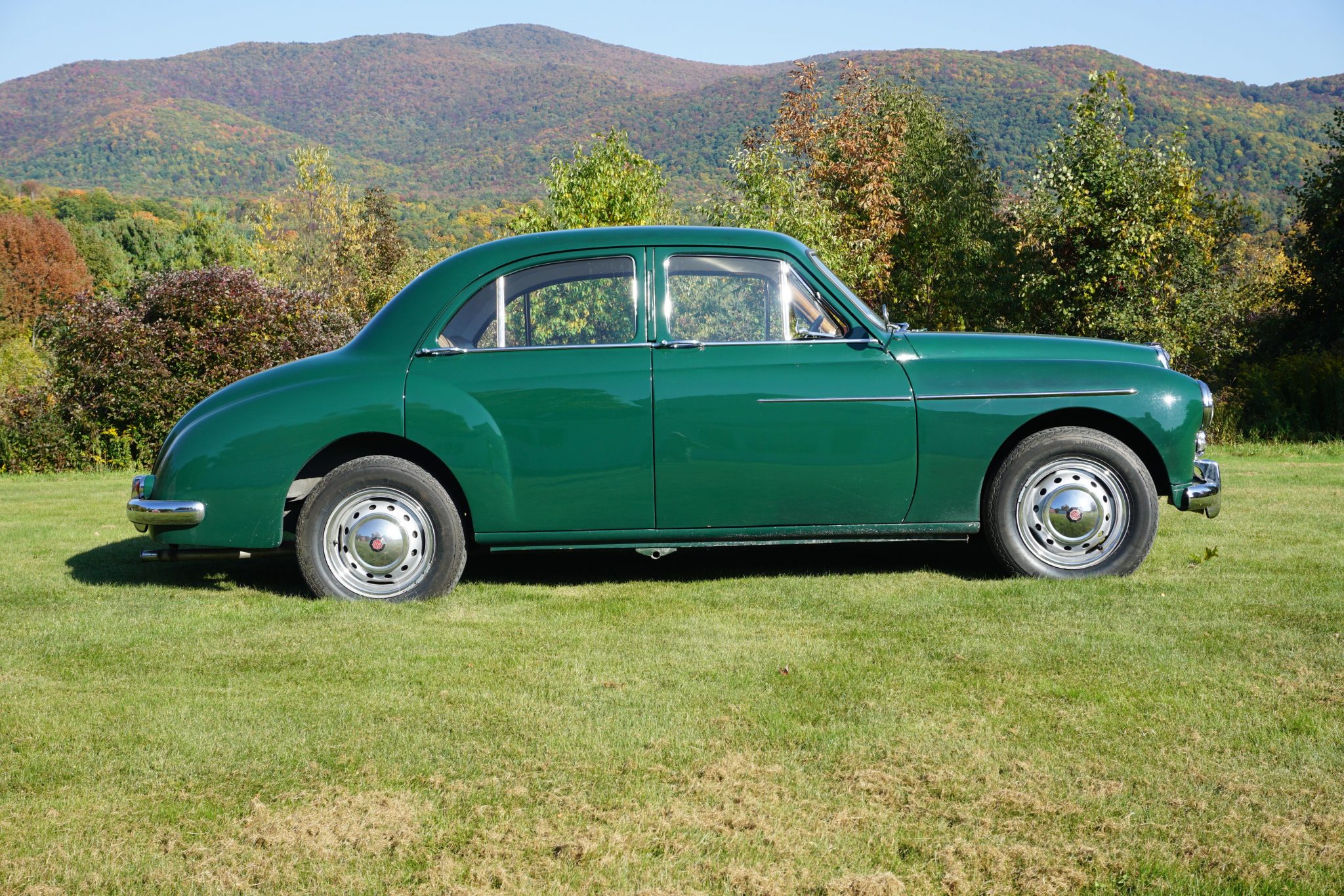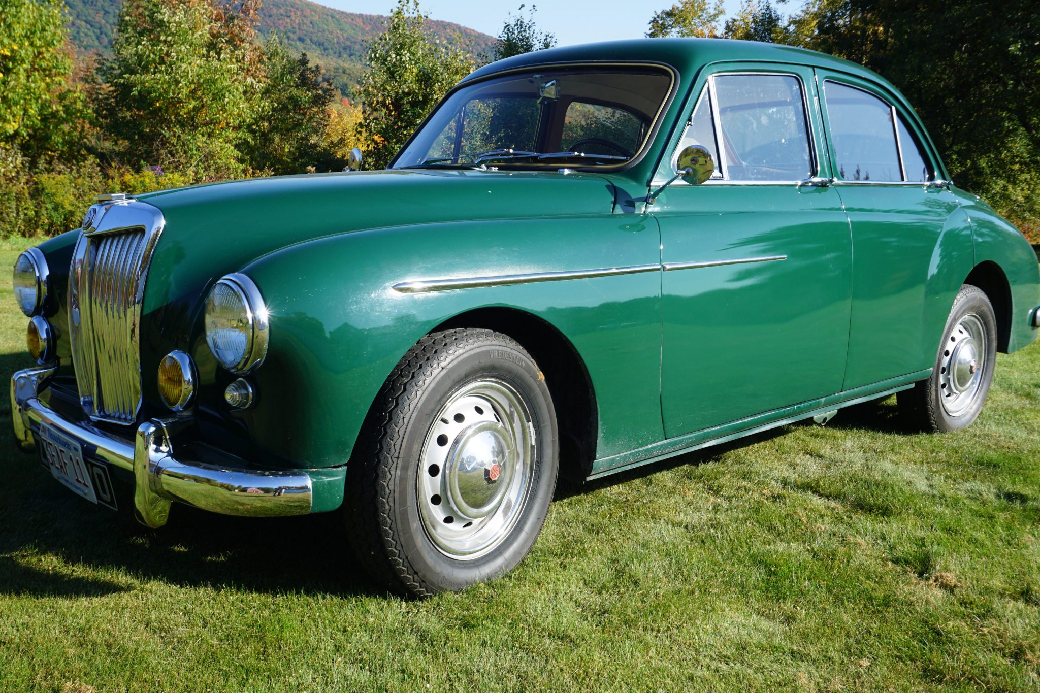 Ventilated 15″ steel wheels feature polished MG hubcaps and wear Vredestein Sprint Classic tires. The car is equipped with front disc brakes reportedly sourced from an MGB. The front upper control arms were repaired and modified in August 2020.