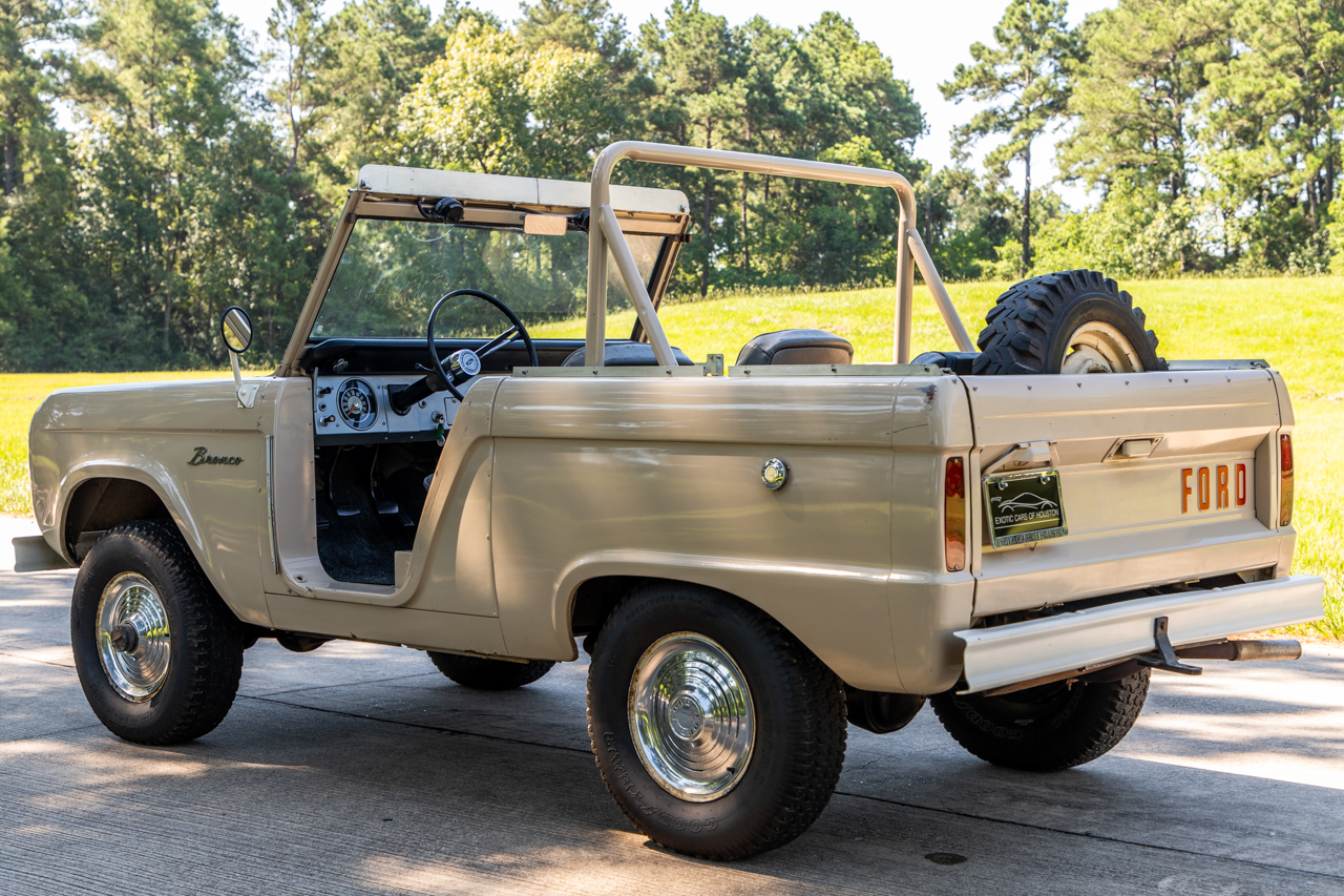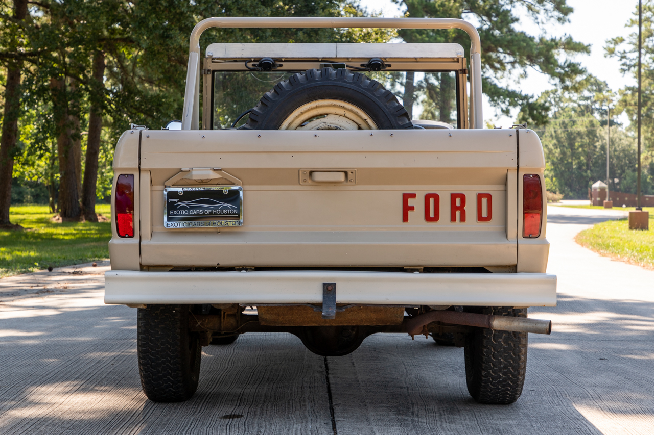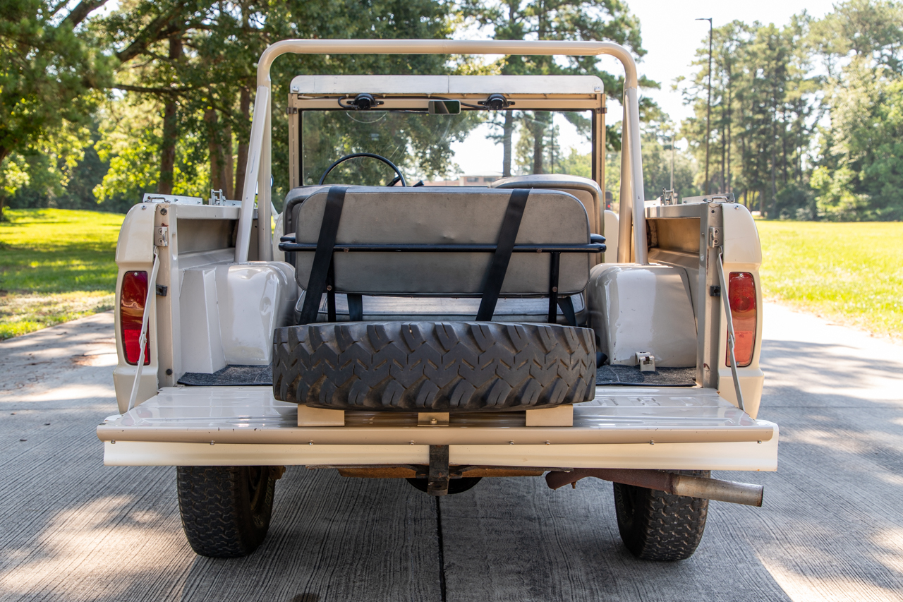 White-painted 15″ steel wheels show lip corrosion and are mounted with circular-patterned polished hubcaps. The wheels wear 235/75 Goodyear Wrangler tires, and a spare is mounted to the inside of the tailgate. The front axle is equipped with locking hubs.
