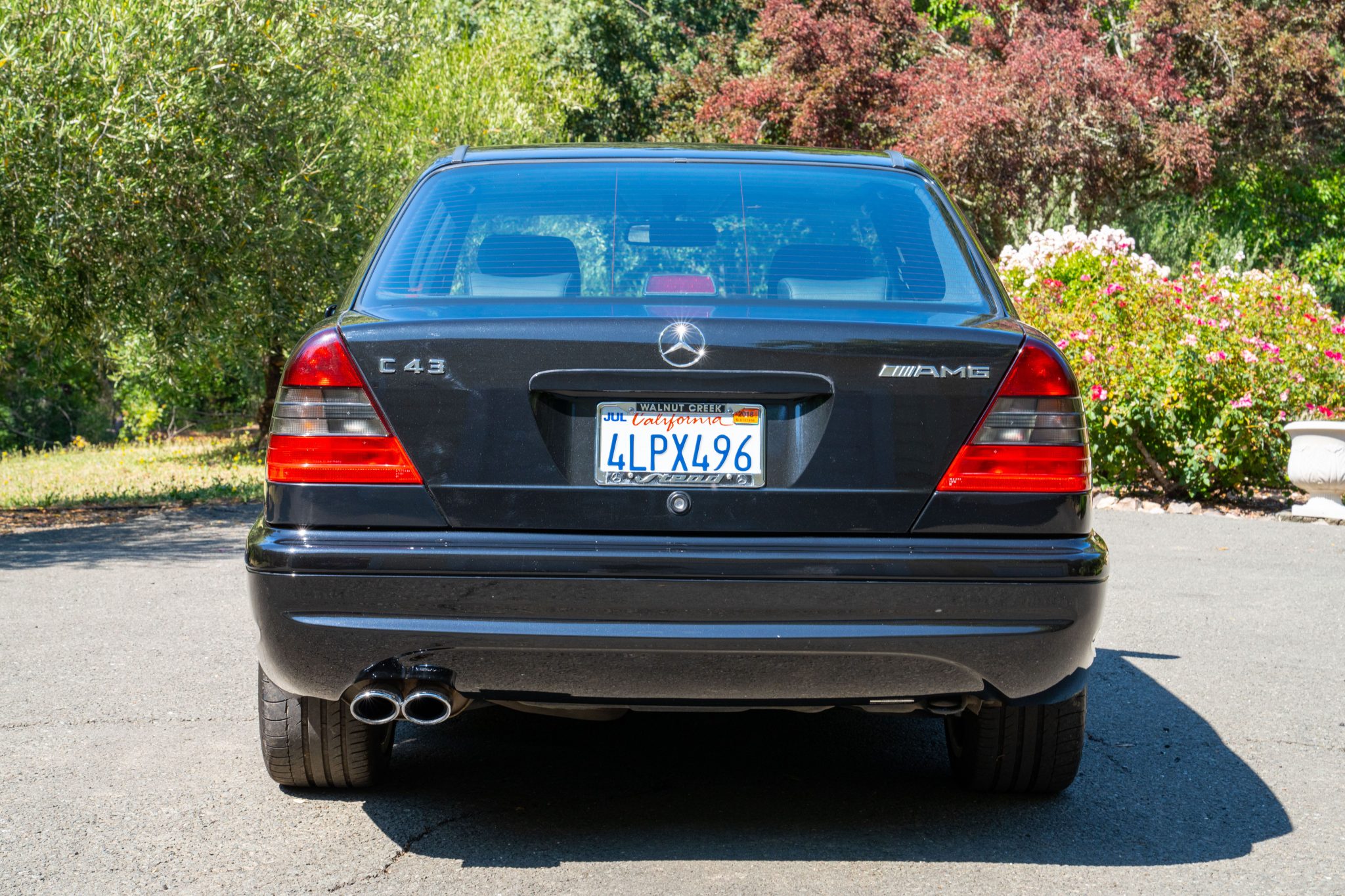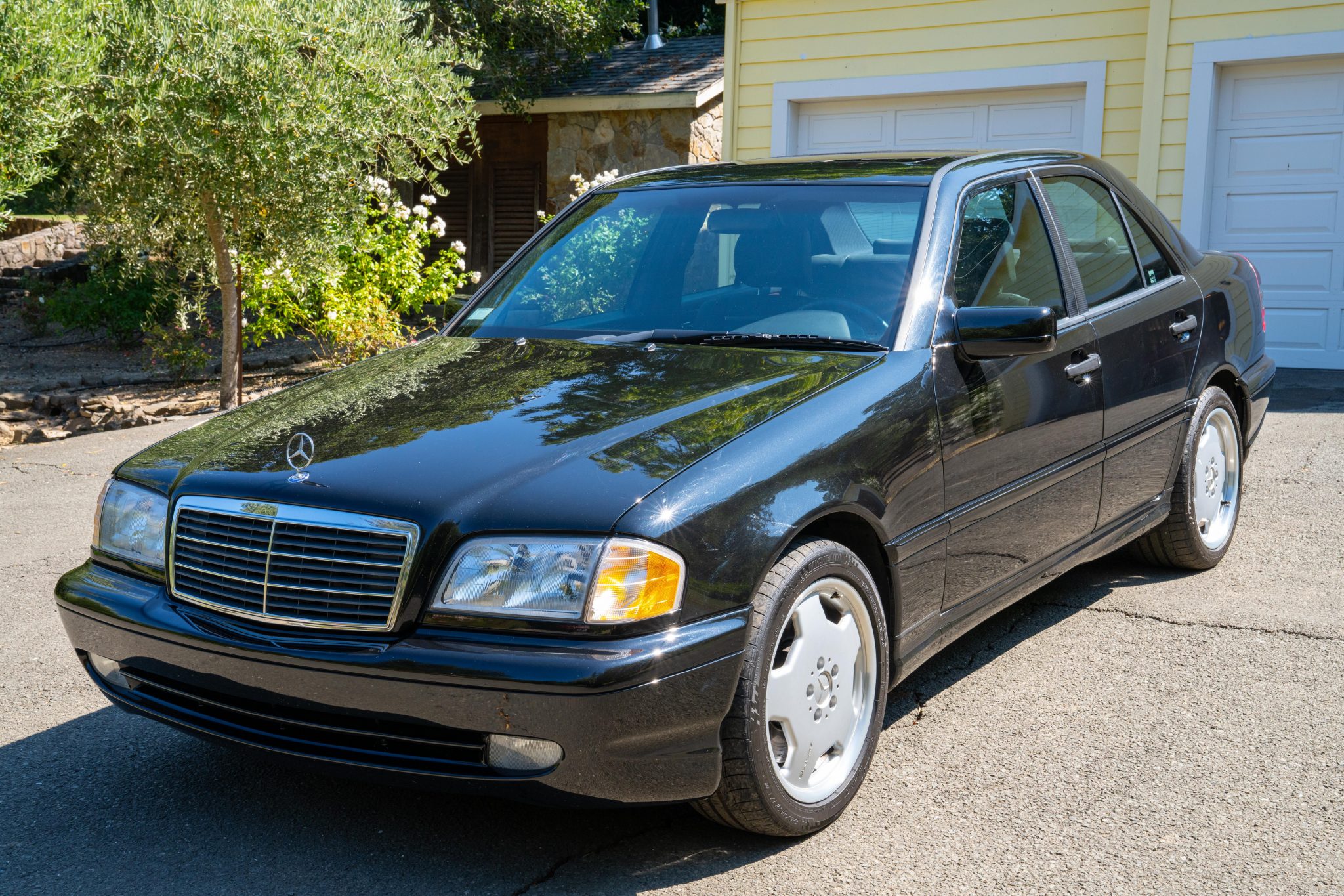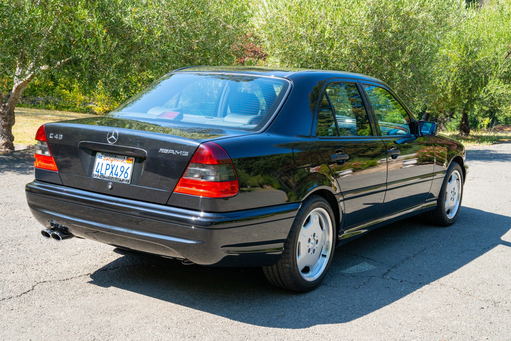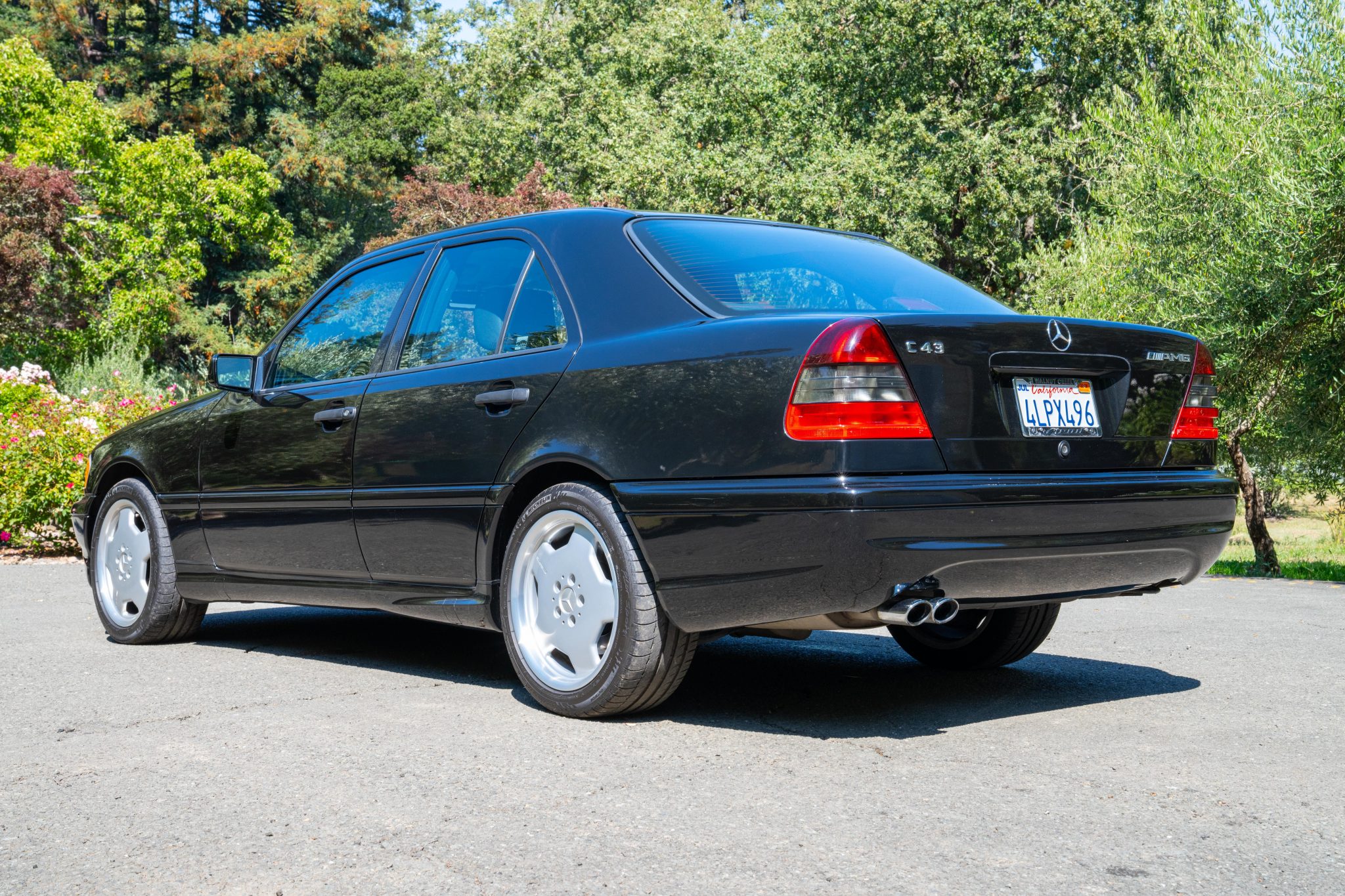 Silver-finished 17” Monoblock wheels show AMG casting marks and wear Michelin Pilot Sport tires measuring 225/45 up front and 245/40 out back. A full-size spare wheel and tire are stored in the trunk, and additional equipment includes an Electronic Stability Program (ESP).