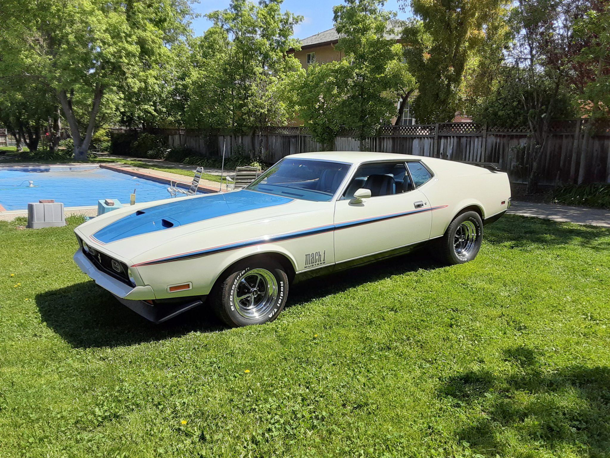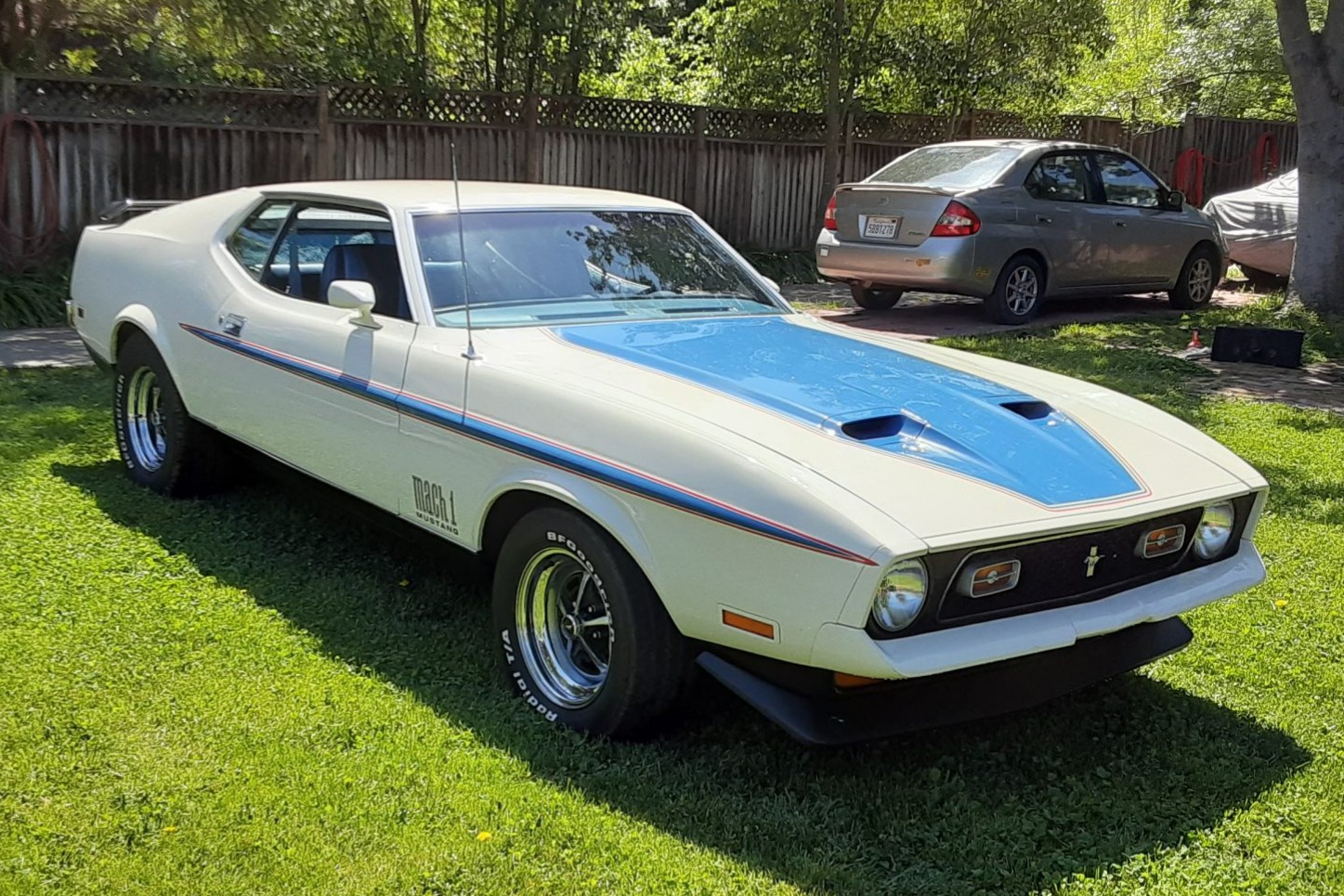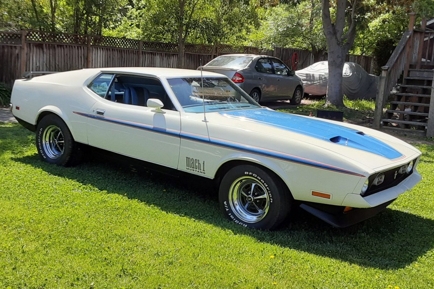 Exterior details include front and rear spoilers, body-colored mirrors, grille-mounted sport lamps, a mesh rear grille, and Mach 1 graphics. Chrome 15” Magnum 500 wheels with black recesses are wrapped in BFGoodrich Radial T/A tires.