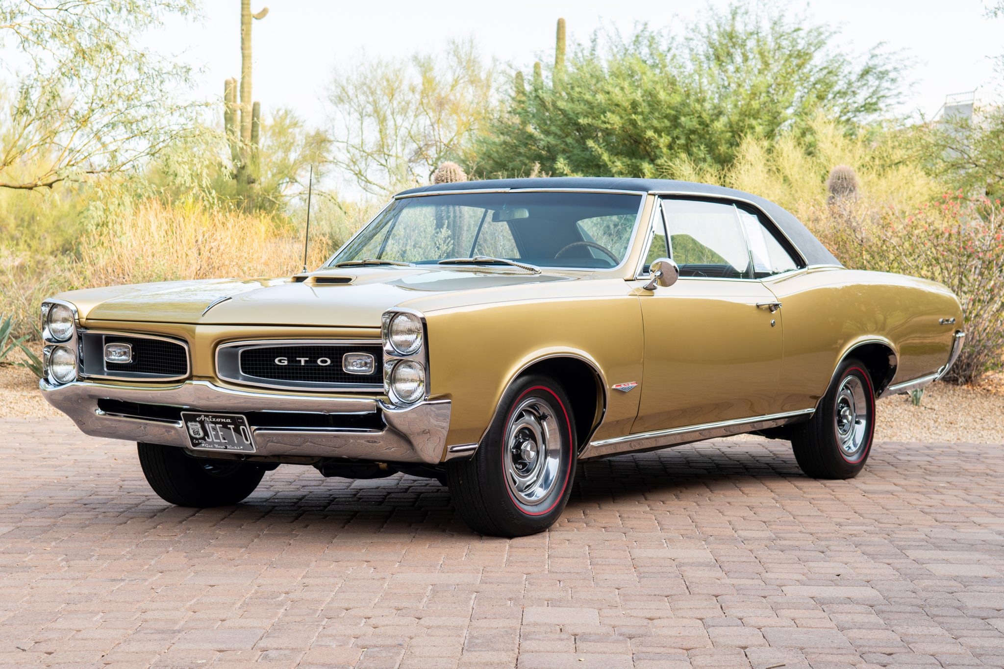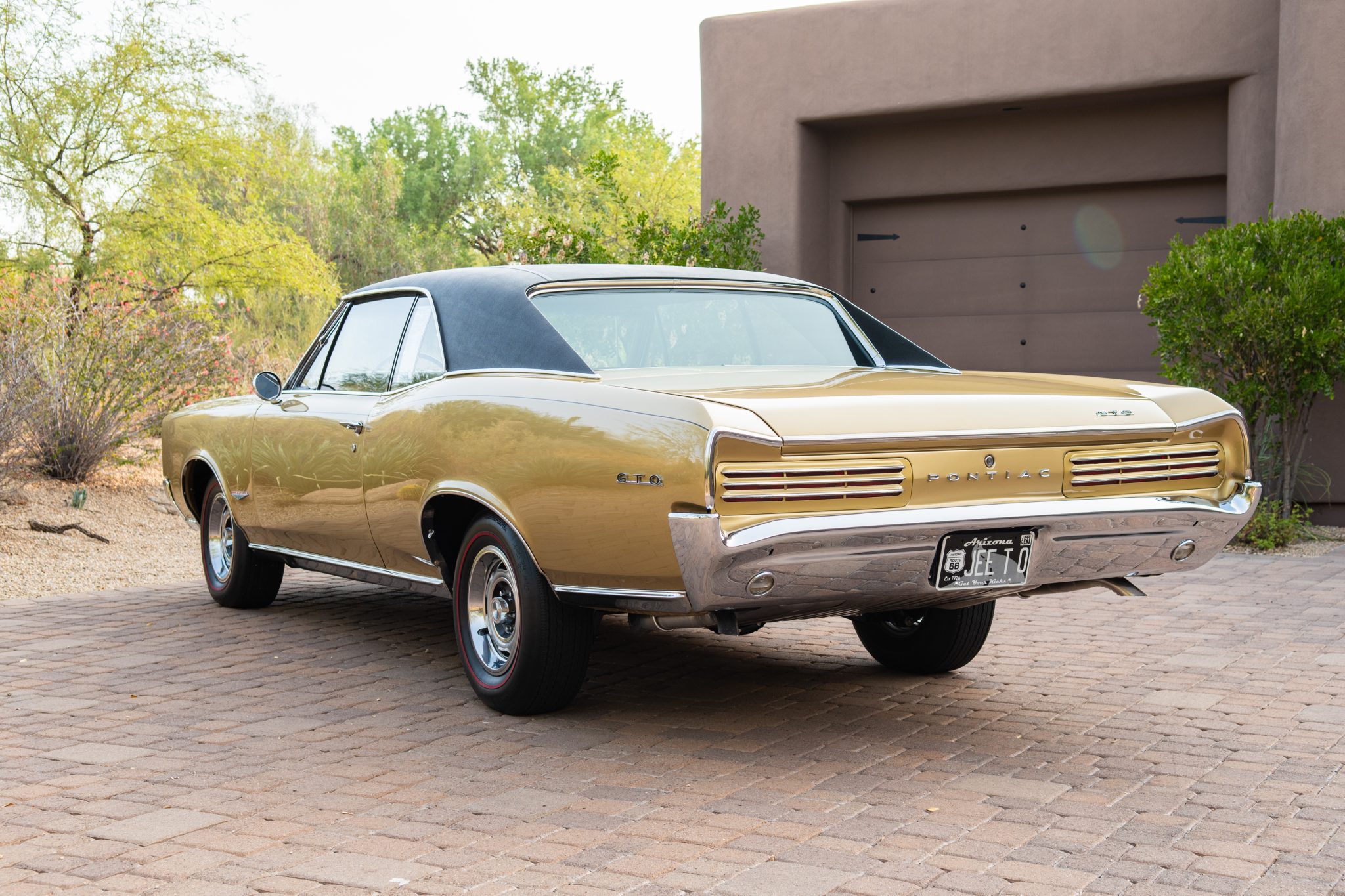 14″ Rally wheels are wrapped in reproduction Firestone redline tires that were sourced from Coker Tire in 2019. Power steering was factory equipment, and braking is handled by power-assisted four-wheel drums.