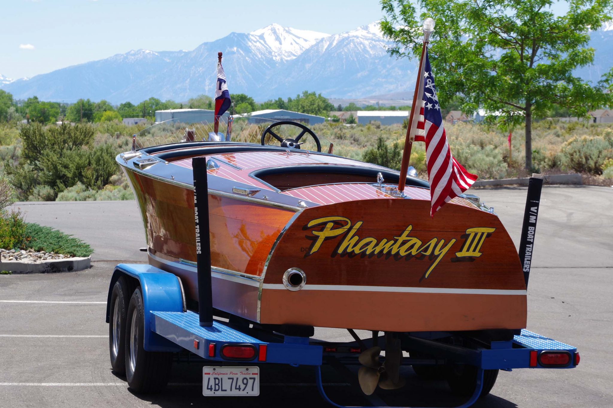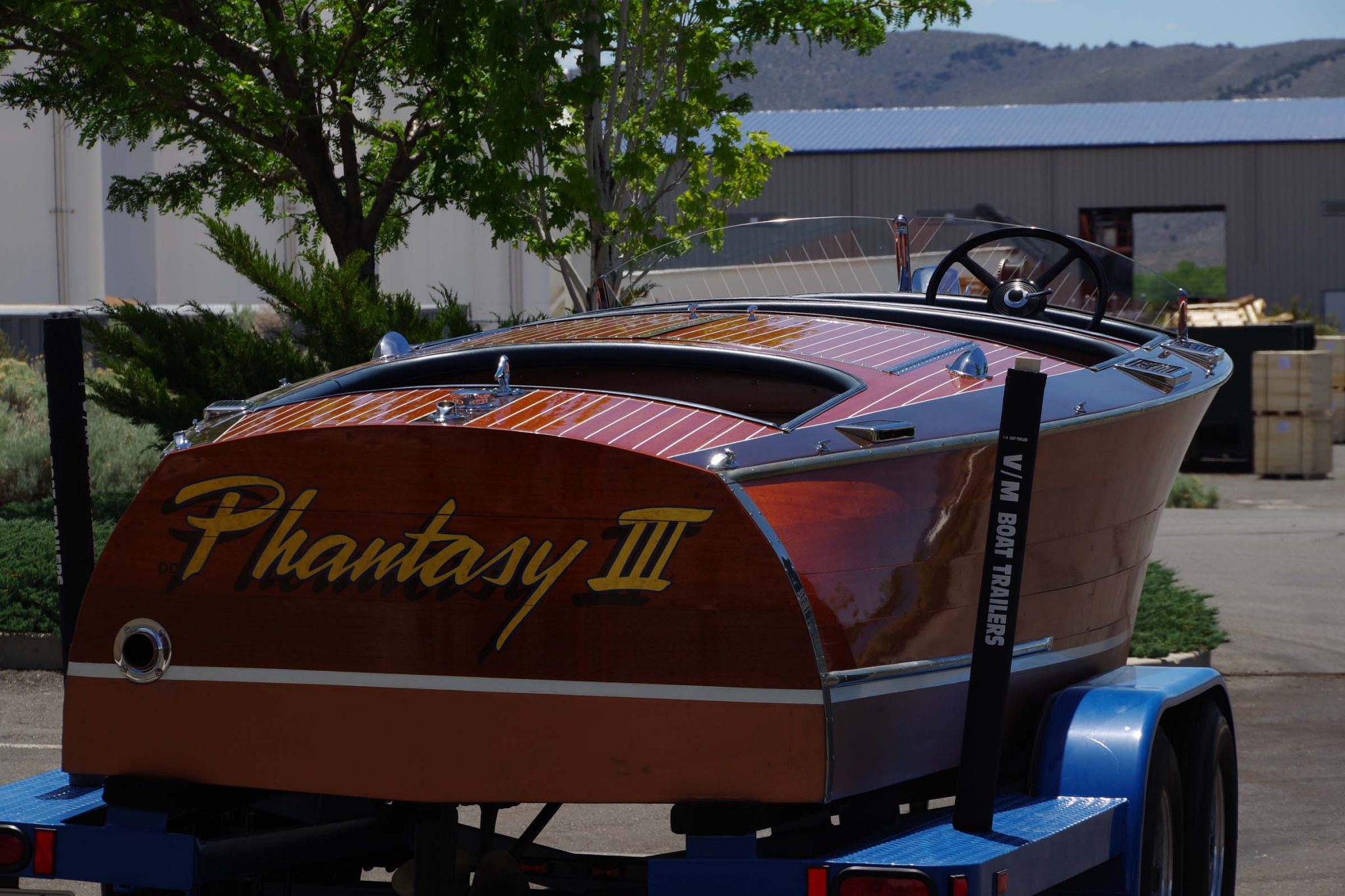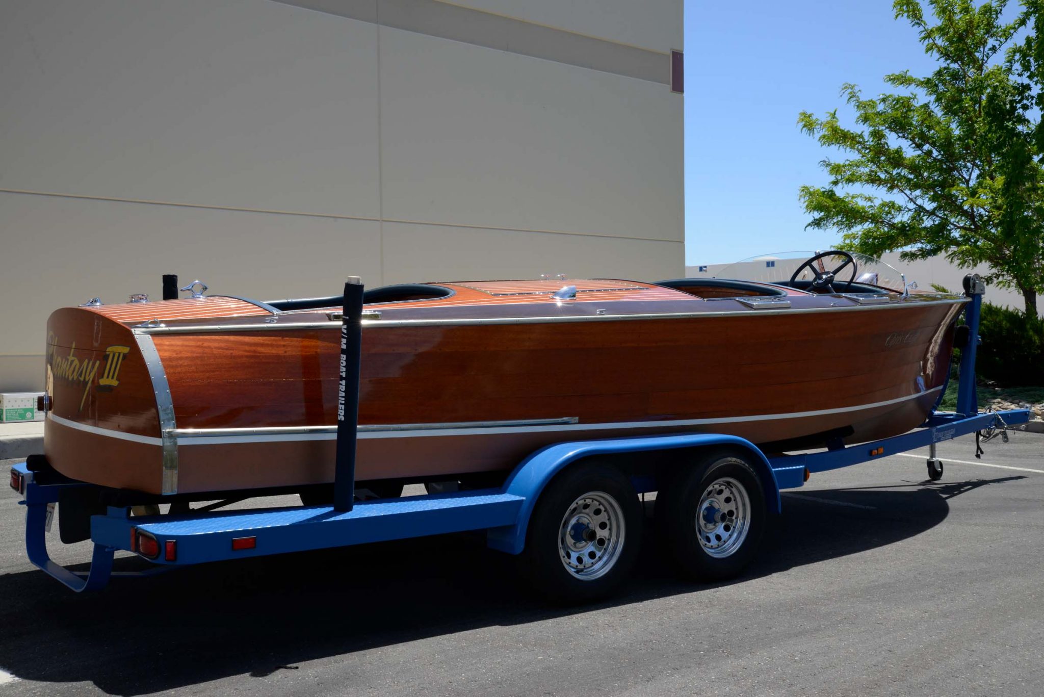 The vessel’s registration number and marque are painted on the sides, while its name, Phantasy III, can be found on the transom. Note the rounded, “barrel back” stern shape.