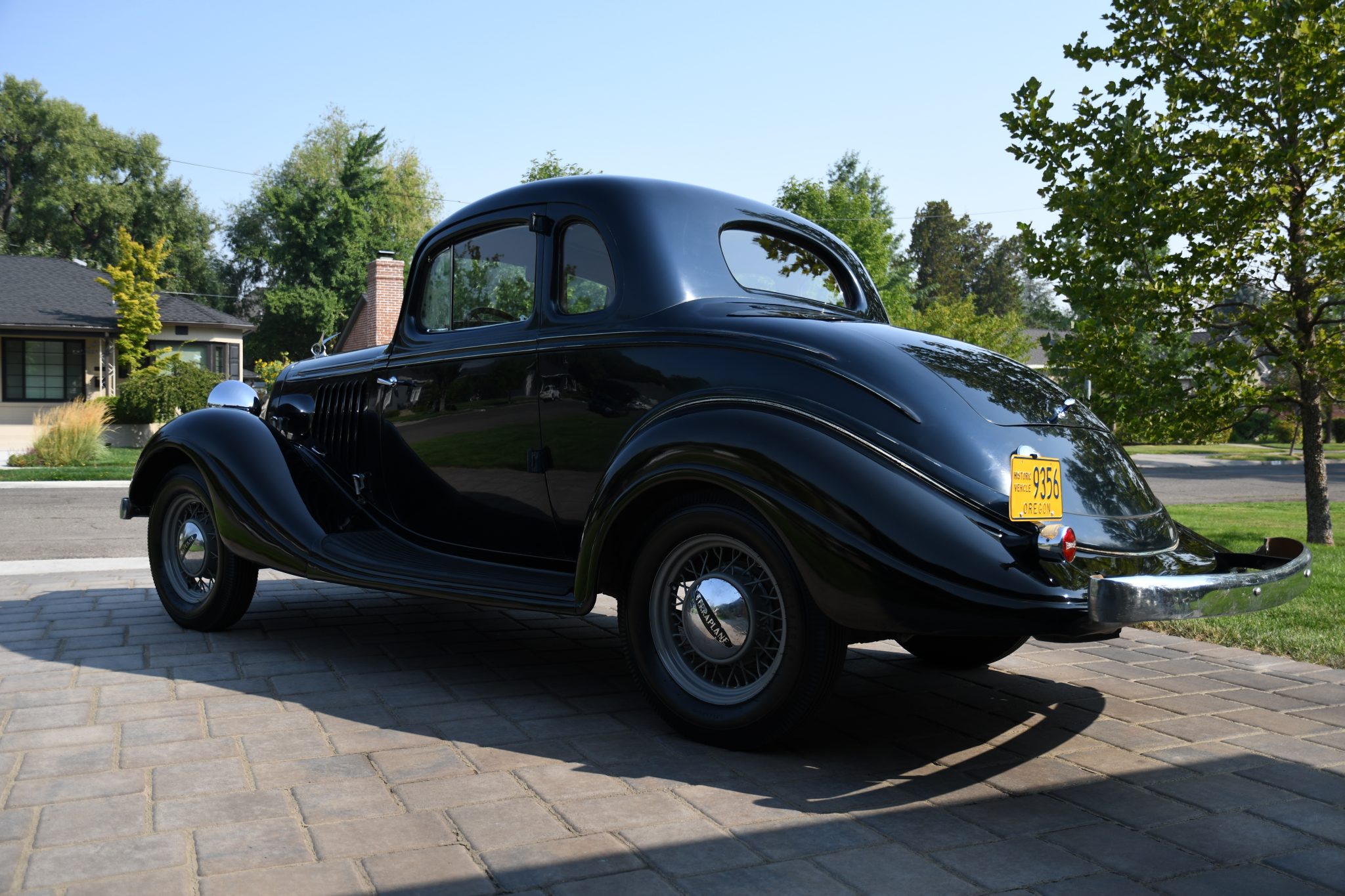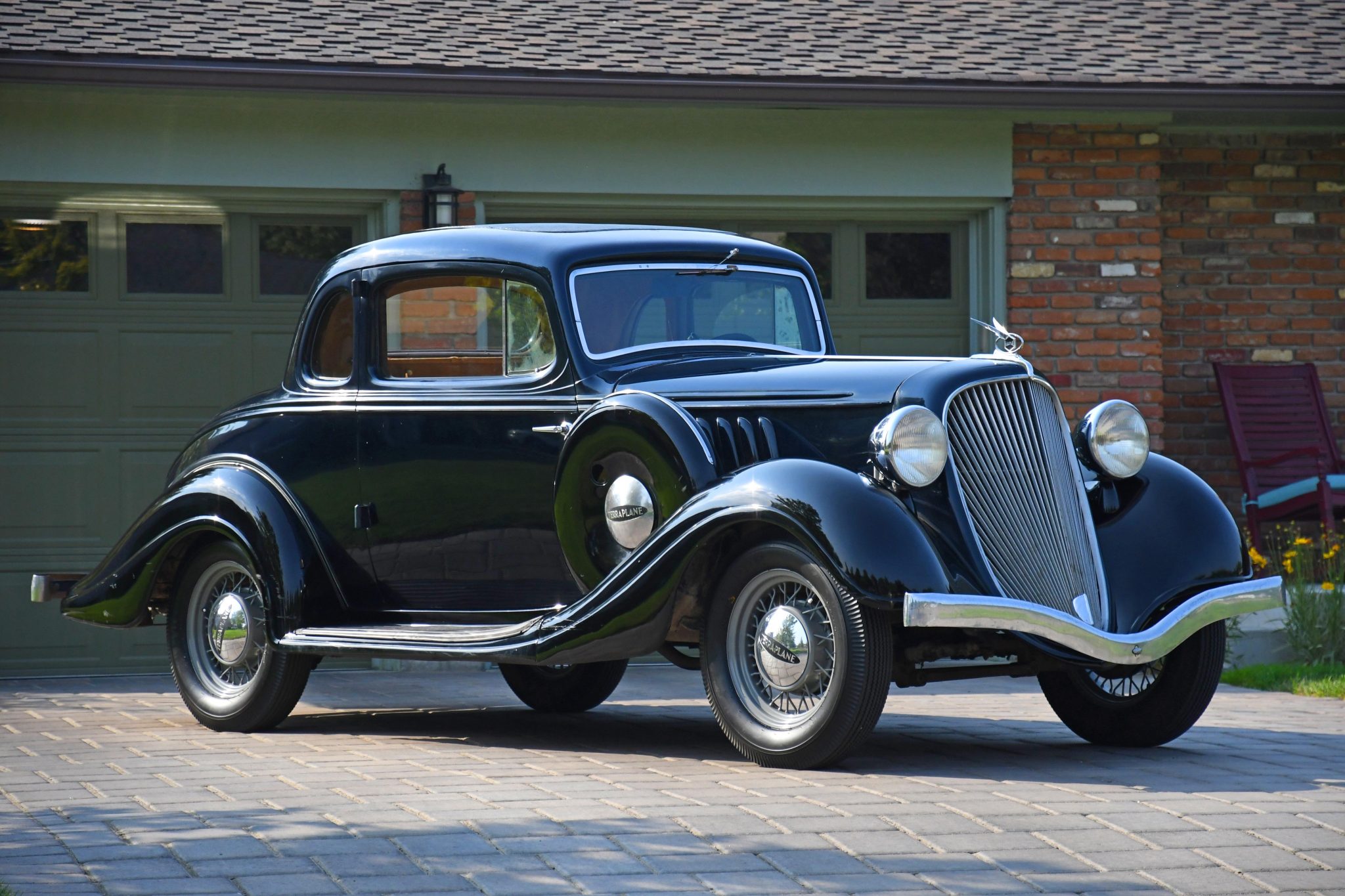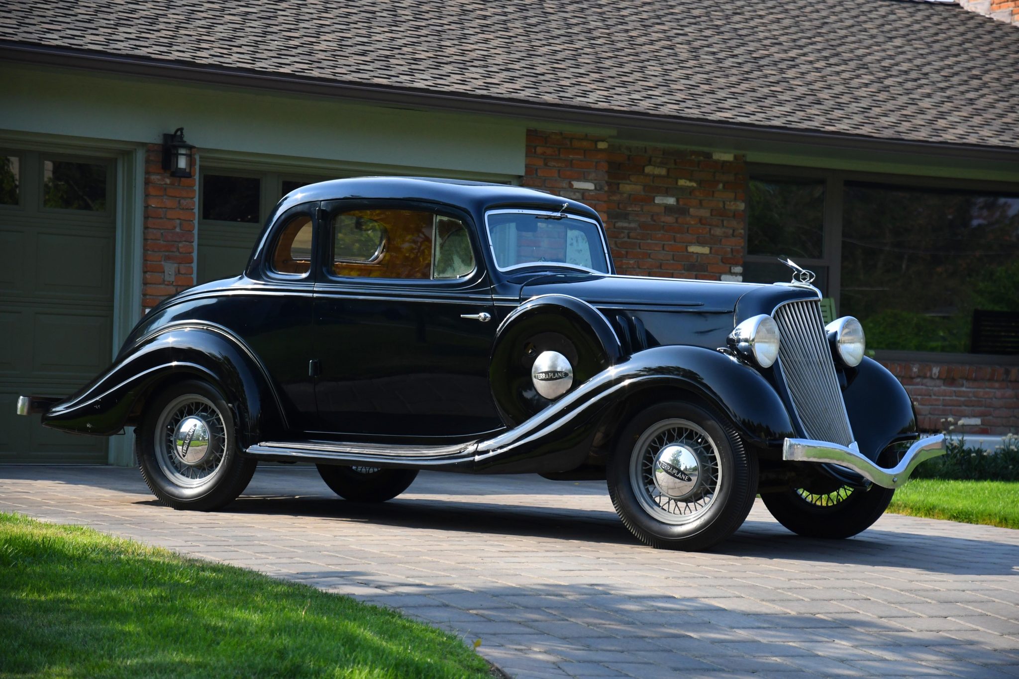 Wire wheels with a gray powdercoated finish wear Terraplane-branded hubcaps and older 17″ Coker/Firestone tires with pie-crust sidewalls, including a spare wheel housed within the lockable carrier.