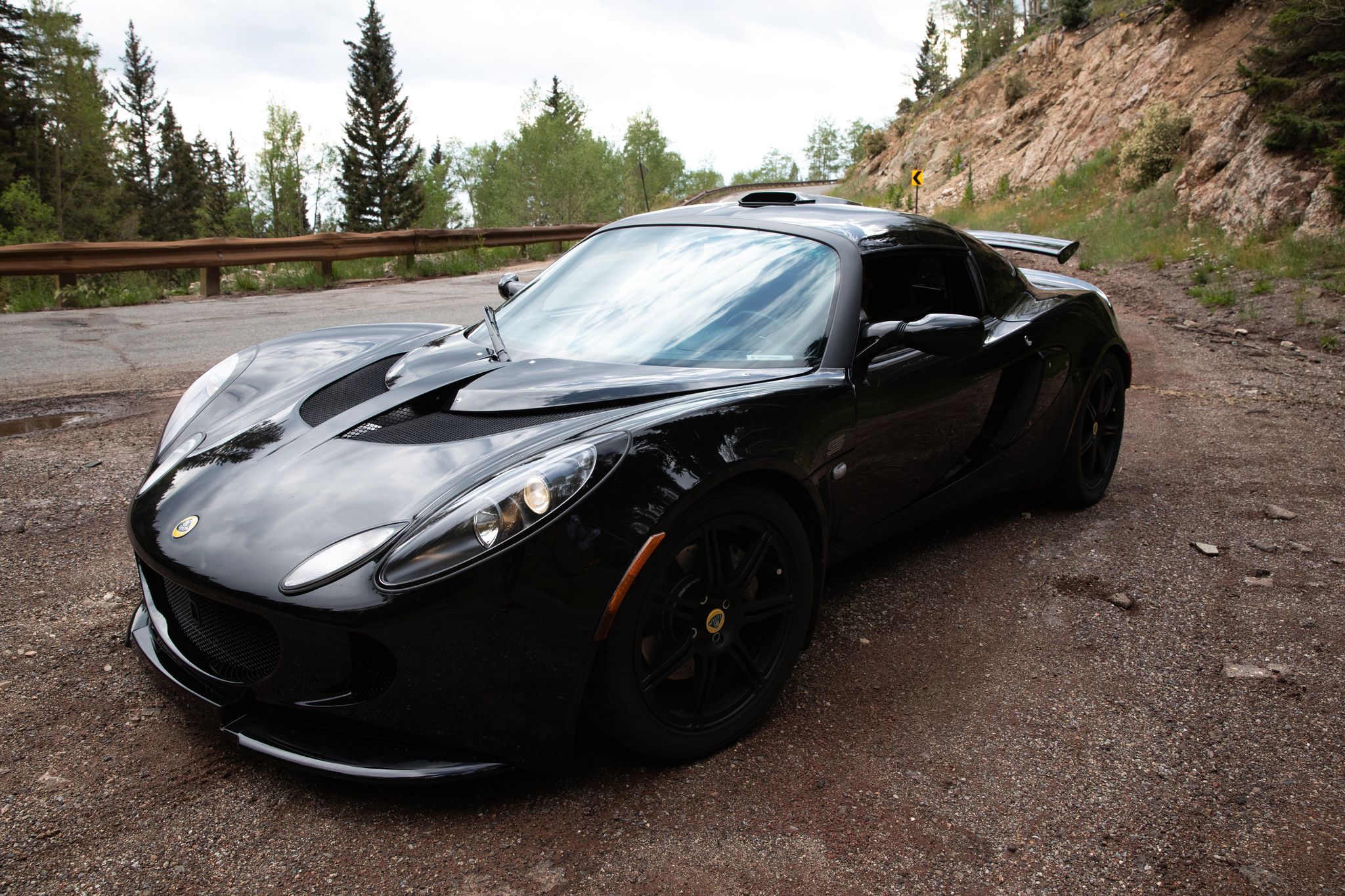 Factory paired-spoke forged wheels are finished in black and measure 16″ up front and 17″ out back, and are mounted with Bridgestone Potenza RE17R tires. Curb marks are shown up close in the gallery below. The Exige is equipped with stiffer Eibach spring and Bilstein dampers than the contemporary Elise, and braking is handled by cross-drilled and vented rotors at all corners.