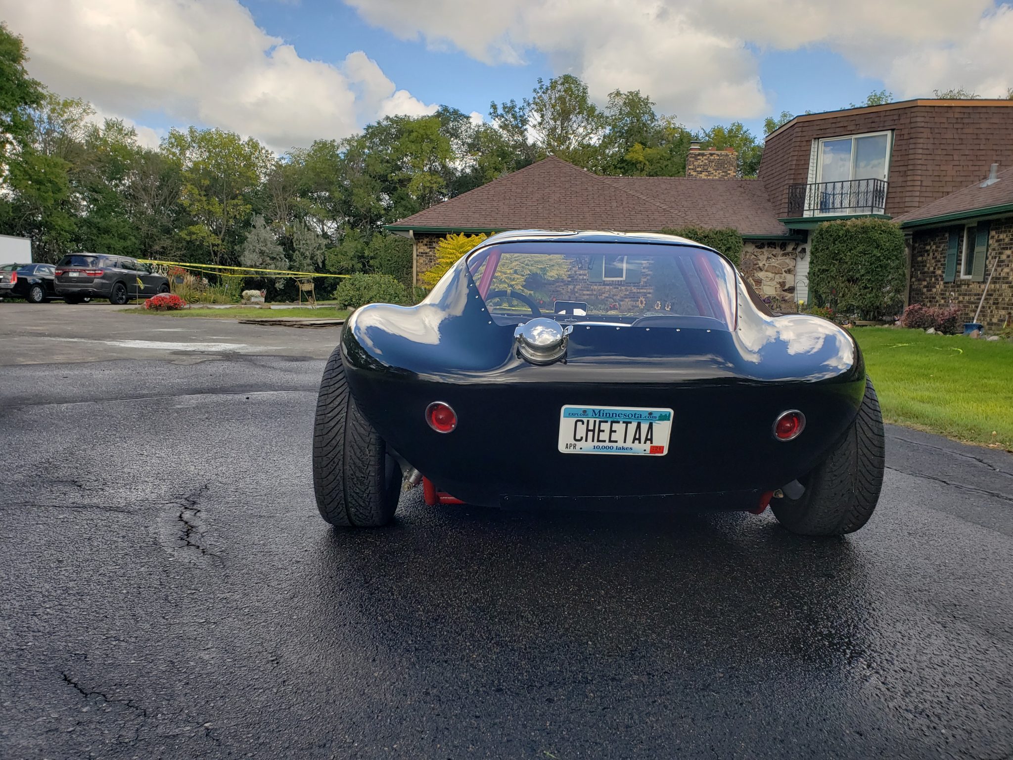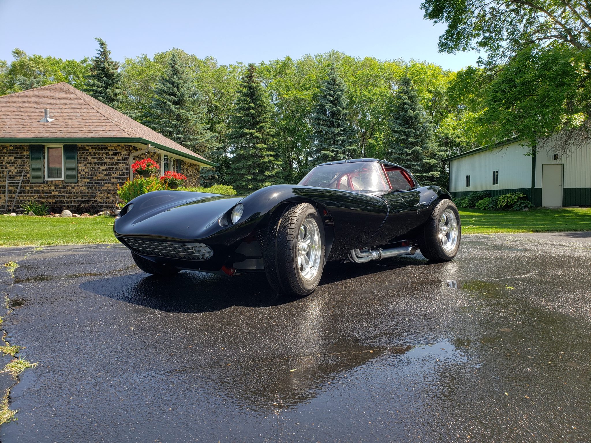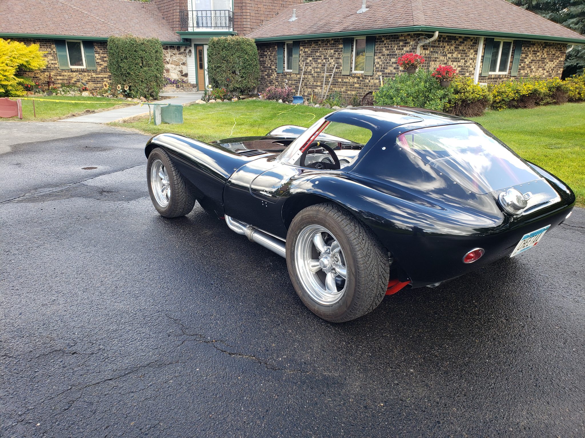 16″ American Racing Torq Thrust wheels are wrapped in 225/55 Kuhmo Ecsta Supra tires. The chassis is fitted with rack-and-pinion steering, C4 Corvette front spindles, C4 Corvette disc brakes with finned aluminum calipers, a C4 Corvette rear differential, and adjustable coilovers on all four corners.