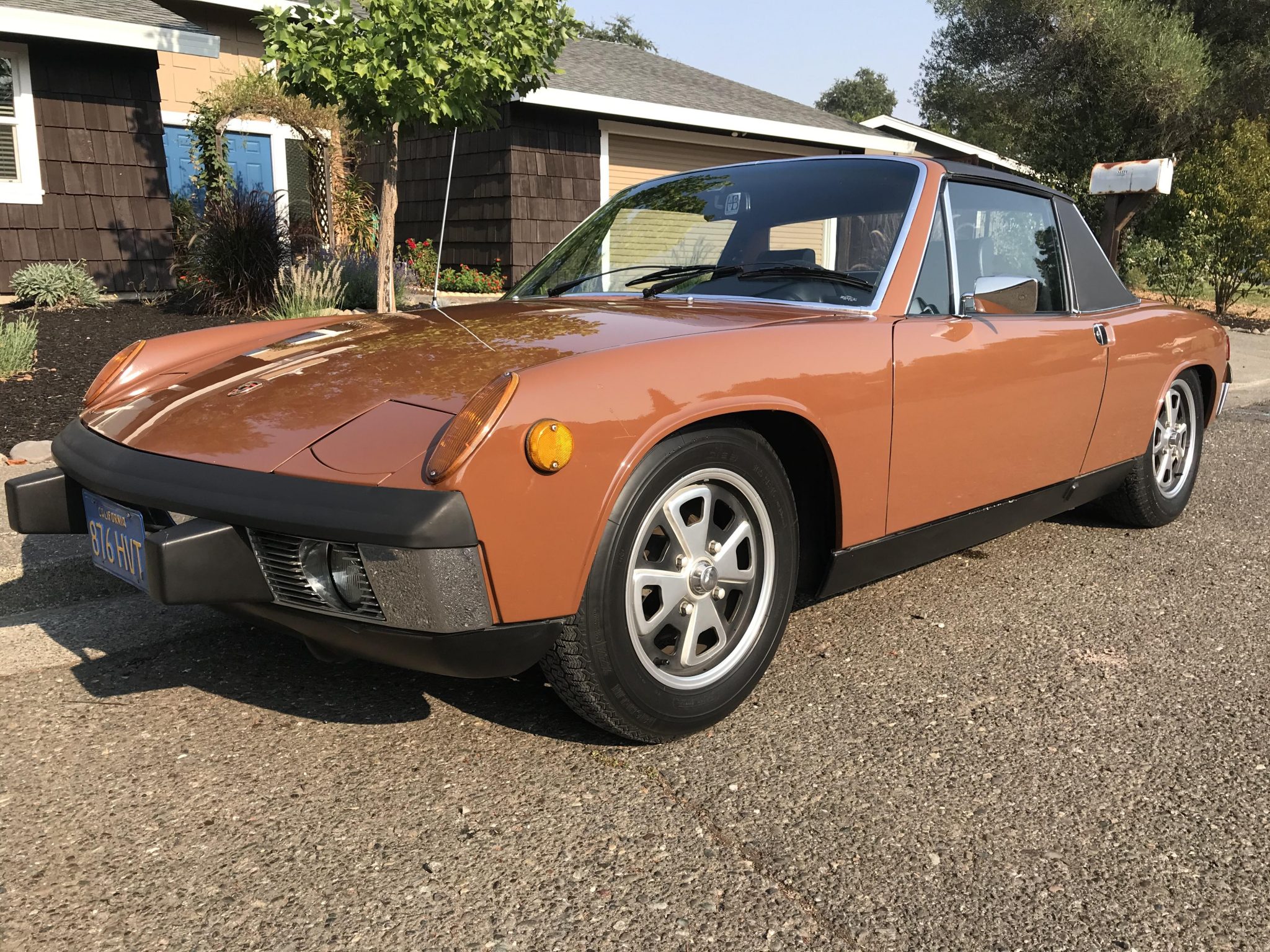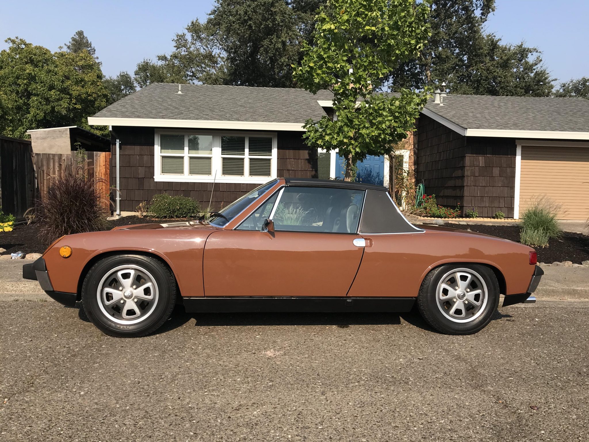 The 15″ Fuchs wheels wear a black and silver finish and Merit tires, and a Goodyear spare tire is mounted in the front trunk. Disc brakes and independent suspension are fitted at all four corners.