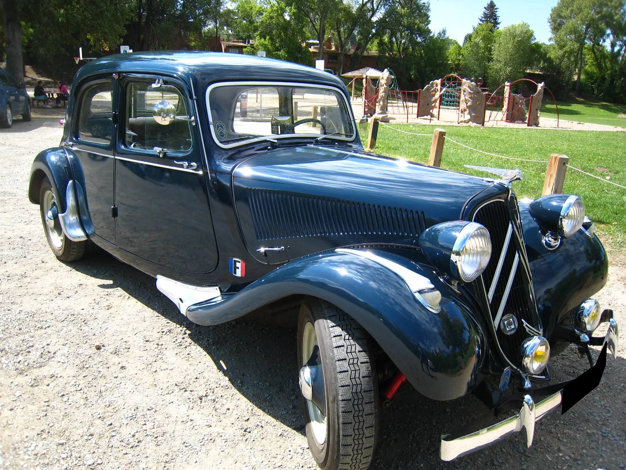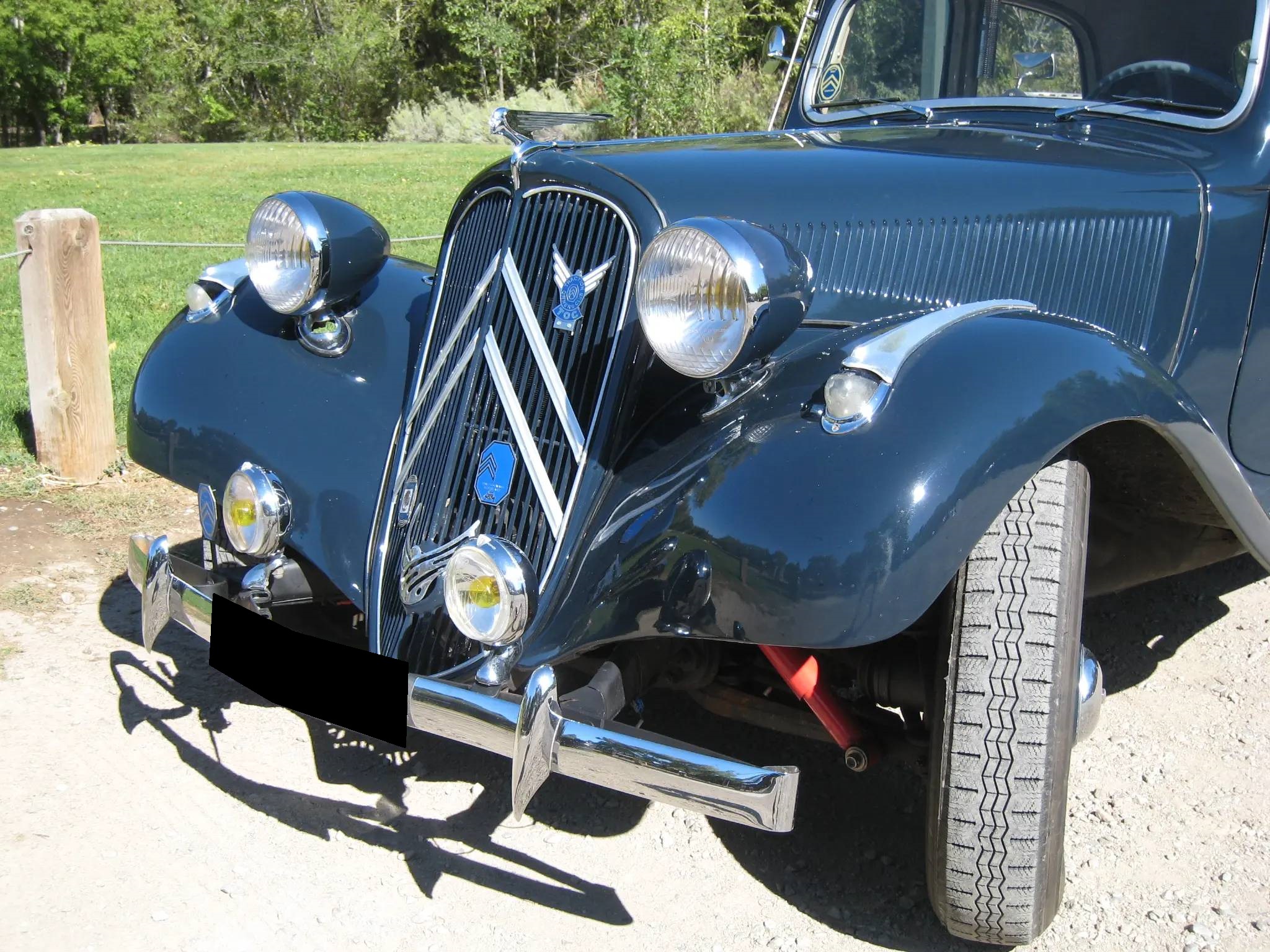 Cream-painted 16″ steel wheels with blue and chrome hubcaps are wrapped in 165-series Michelin tires. The unibody Traction Avant utilized rack-and-pinion steering as well as a four-wheel independent suspension that utilized front and rear torsion bars.
