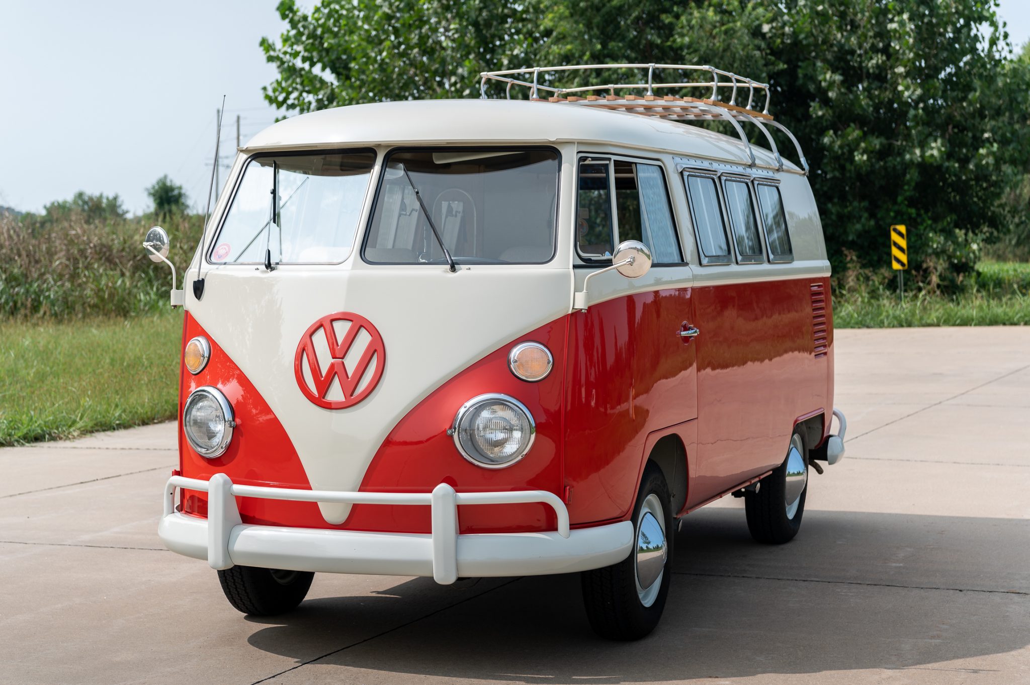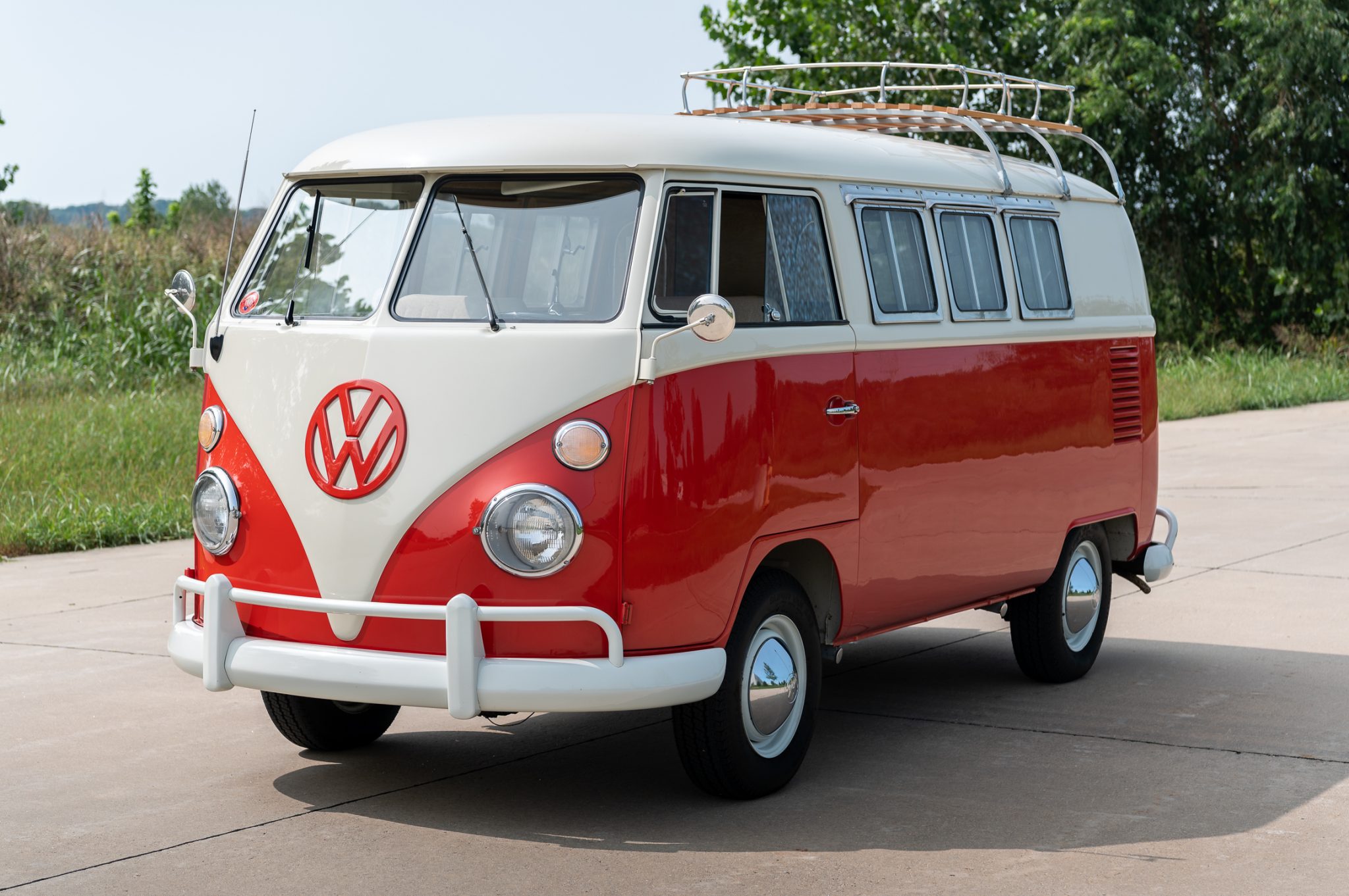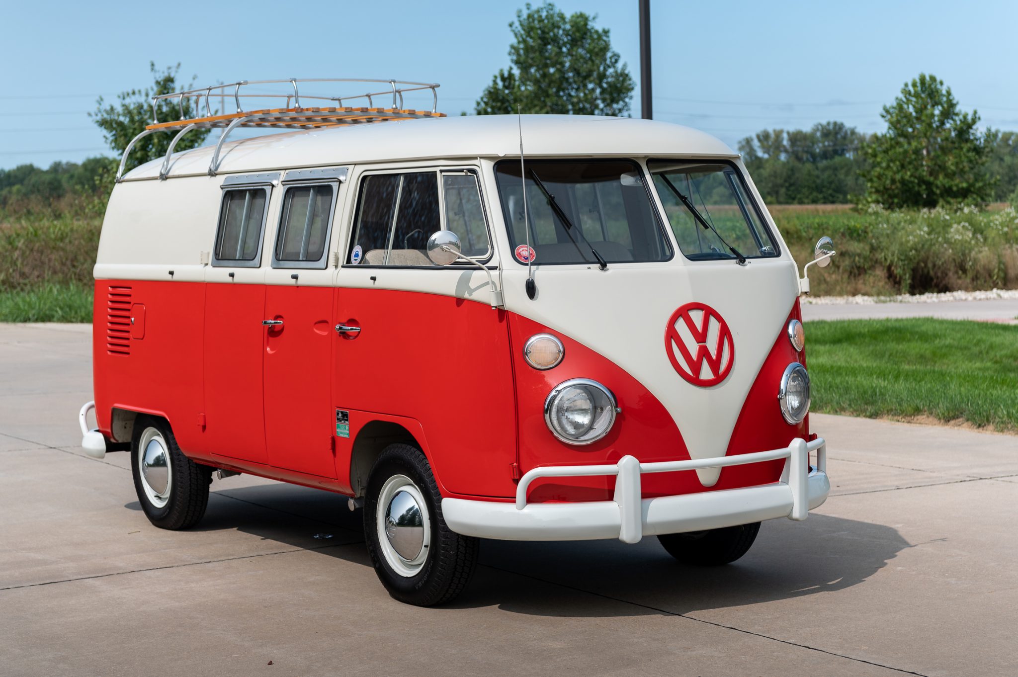 The 14″ painted wheels wear chrome VW hubcaps and 185-series Yokohama Super Van 356 tires. All four wheel cylinders and the front brake shoes were replaced in 2018.