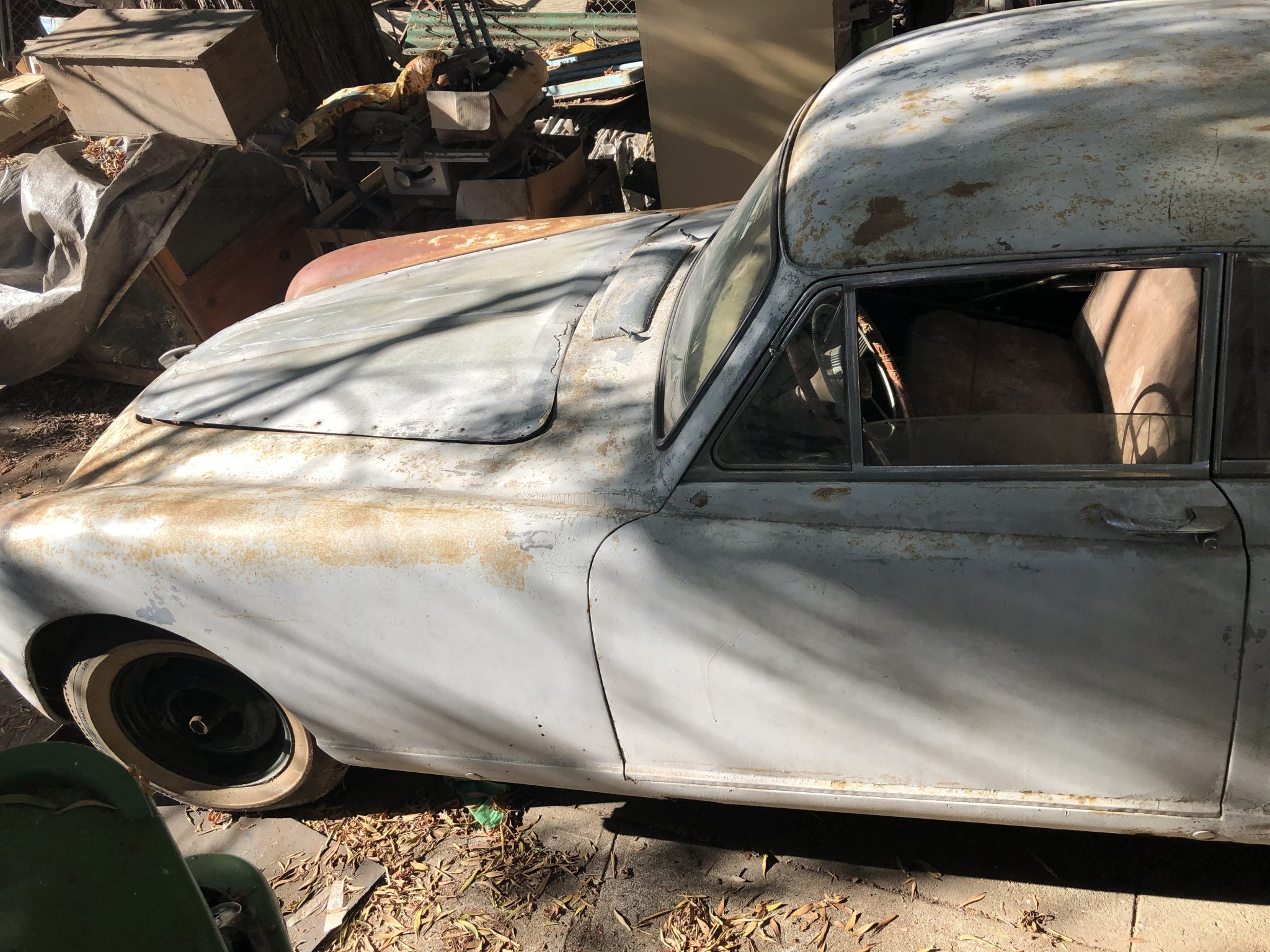 The Nash-Healey utilizes a box-section frame, front trailing-arm suspension derived from the Healey Silverstone, and a coil-sprung solid rear axle. Steel wheels are wrapped in older whitewall tires, and four chrome hubcaps will accompany the car.