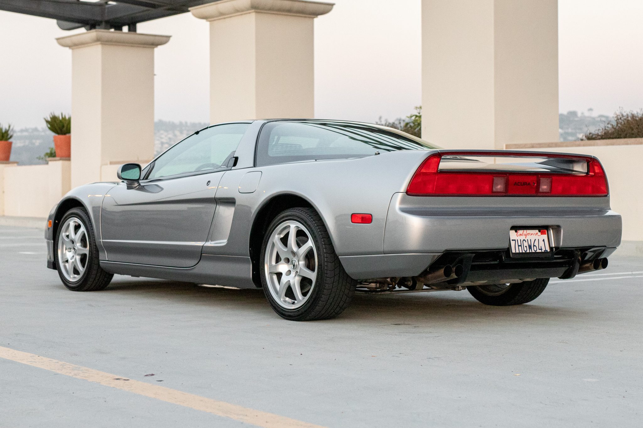 Factory seven-spoke wheels measure 16″ up front and 17″ out back and are wrapped in Bridgestone Potenza RE101 tires, which were reportedly replaced during current ownership and measure 215/45 and 245/40 in the front and rear, respectively. The suspension features front and rear double wishbones, and braking is handled by ventilated discs with NSX-logo calipers at all four corners. The seller notes an area of curb rash on one of the wheels.