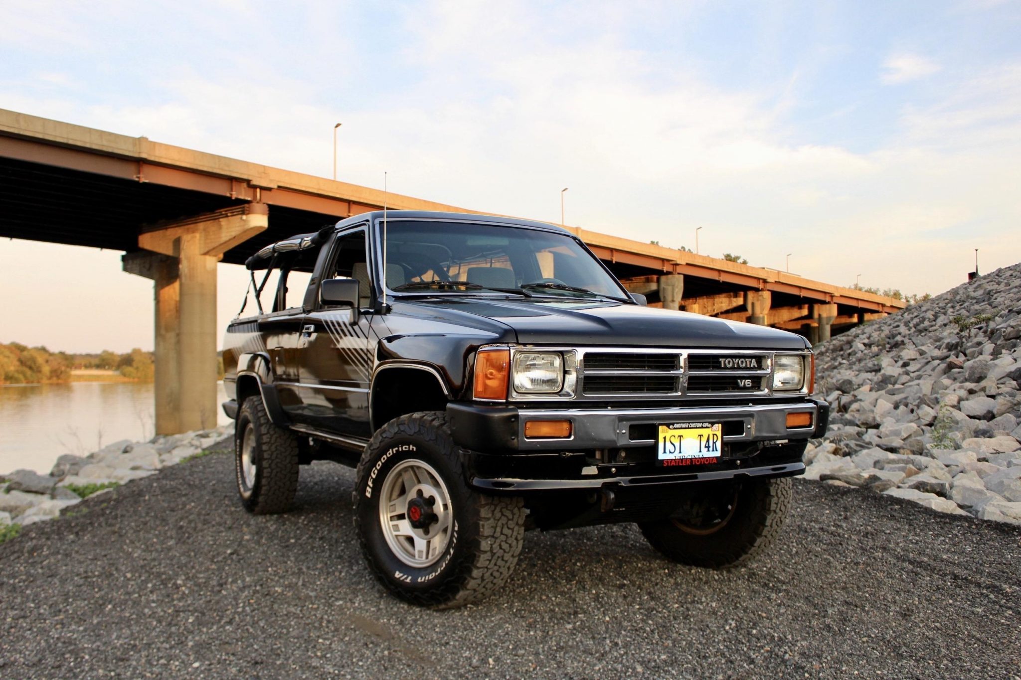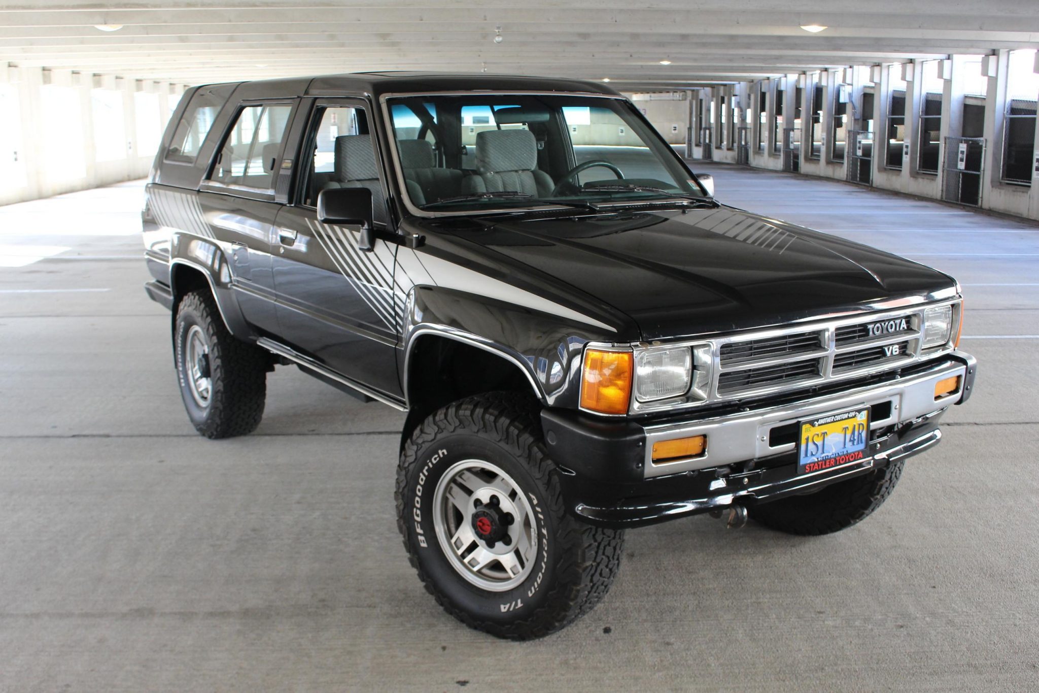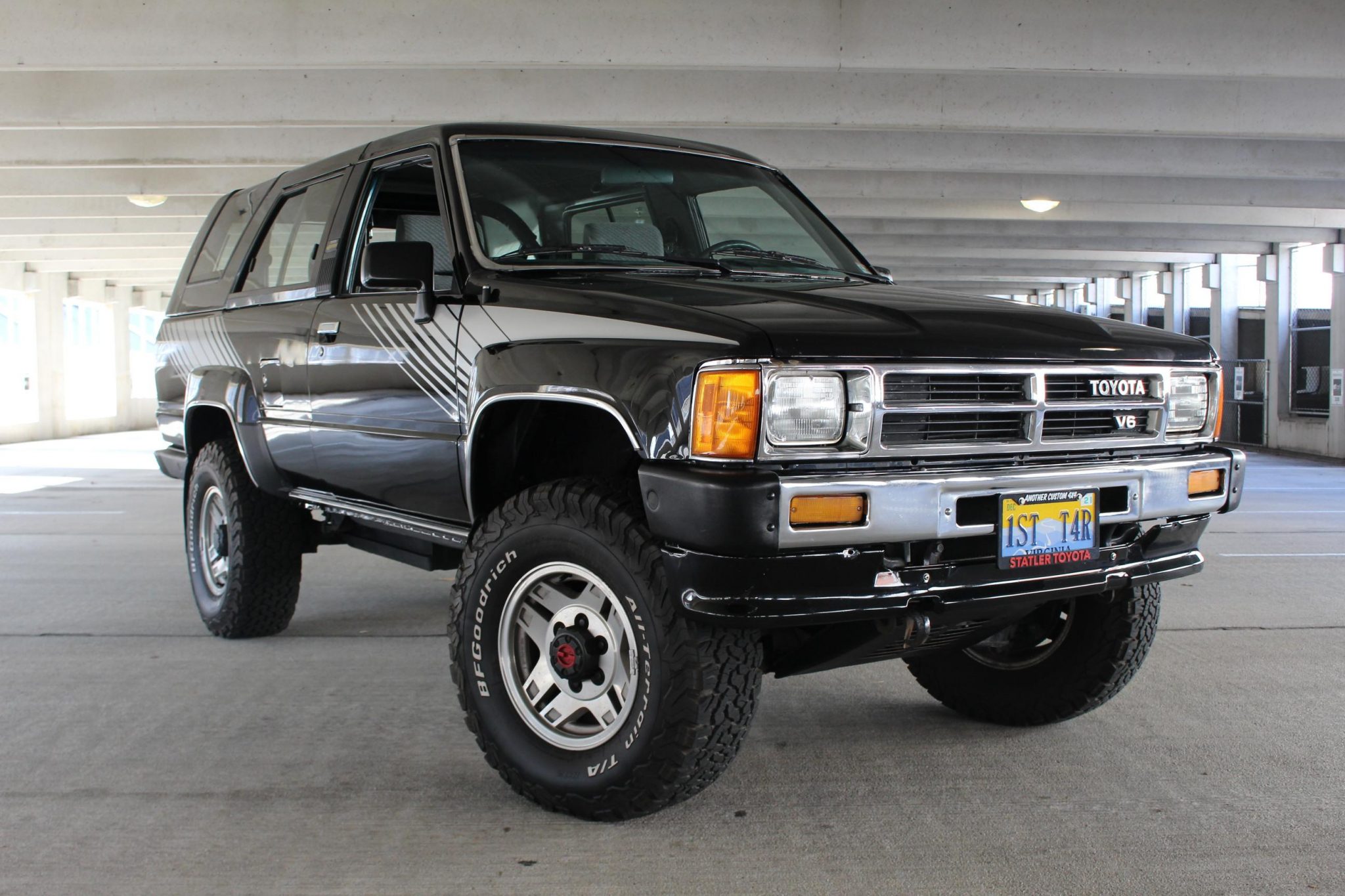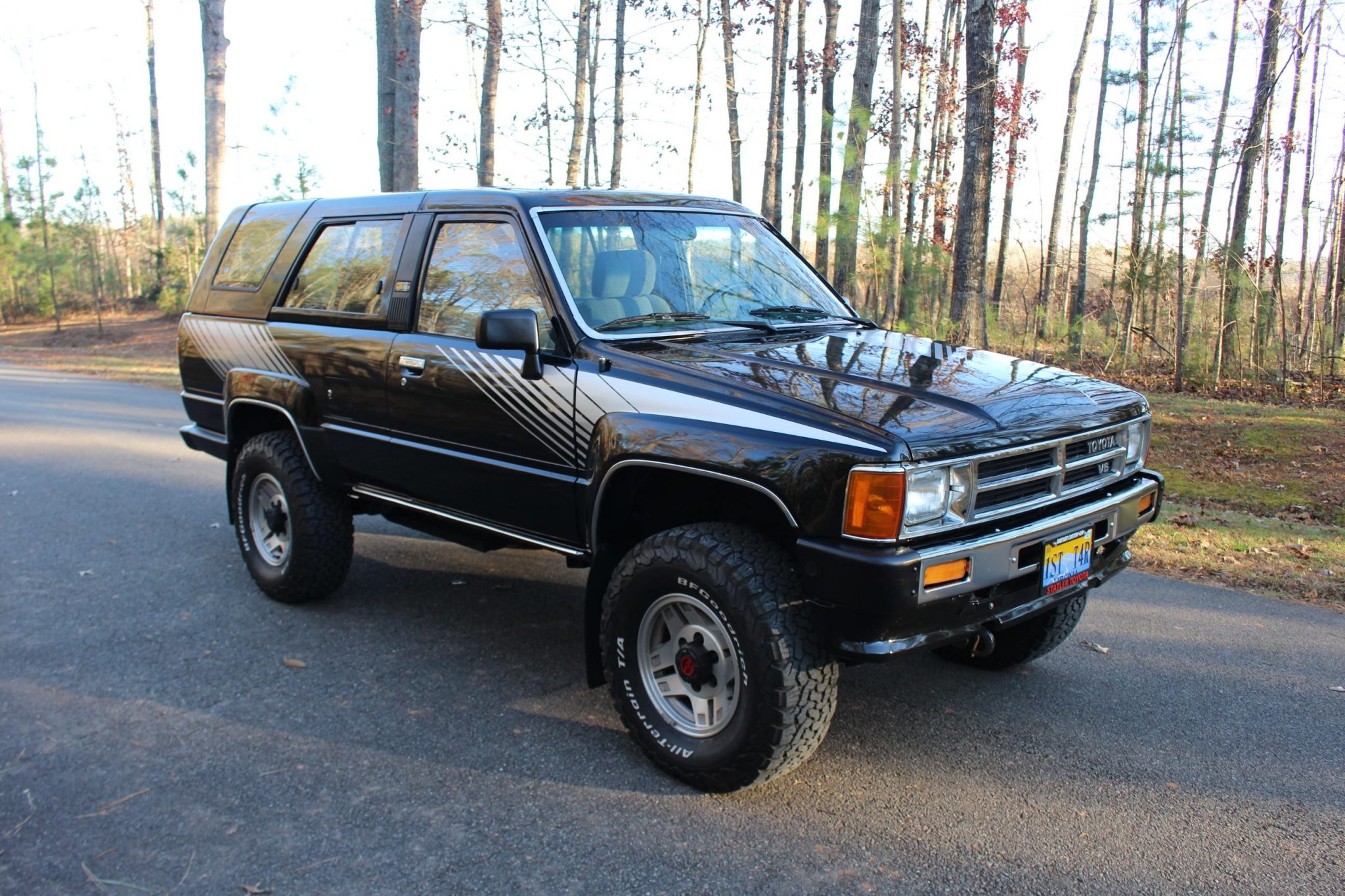 Factory 15″ alloy wheels wear 31″x10.5″ BFGoodrich All-Terrain T/A KO2 tires. A spare is mounted beneath the rear, and the truck is equipped with Aisin manually-locking front hubs.