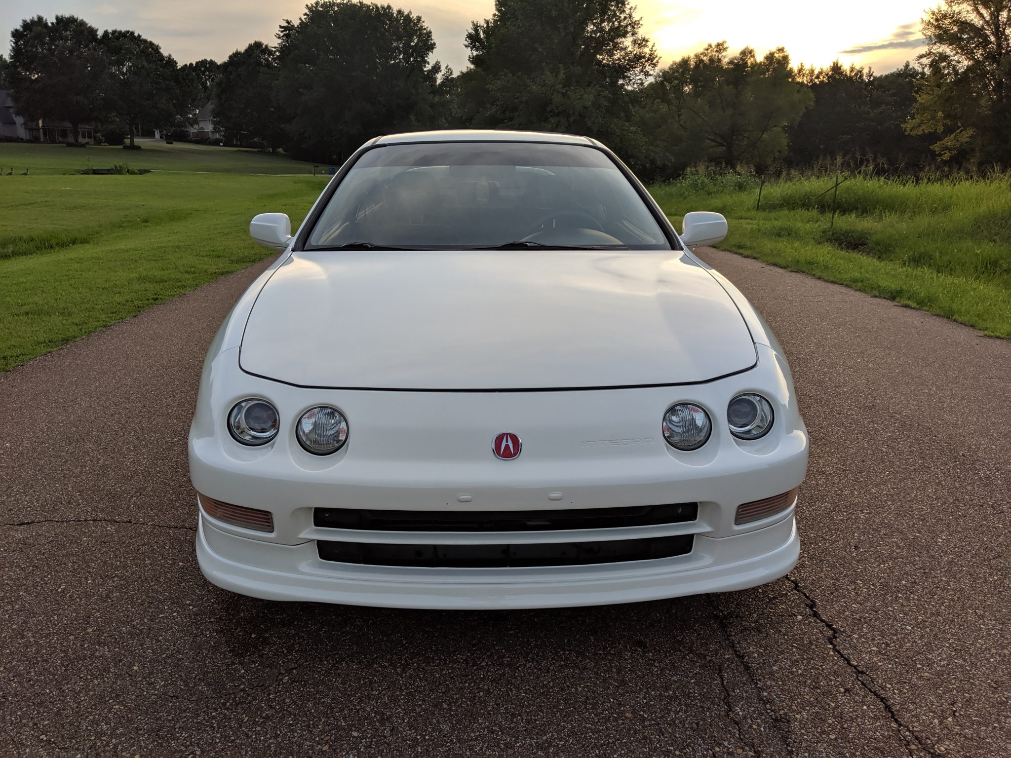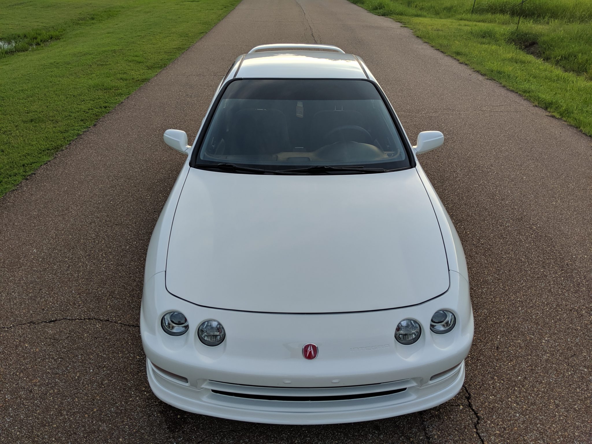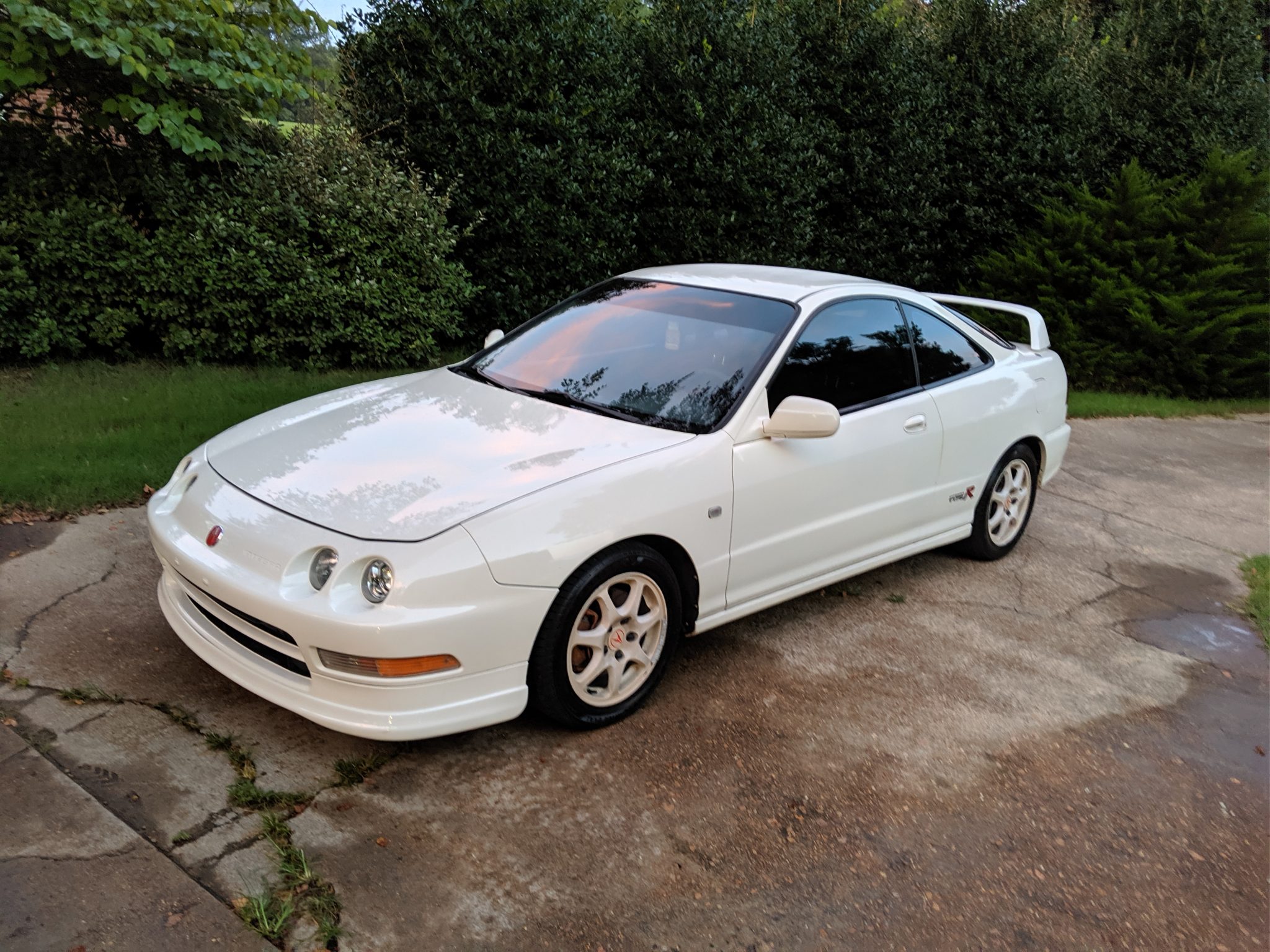 Factory 15″ alloy wheels wear red Acura center caps and were refinished by the seller. The Type R received larger-diameter disc brakes at each corner as well as a lower ride height when compared with the standard Integra.