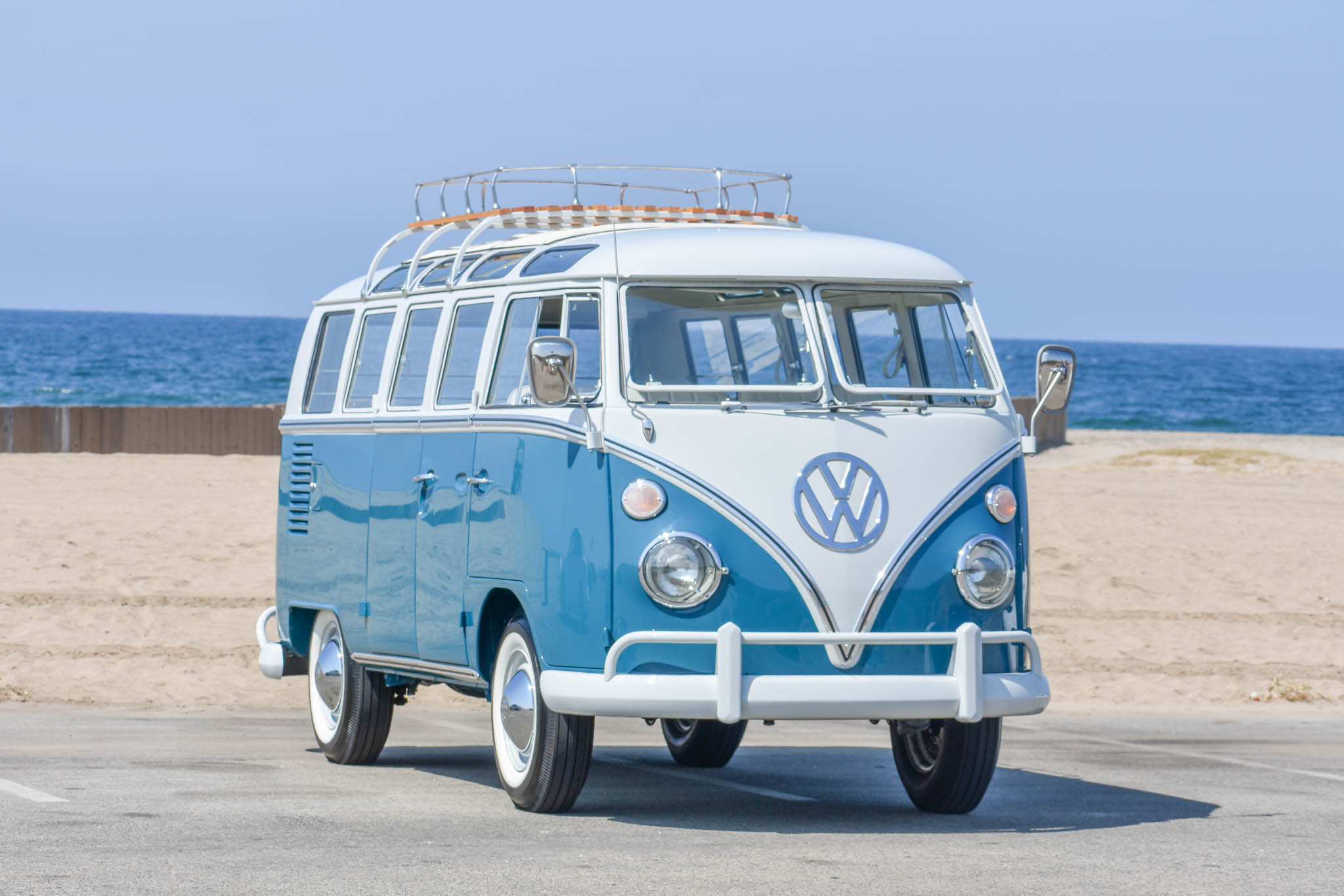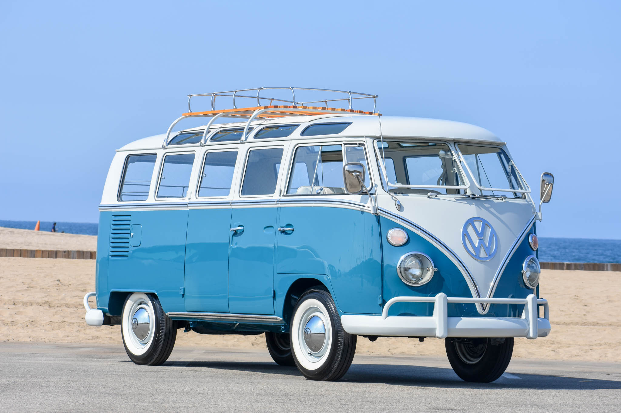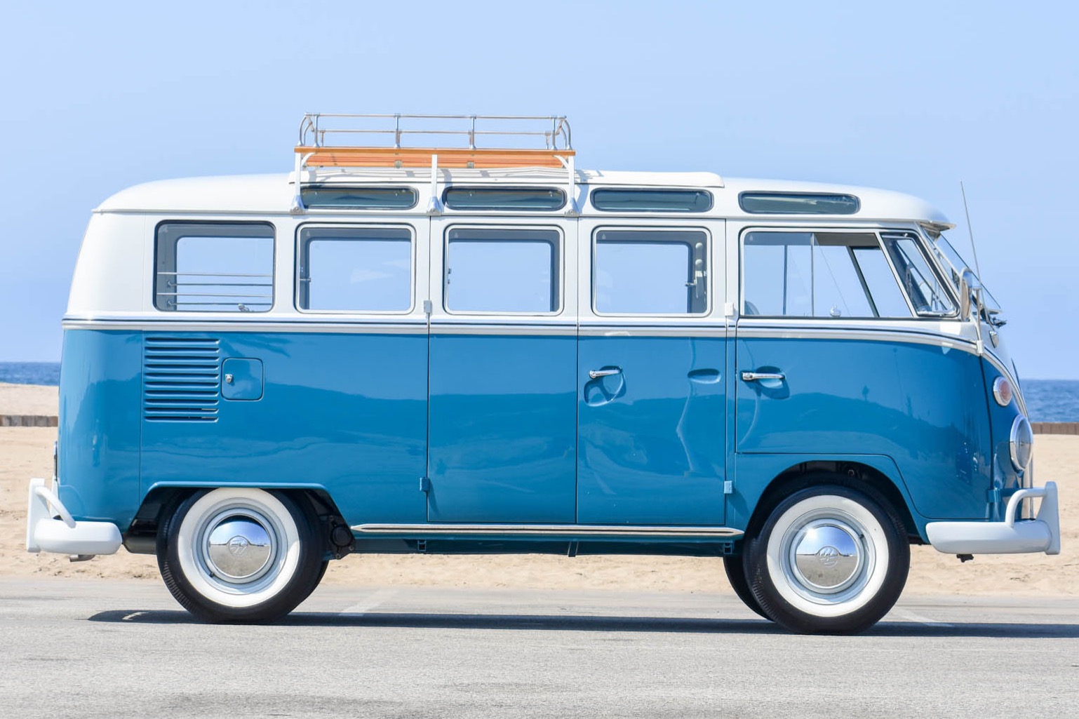 An accessory roof rack from Wolfsburg West features wooden slats, and the seller describes touch-ups near the mounts. White 14″ steel wheels wear replacement chrome hubcaps and 7.50-14 whitewall tires. The four-wheel drum brakes received a new master cylinder and lines during the initial project, and the front wheel cylinders and hardware have been replaced since. New rear torsion bar bushings have also been fitted to alleviate a clunk during gear changes.