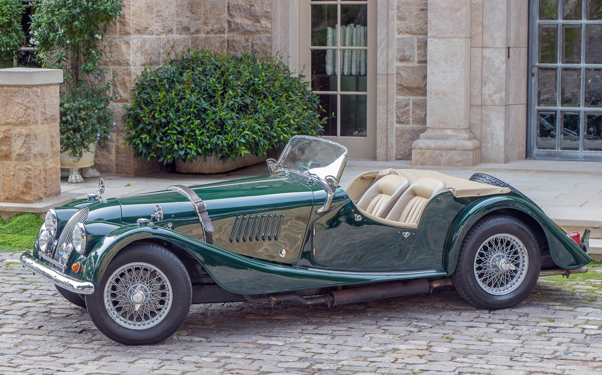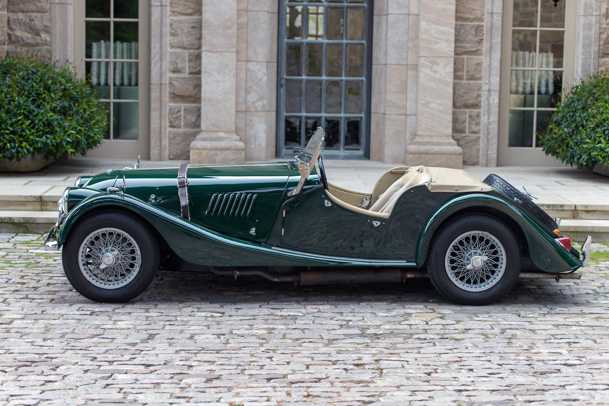 15″ chrome wire wheels feature knock-offs and wear 165/80 Nexen SB802 tires. Equipment includes a rear-mounted full-size spare and front disc brakes. The right rear wheel cylinder was repaired in 2020.