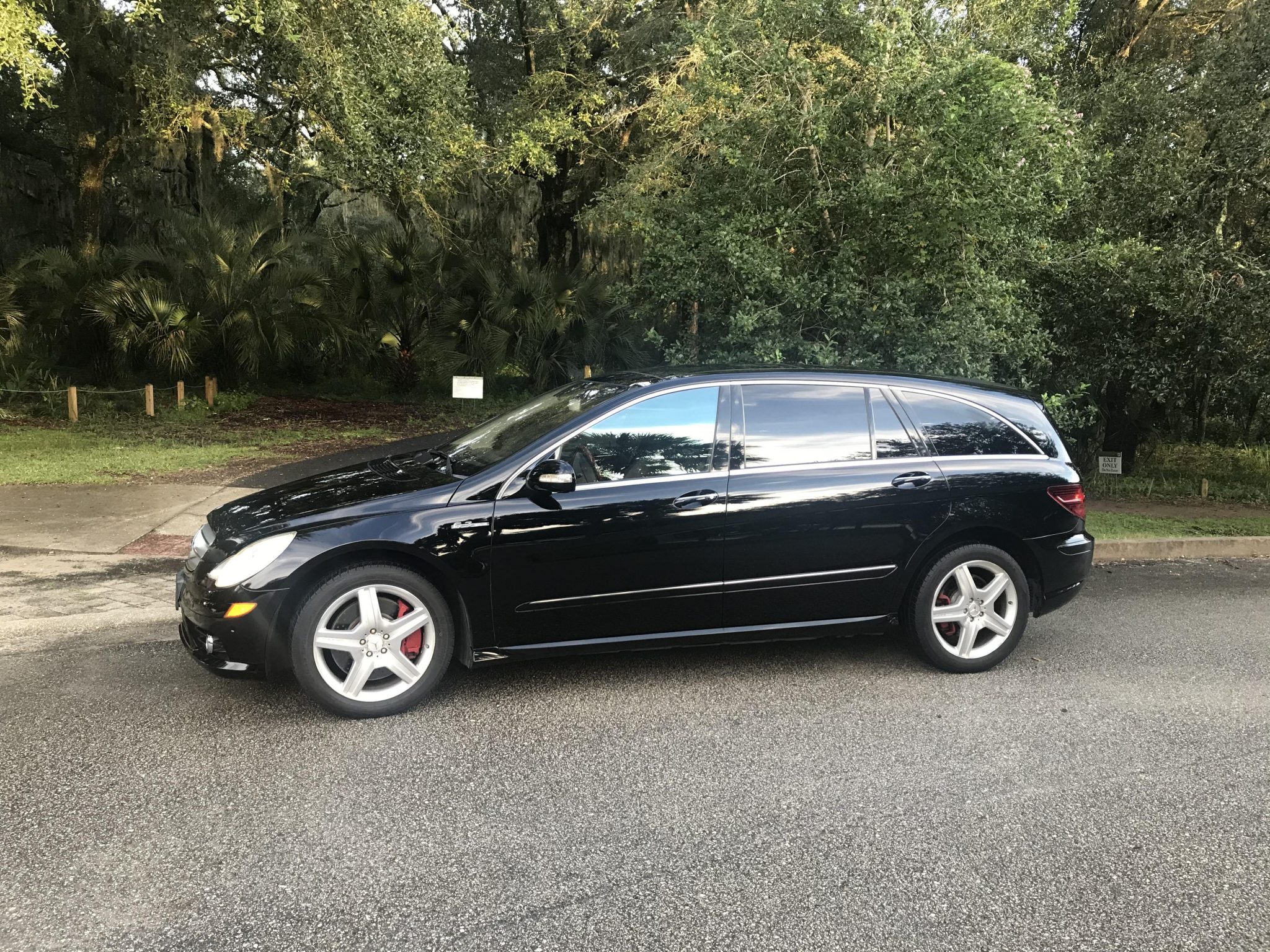 Five-spoke 20″ AMG wheels wear Nankang Cross Sport SP-9 tires. The air suspension system was serviced with replacement front struts in February 2015, and the brake pads and rotors were replaced by the seller. Curb rash is present on the wheels.