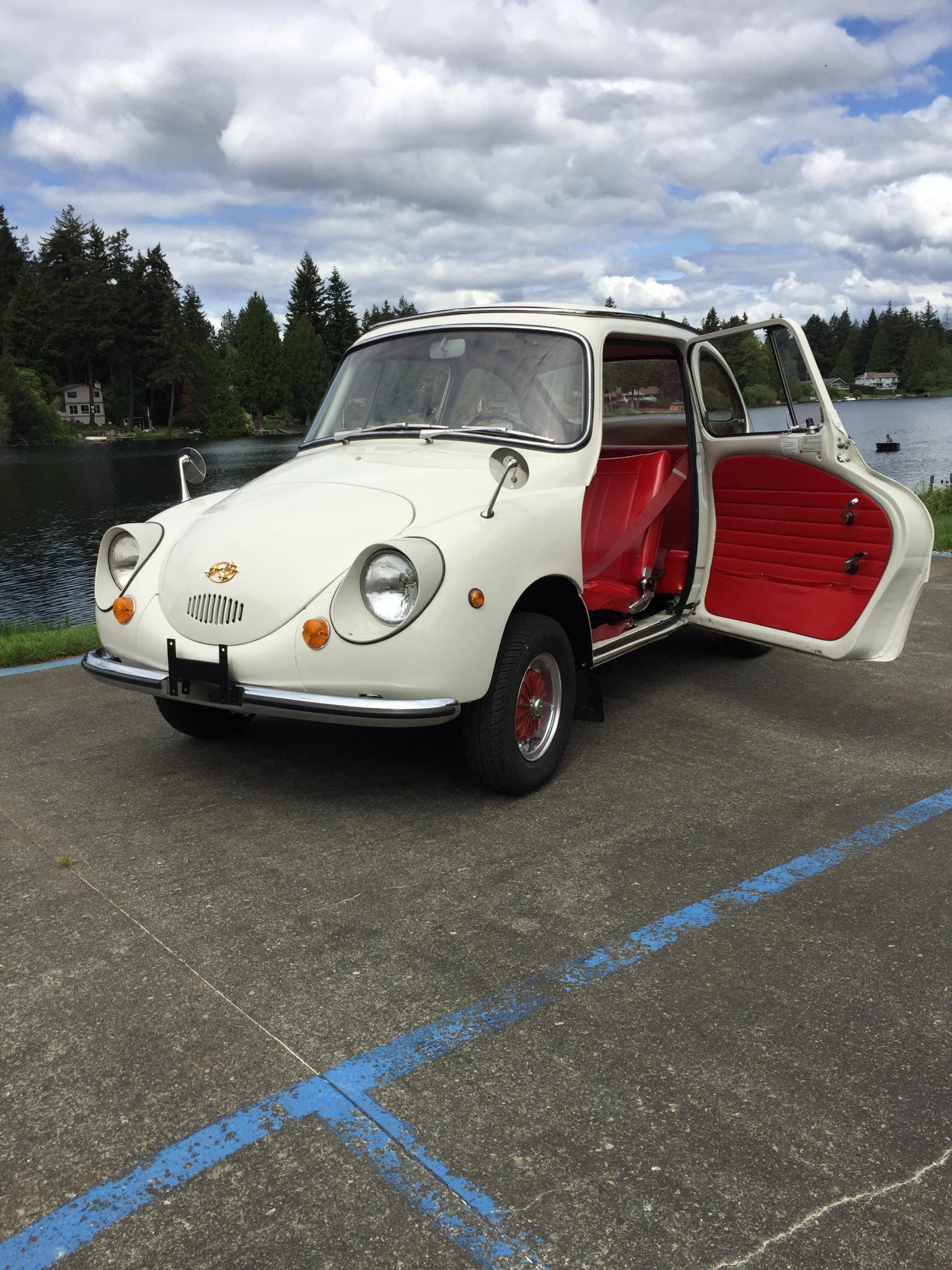 The car is equipped with rear-hinged doors, dual fender mirrors, and painted steel 10″ wheels that are bolted directly to the finned brake drums, which were turned and repainted red by the seller. The front wheel bearings are also said to have been replaced. 145/80 Kumho Power Star 758 tires are mounted at all four corners. A set of stock hubcaps is included in the sale.