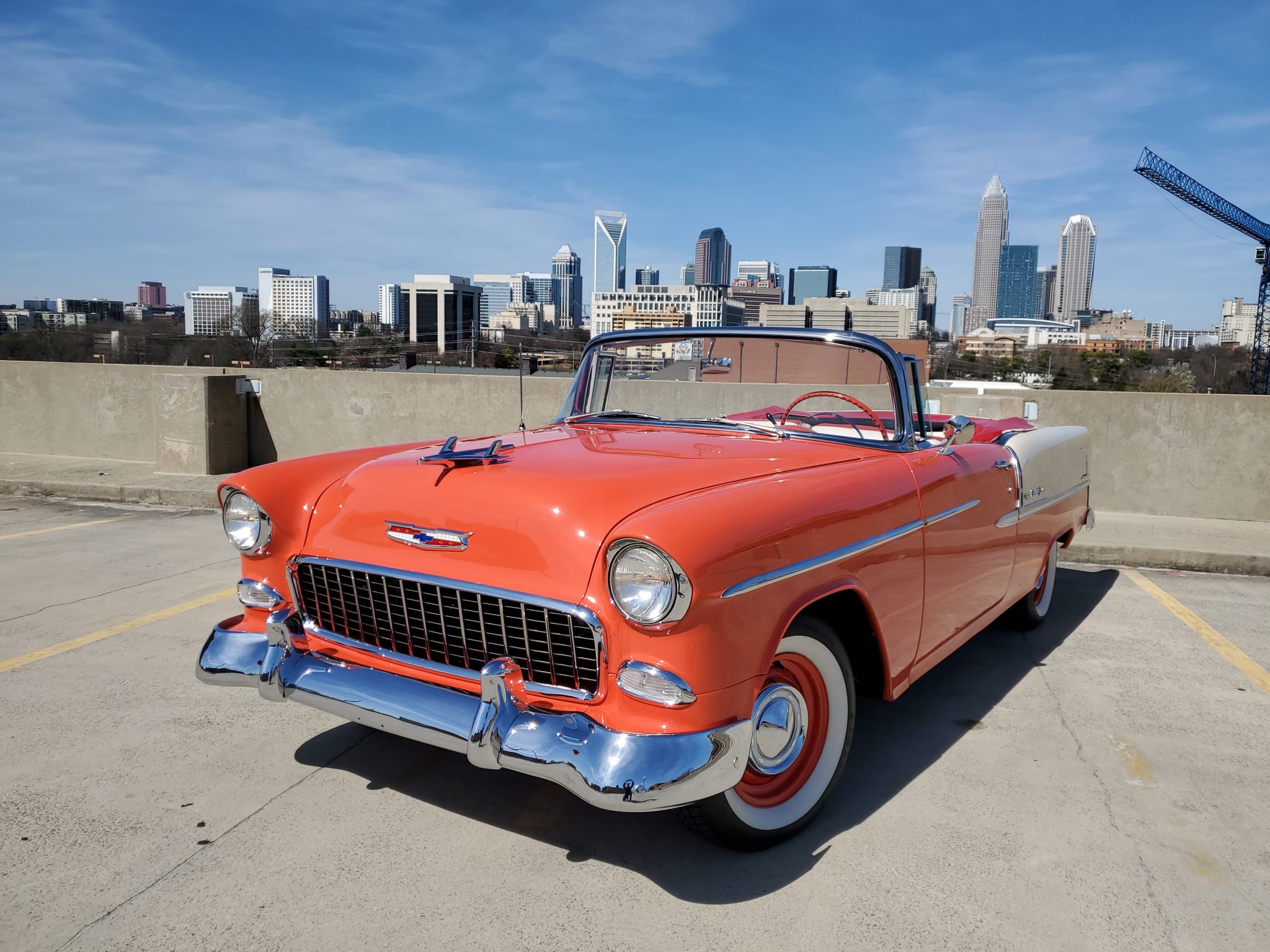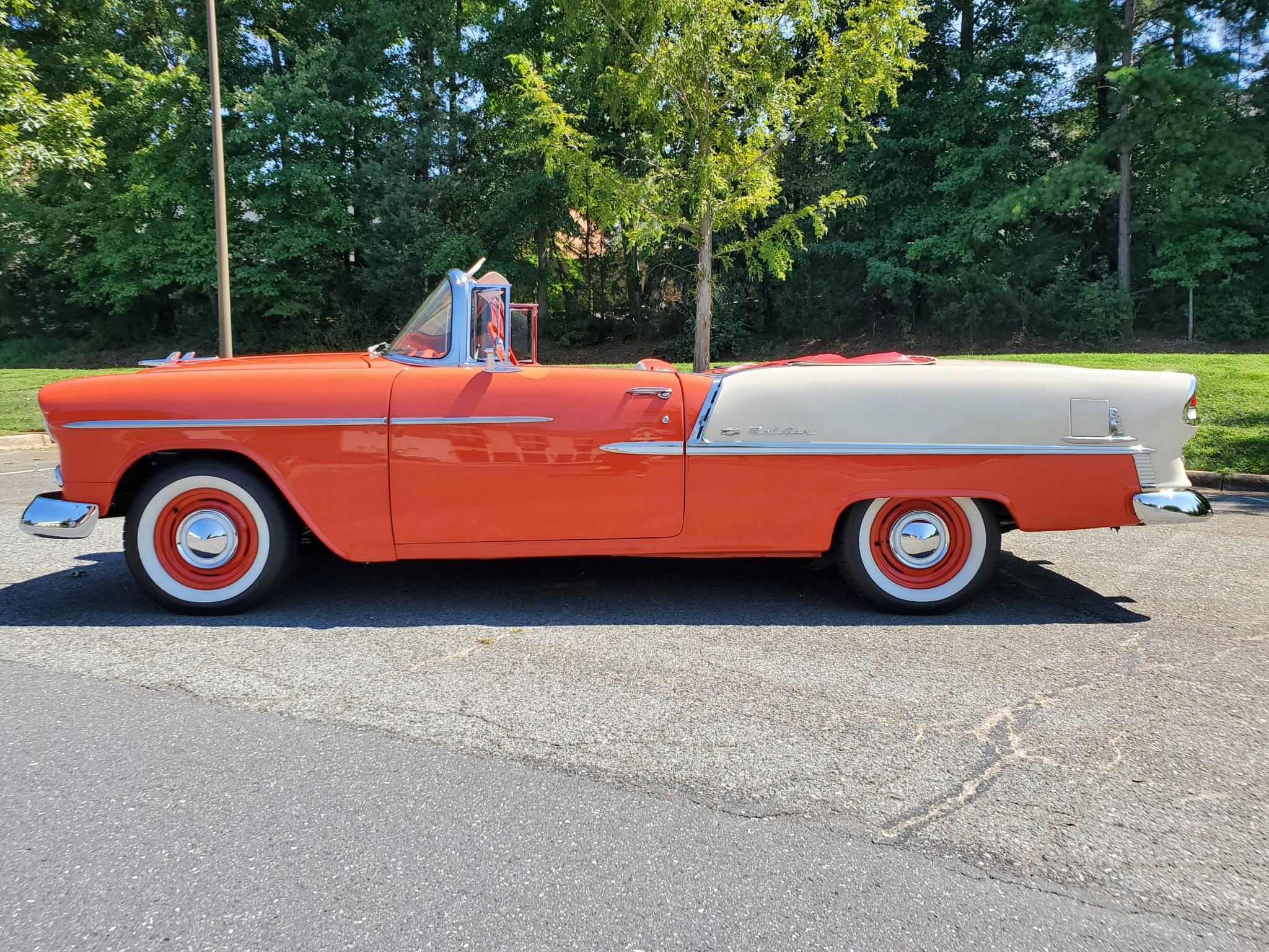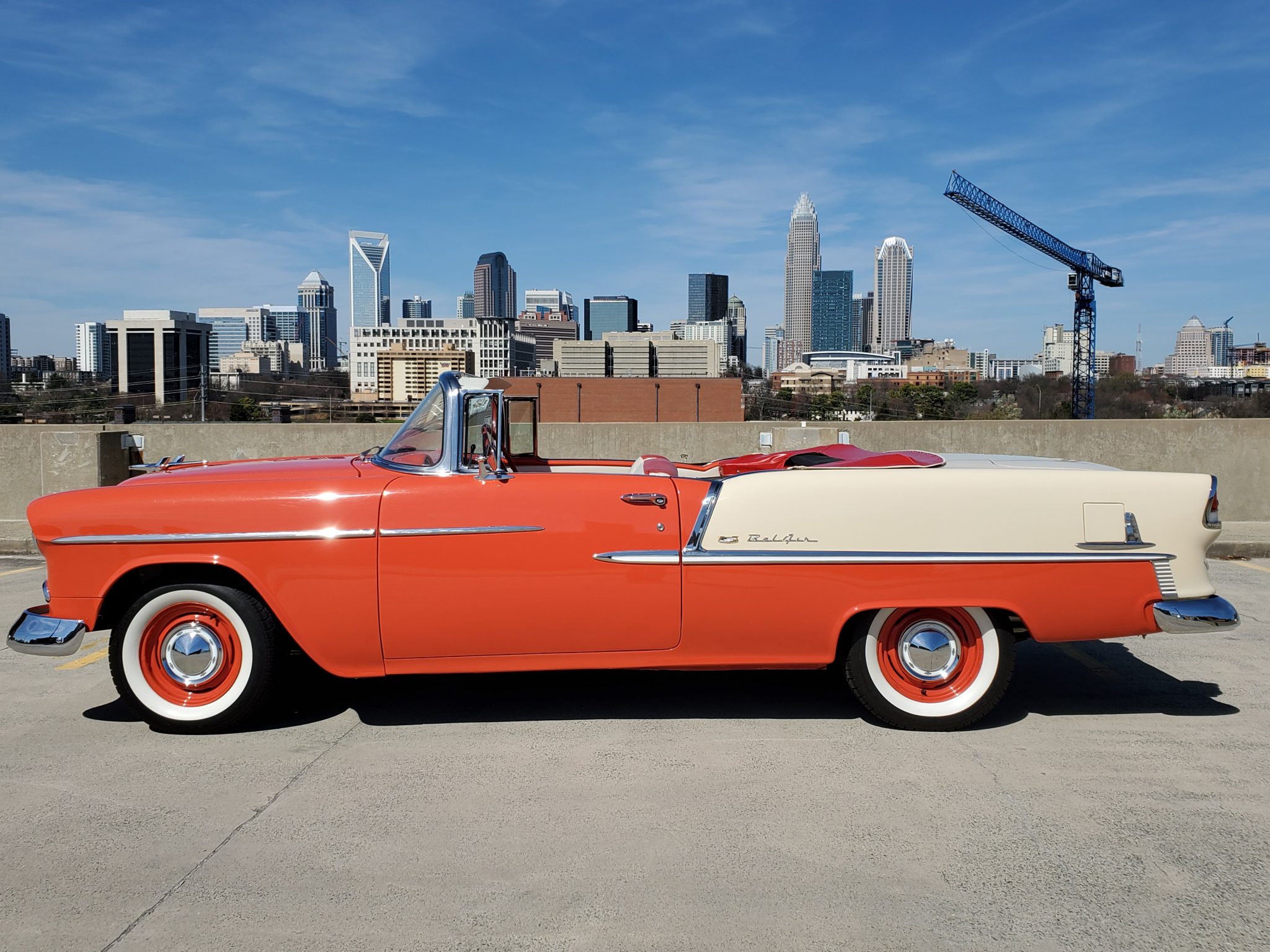 Painted 15″ steel wheels are equipped with Chevrolet-branded covers and are mounted with 205/75 BFGoodrich Silvertown Radial wide whitewall tires. A full-size spare is housed within the trunk, and a complete set of stock full-size Bel Air wheel covers are included in the sale.