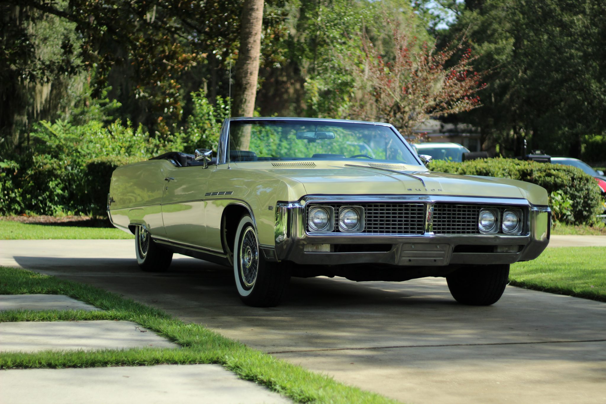 Steel wheels wear full Buick faux-wire covers and 15″ American Classic whitewall tires. The trunk-mounted spare is protected by a worn cover.