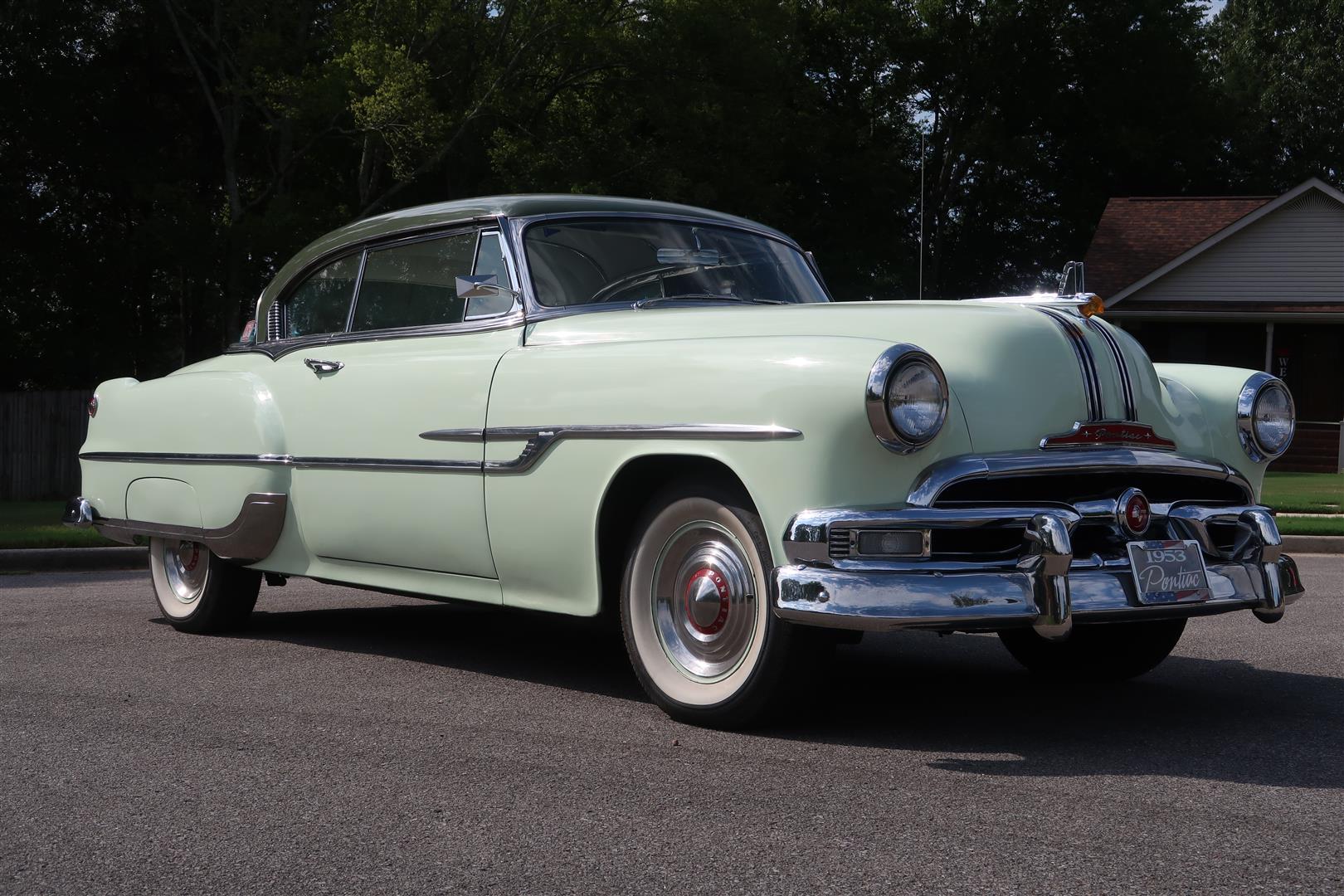 Body-color 15″ steel wheels feature full polished covers with red Pontiac logo center rings and wear 215/75 whitewall tires. This Chieftain features power steering and power brakes and reportedly received new shocks and suspension bushings during current ownership.
