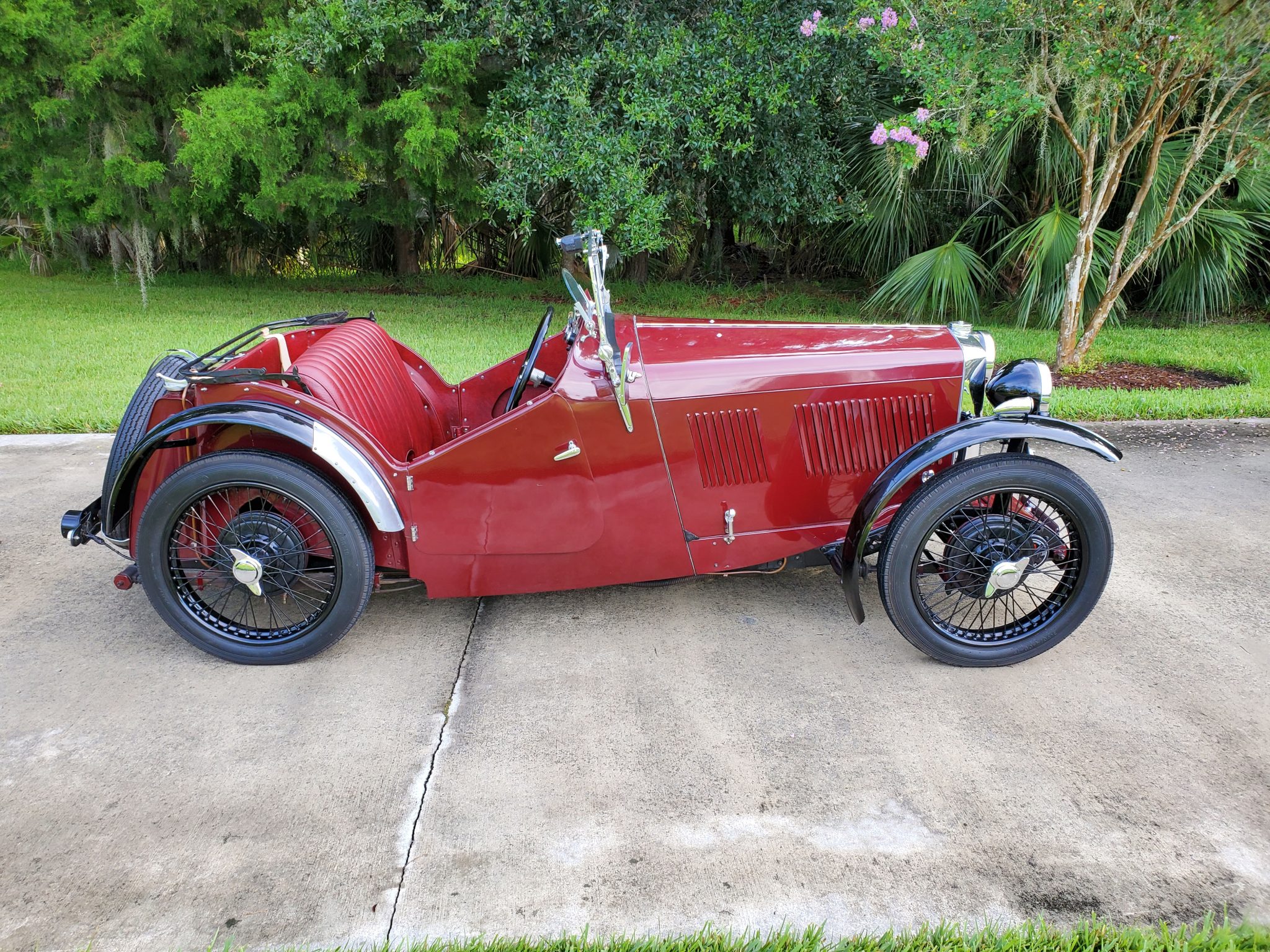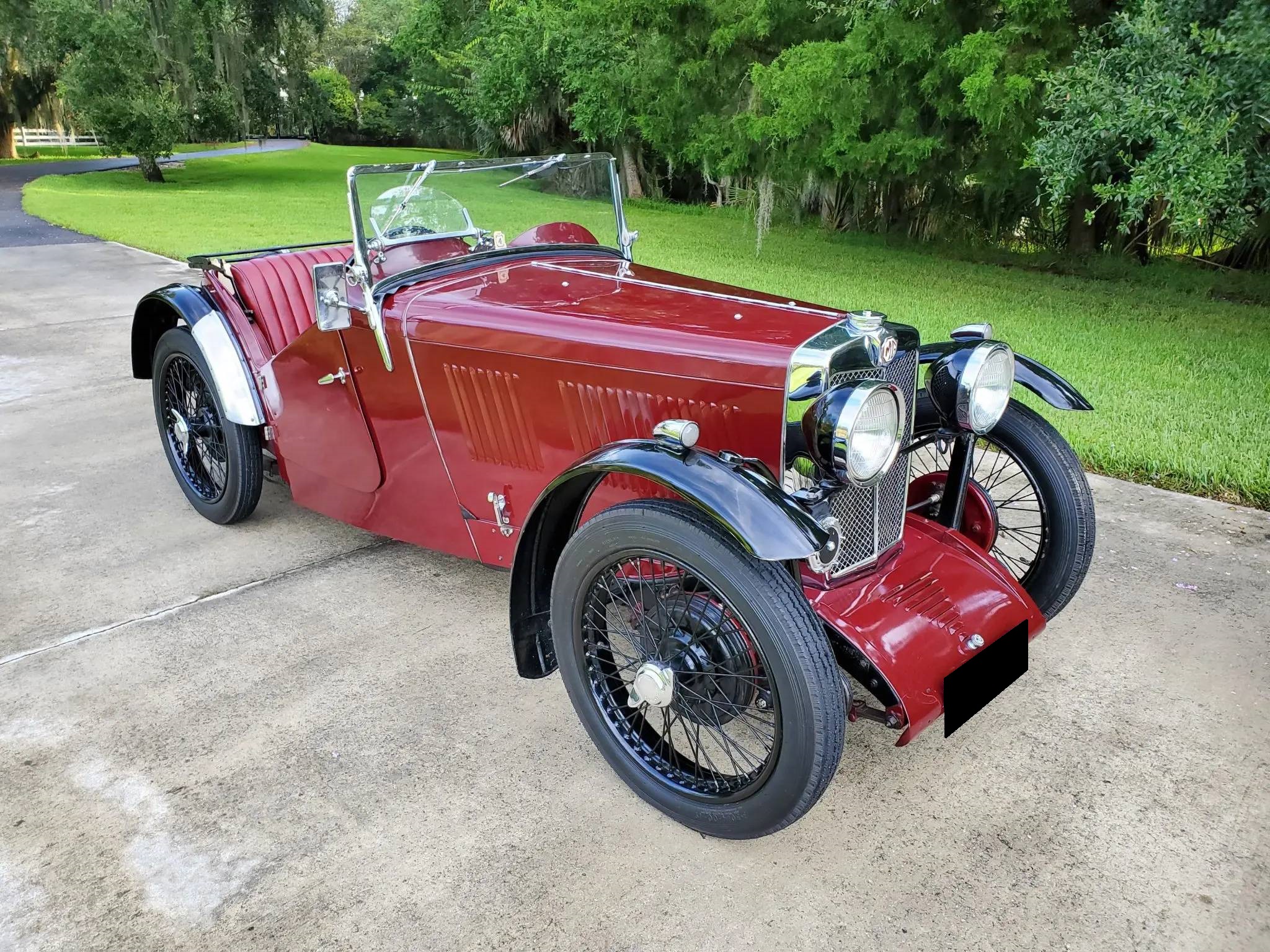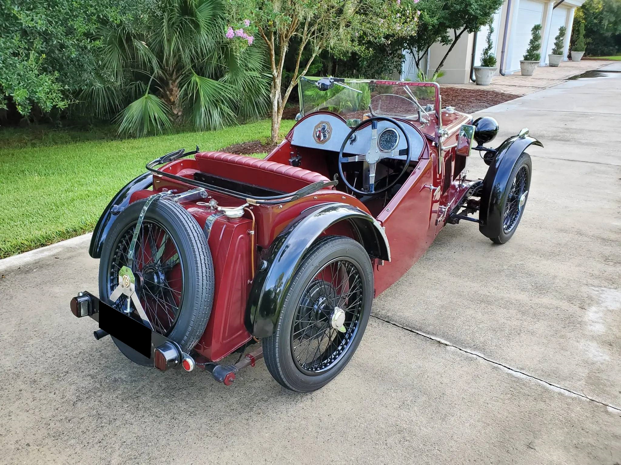 Black-painted wire wheels are secured with two-eared knock-offs and wear 4.00-19″ Dunlop tires. A matching spare is mounted at the rear. Updates during prior ownership include a conversion to hydraulic brakes, which were serviced by the seller. The black soft top is said to fit improperly due to the installation of the supplementary windscreen and is shown in the photo gallery below. Side curtains are not included.