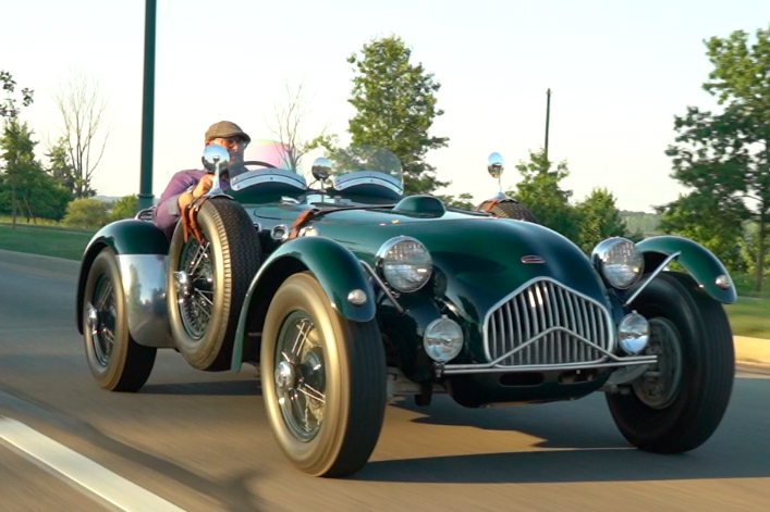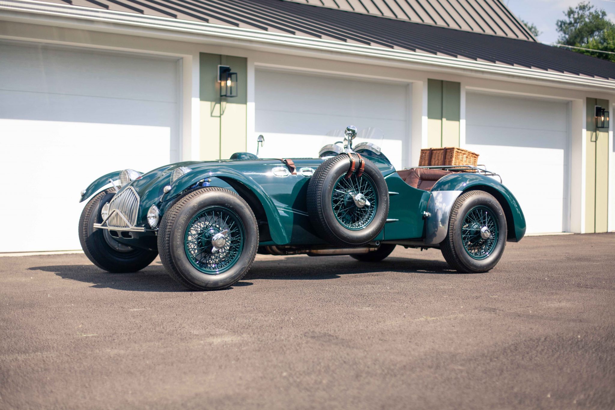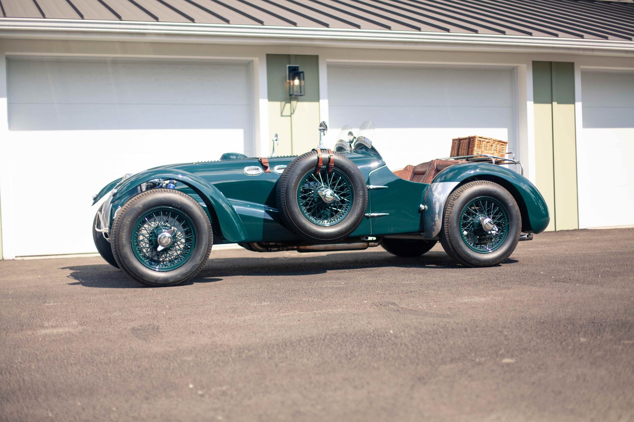 Body-colored knock-off wire wheels wear period-style Dunlop Racing 6.00L-16 bias-ply tires. Matching spares are mounted on either side of the body. The hydraulic brake system utilizes Alfin-style drums, which are mounted inboard at the rear. The J2 featured a front swing axle, a de Dion tube rear axle, and coil springs at all four corners.