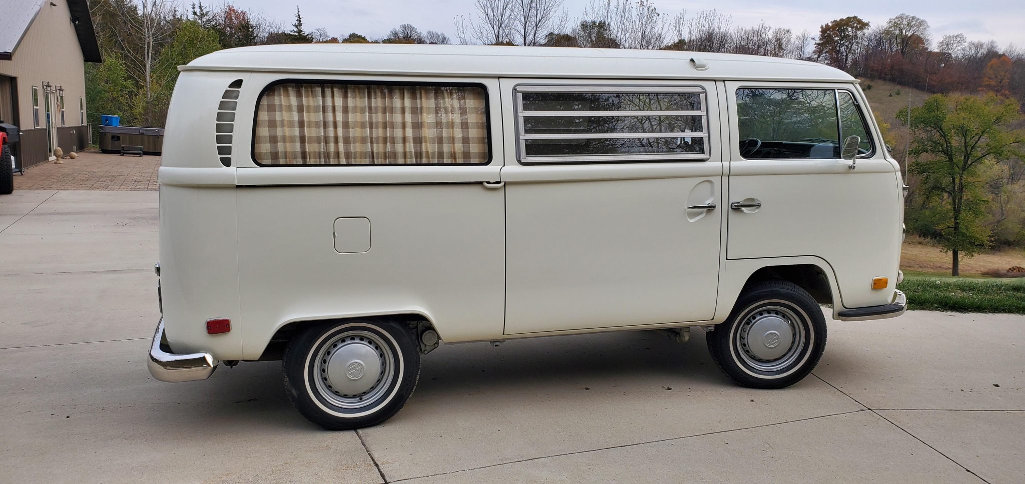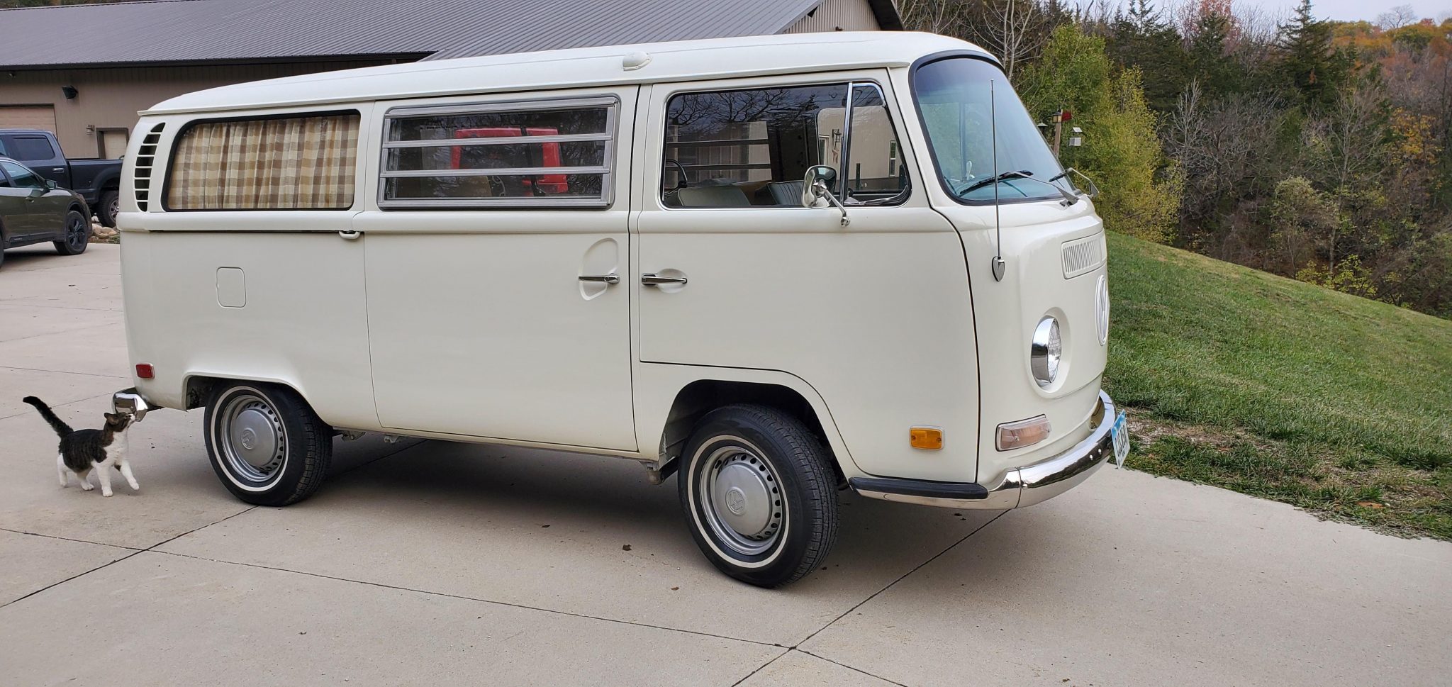 Silver-painted 14″ steel wheels wear VW hubcaps and Hankook Optimo H724 tires that measure 205/75. Braking is handled by front discs and rear drums.